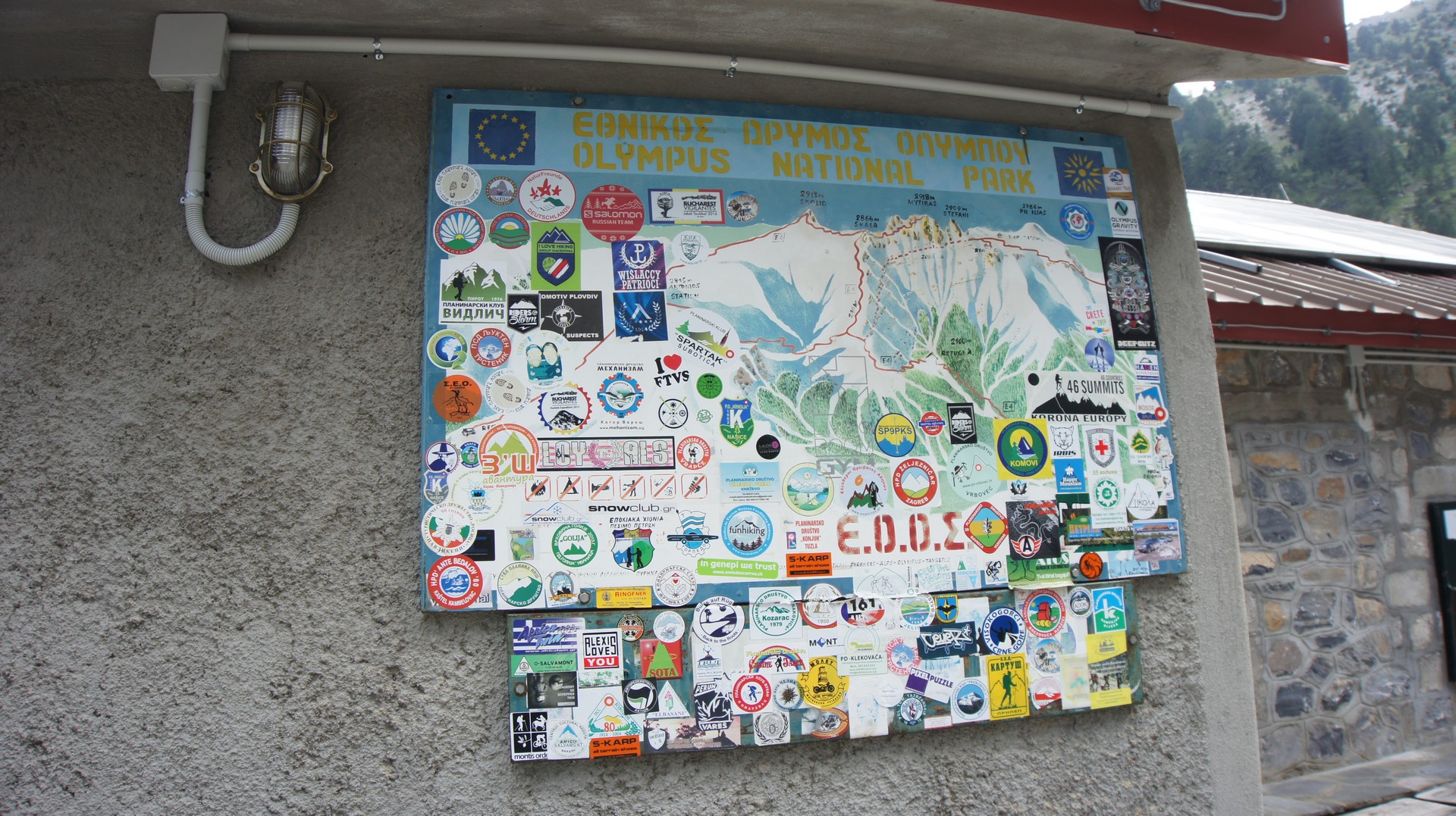 올림포스 산장 벽면에 붙은 등산 안내도와 각종 산악회 표식 들