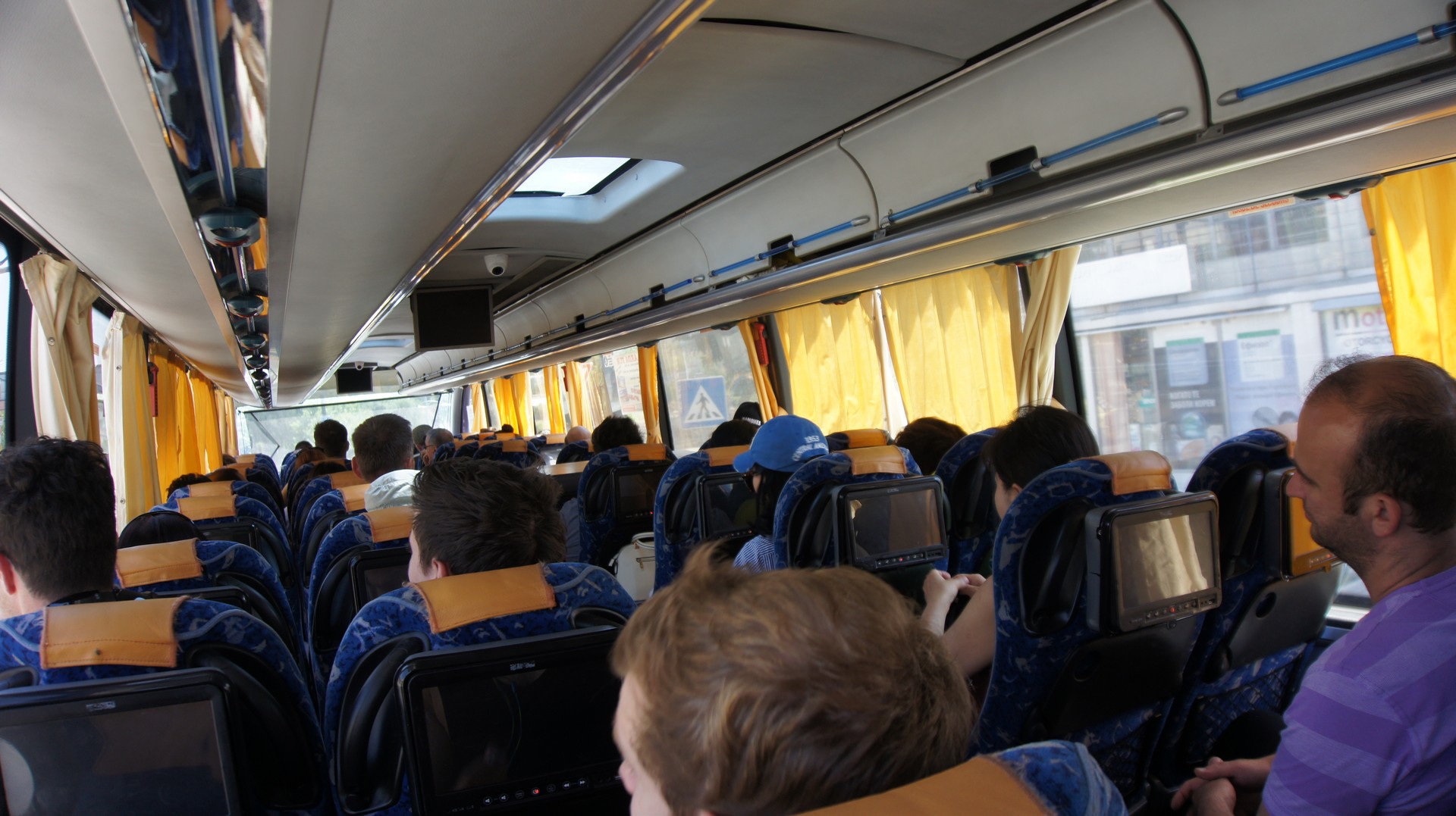 그리스로 가는 버스 내부. 관광객들로 가득 차 있었다. 앞좌석 뒤에 조그만 스크린으로 비디오 서비스도 제공된다.