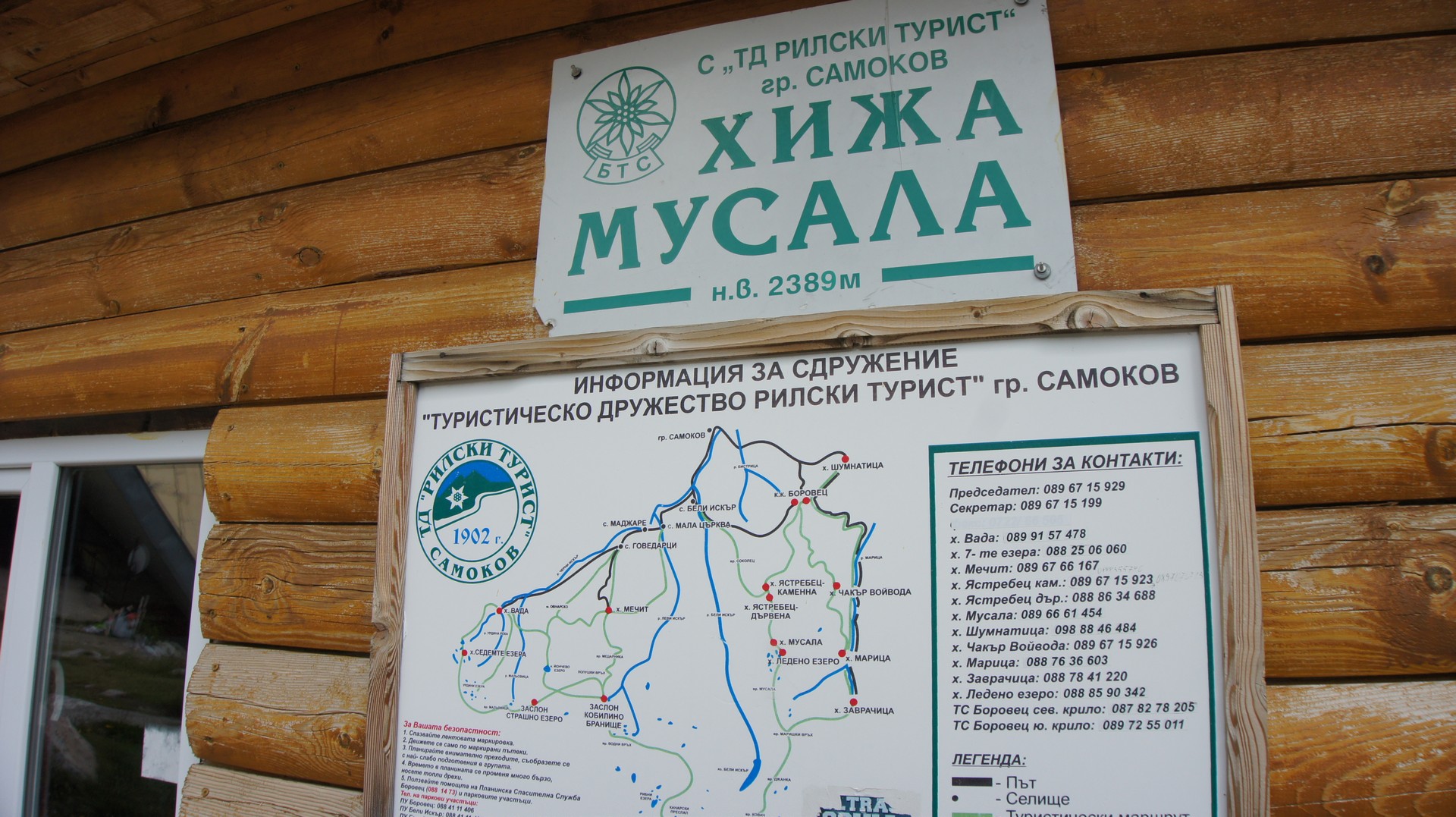 불가리아 산장에 붙은 산장 및 등산로 안내도. 영어는 없고 불가리아어로만 표기 되어 있다.