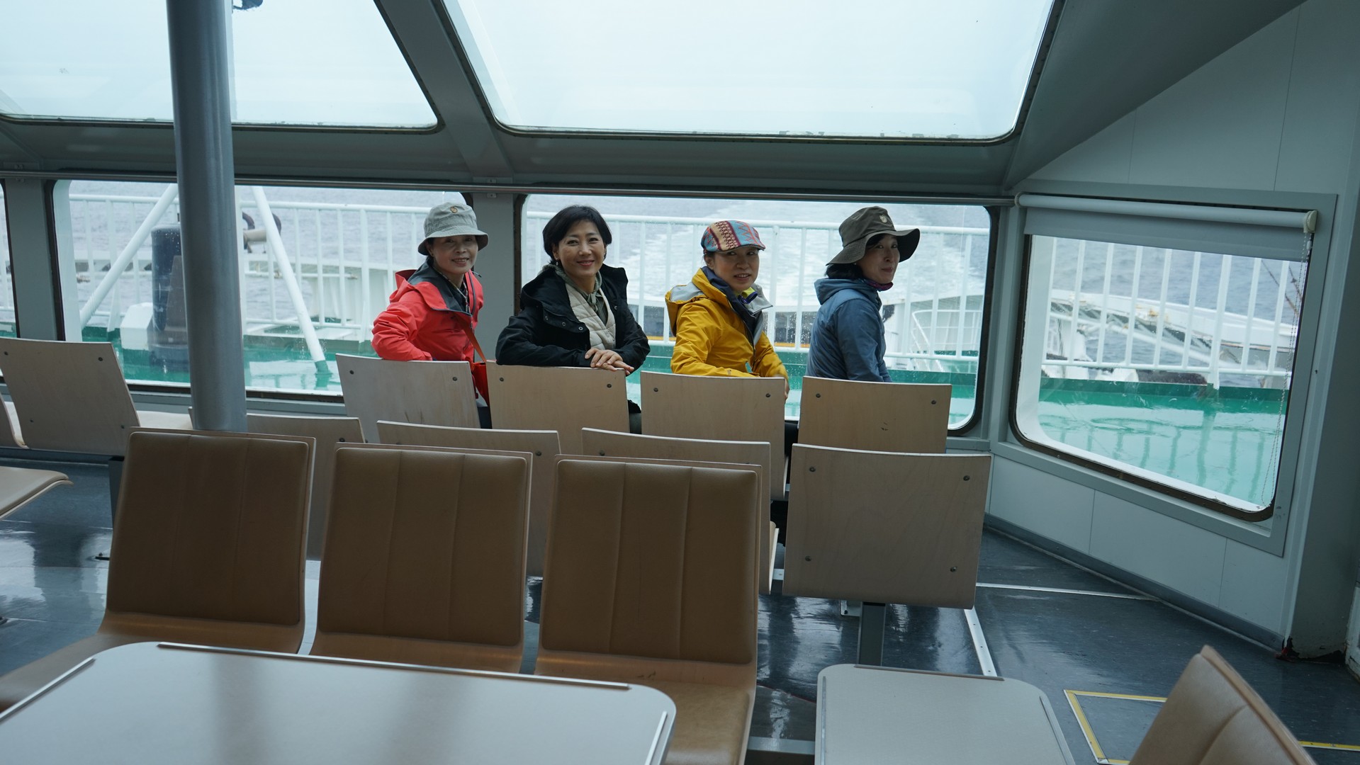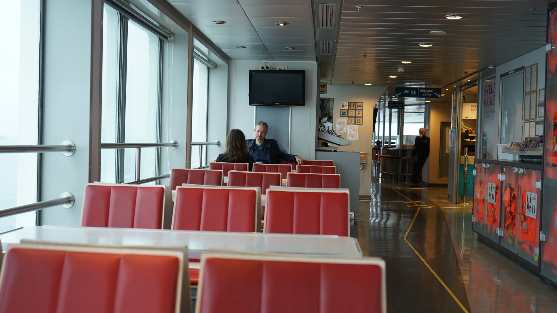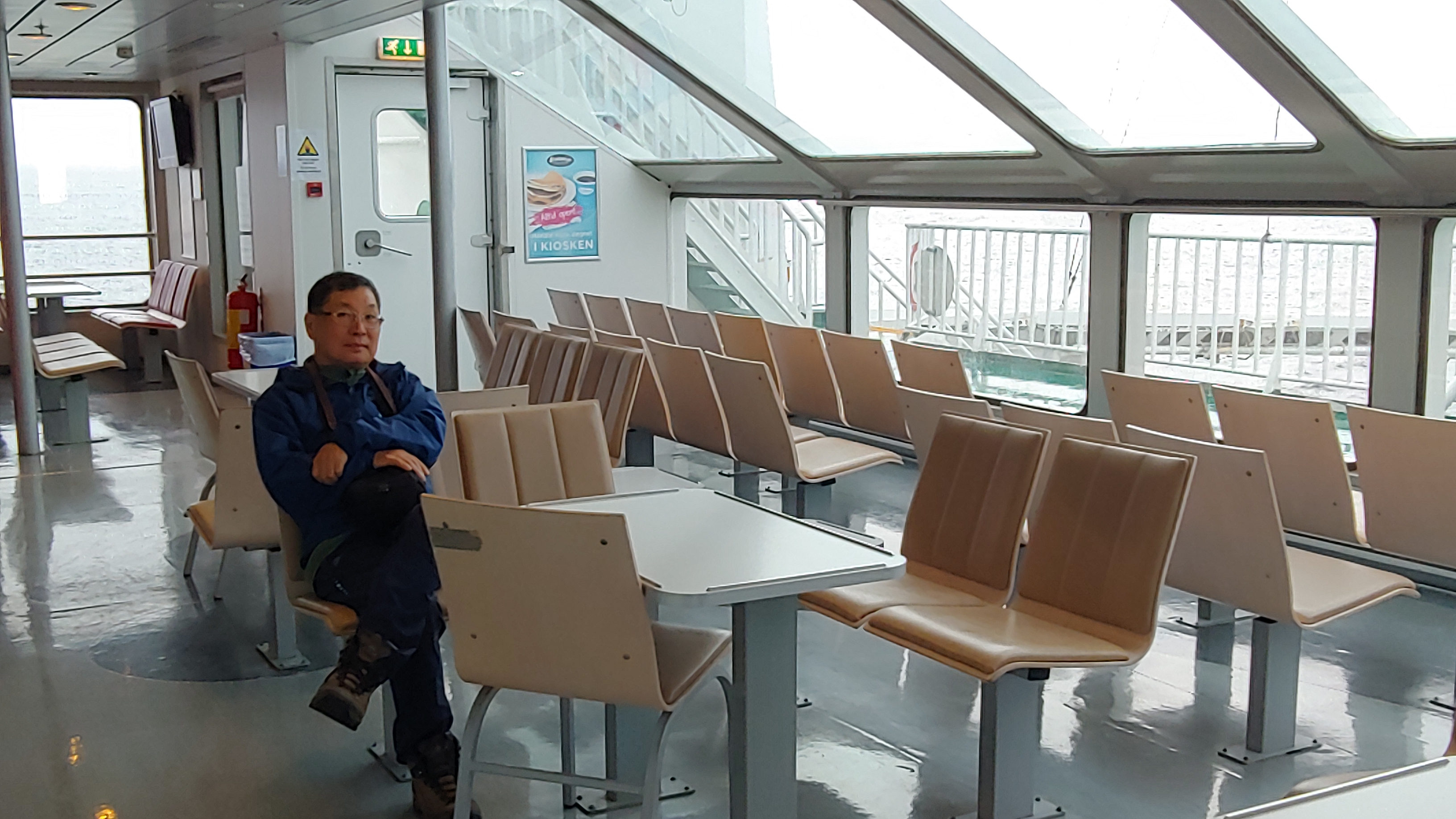스타방에르로 돌아 오는 길에 도선용 페리를 2 번 타야 한다. 차는 밑에 두고 데크로 오면 쾌적한 실내 공간. 카페도 마련되어 있다.