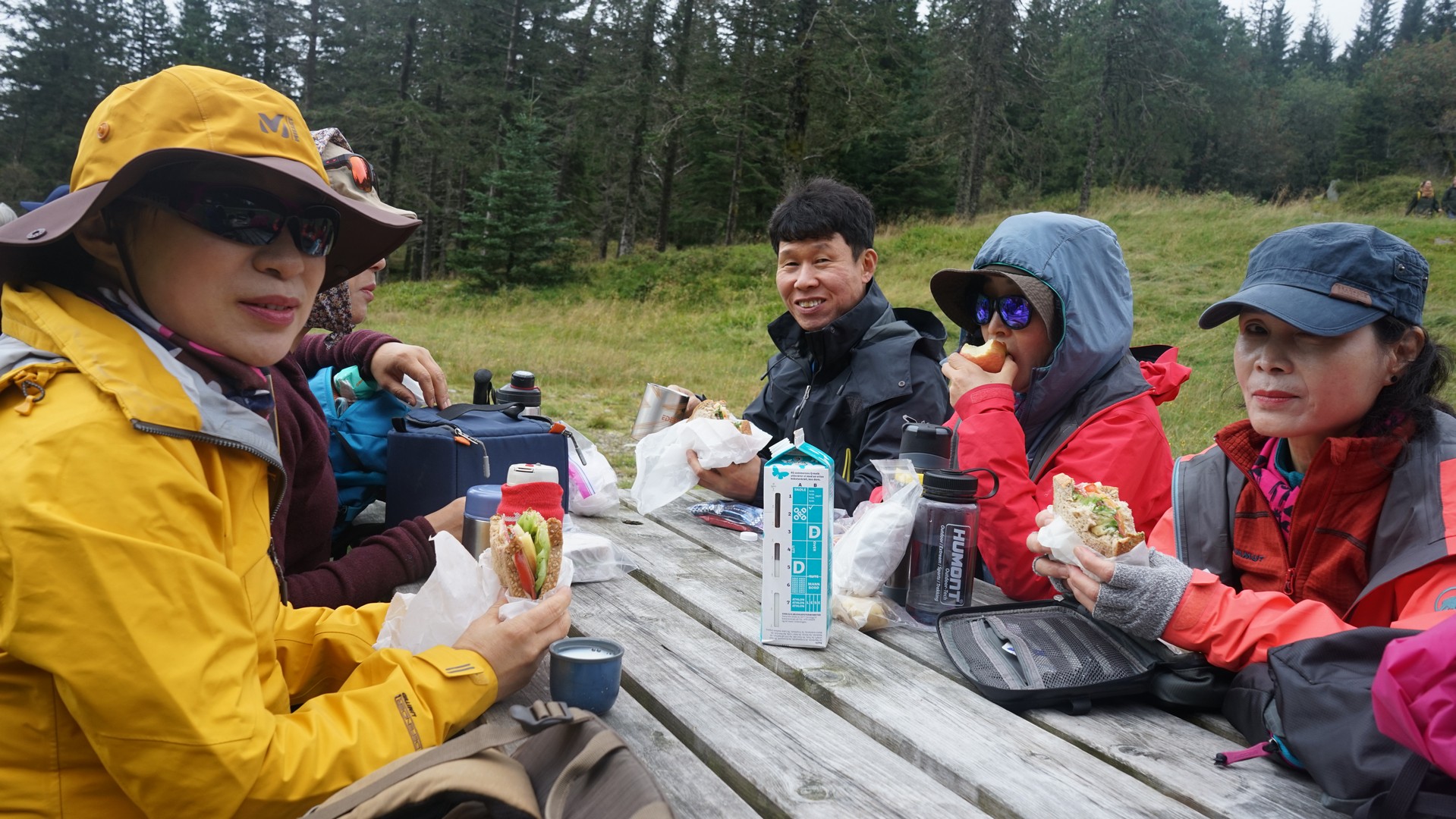 비덴 트레킹 중의 점심 식사. 치즈와 살라미 소제지, 상치 등을 넣은 샌드위치