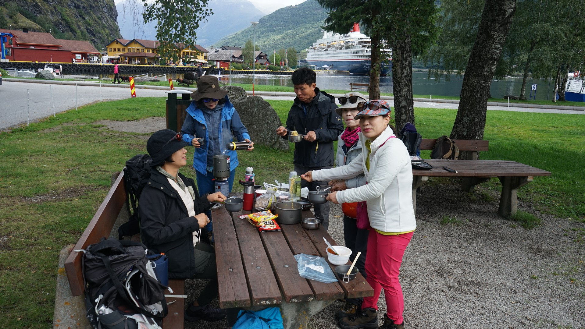 프롬의 공원에서의 점심 식사 . 라면을 버너에 끓여서..