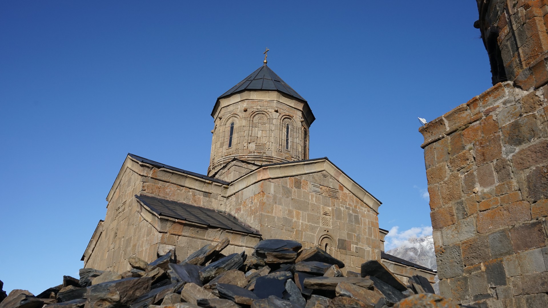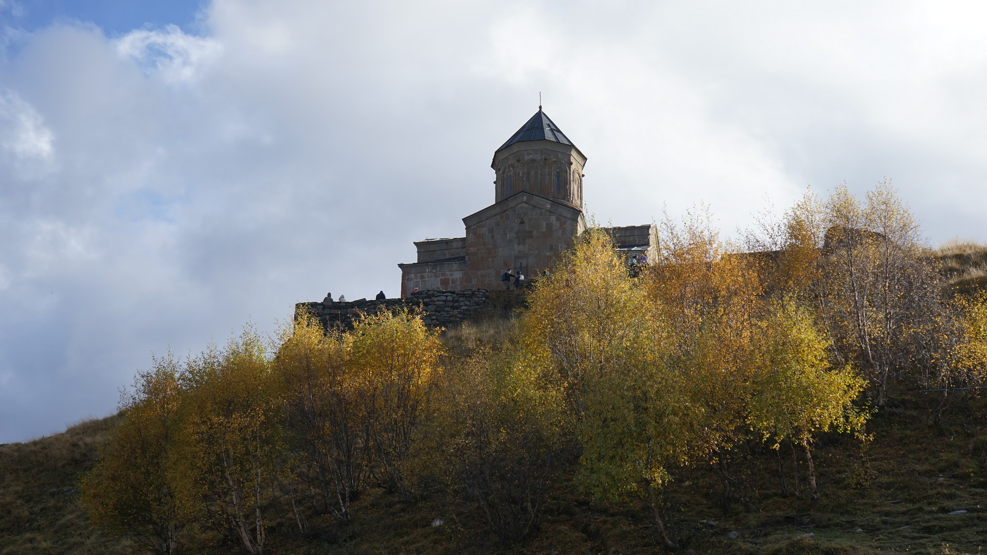 조지아 관광 가이드 책자에는 꼭 나오는 게르게티 성당. 자작 나무를 배경으로 밑에서 촬영
