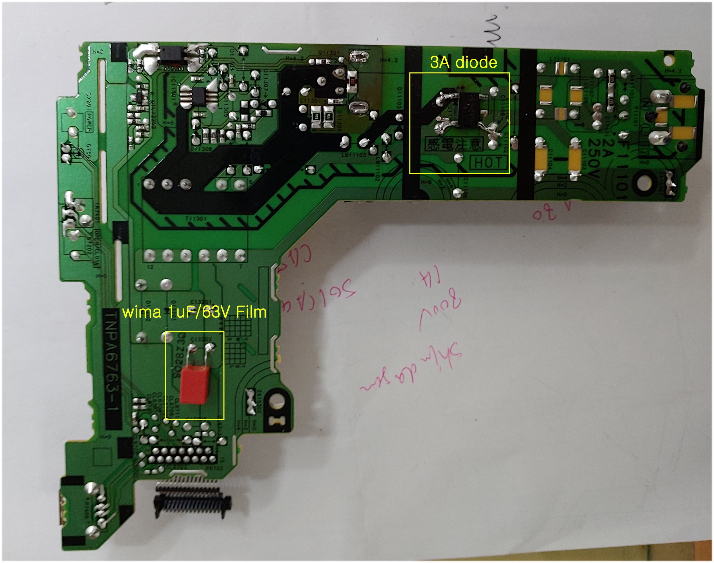수리 후 다이오드를 3 A급으로 증강시키고 평활 콘덴서 부도 오디오 그레이드급으로 격상하고 필름 콘덴서를 추가
