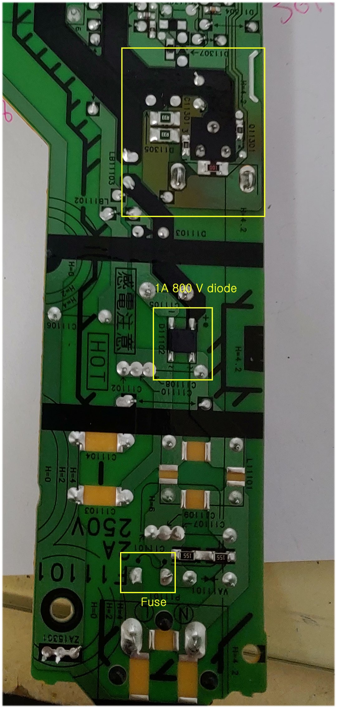 이 관찰되었습니다. 추측으로는 정류 다이오드와 다음 단에 있는 콘덴서의 정격이 다소 낮은 것을 사용하여 2 중의 하나가 견디지 못하고 기능을 상실하여 쇼트를 일으키고 이에 따라 휴즈가 나간 것으로 보입니다.