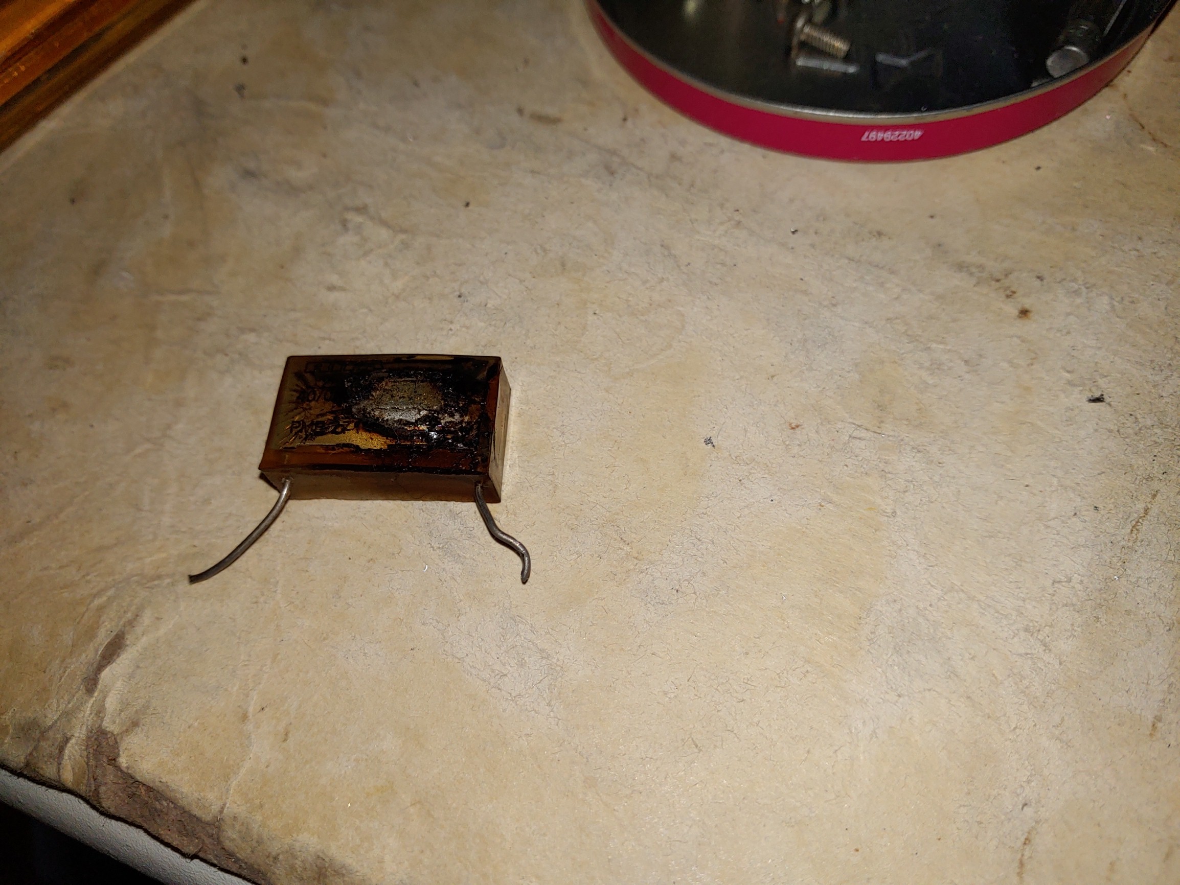 가장 흔히 보는 Rifa사의 안전 콘덴서 . 대부분이 위와 같이 터진 상태이다.