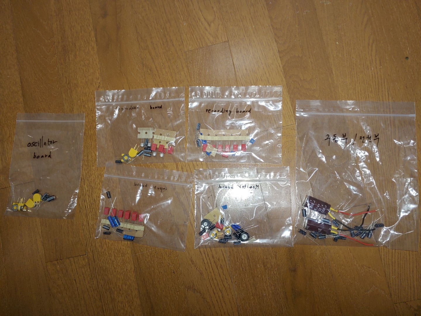 원 기판에는 지금은 거의 생산되지 않는 종형 ( Axial ) 전해 콘덴서가 사용된 부분이 있어 이 부분은 일반 콘덴서로 사용해야함 . 이 경우 리드 선 간격을 넓혀 사용하되 리드 선이 다른 부품과 닿아서 short 가 일어나지 않도록 주의 해야함.