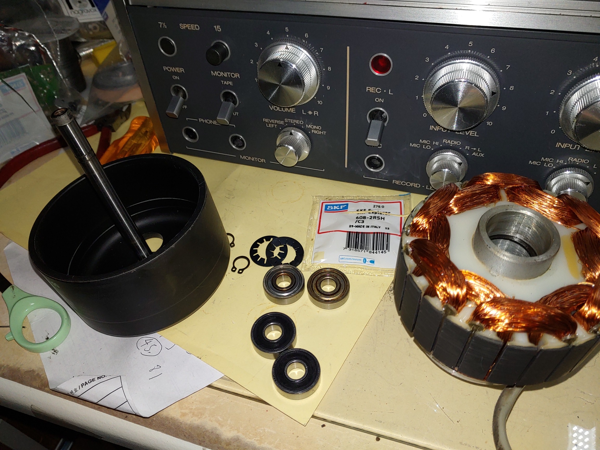 - 3 개 모터에 대한 신품 베어링으로 전량 교체 및 주유 , 3 개의 기동 AC 콘덴서 교체, 테이프 가이드 롤러를 신품 베어링으로 교체 등 메커니즘 총 정비 :25만원 .