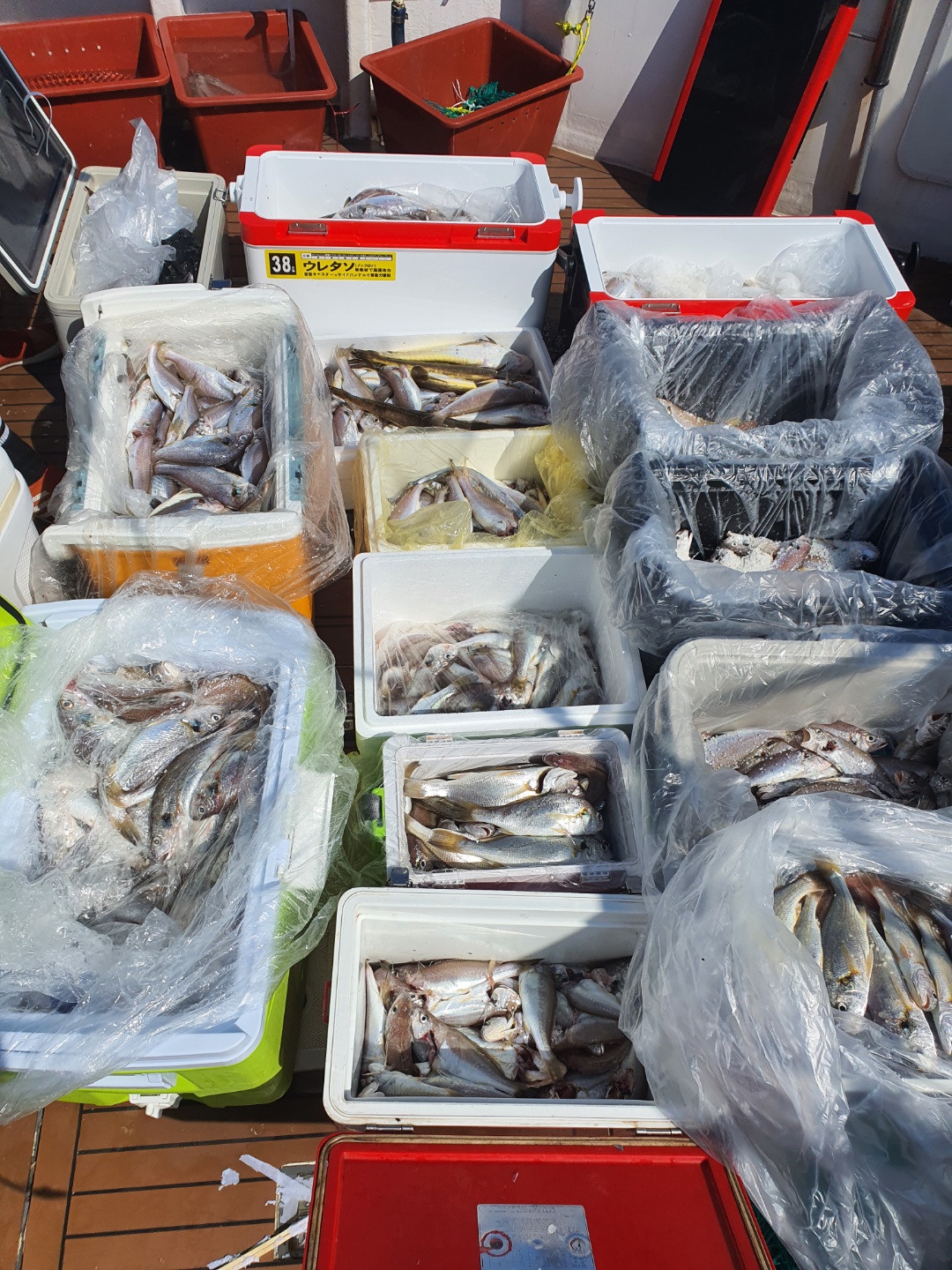 앞에 빨간 아이스 박스.. 많이 잡은 사람은 150 마리 정도.