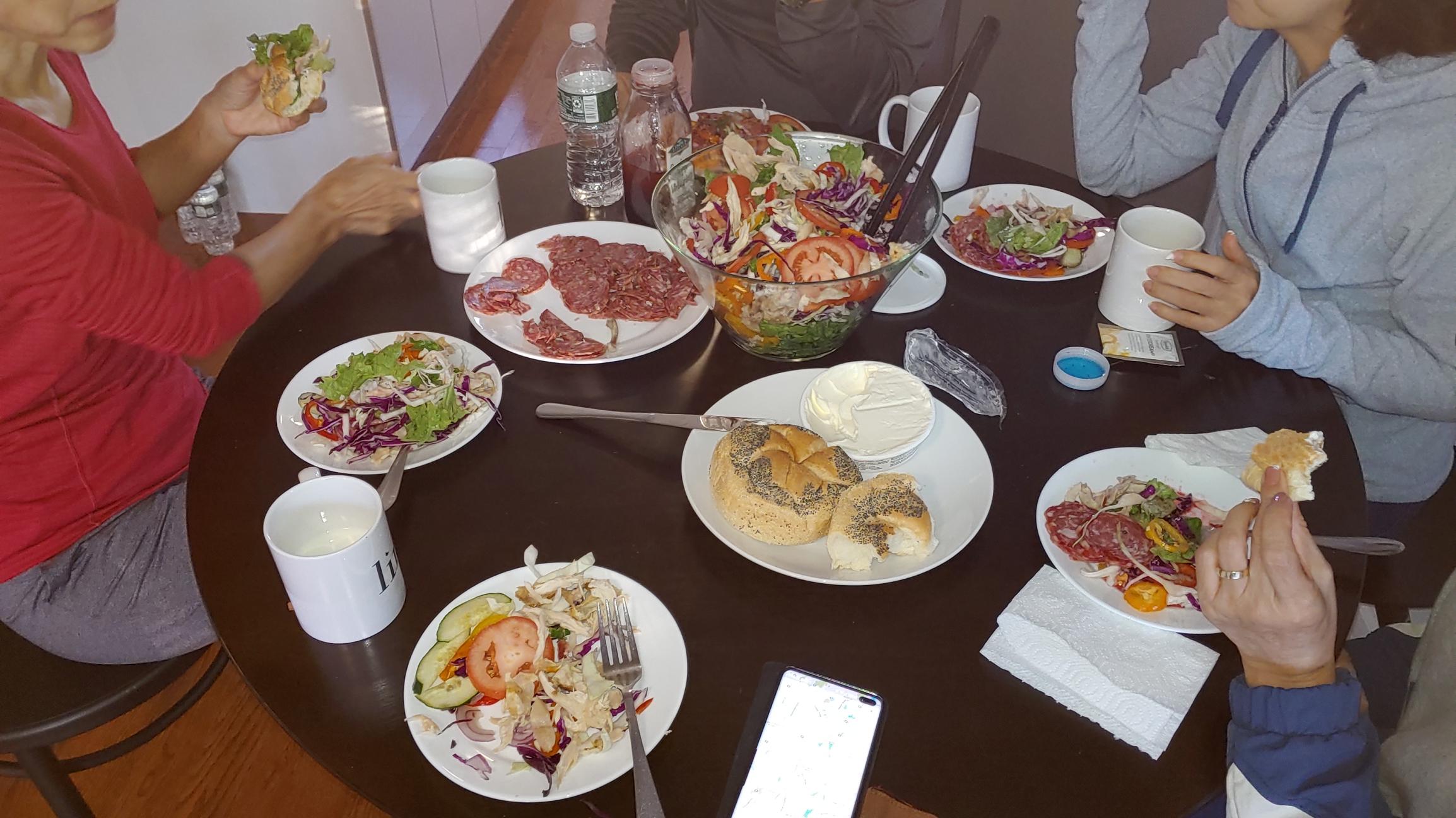 아침 식사는 든든히. 샐러드와 살라미 소시지,빵 우유로.