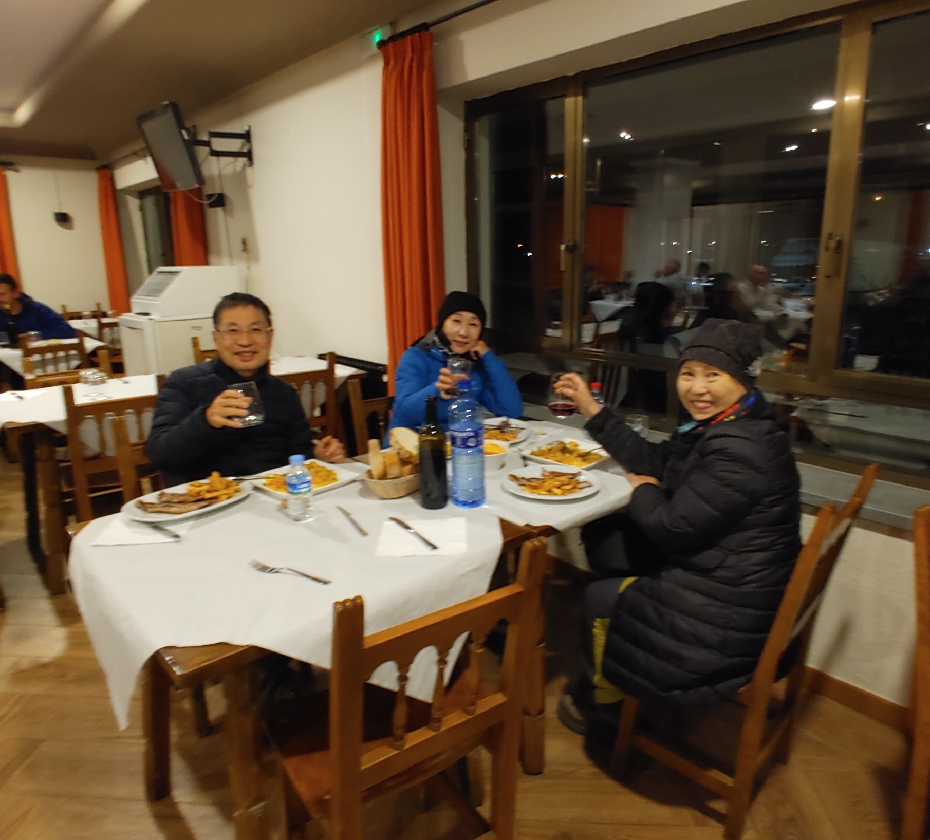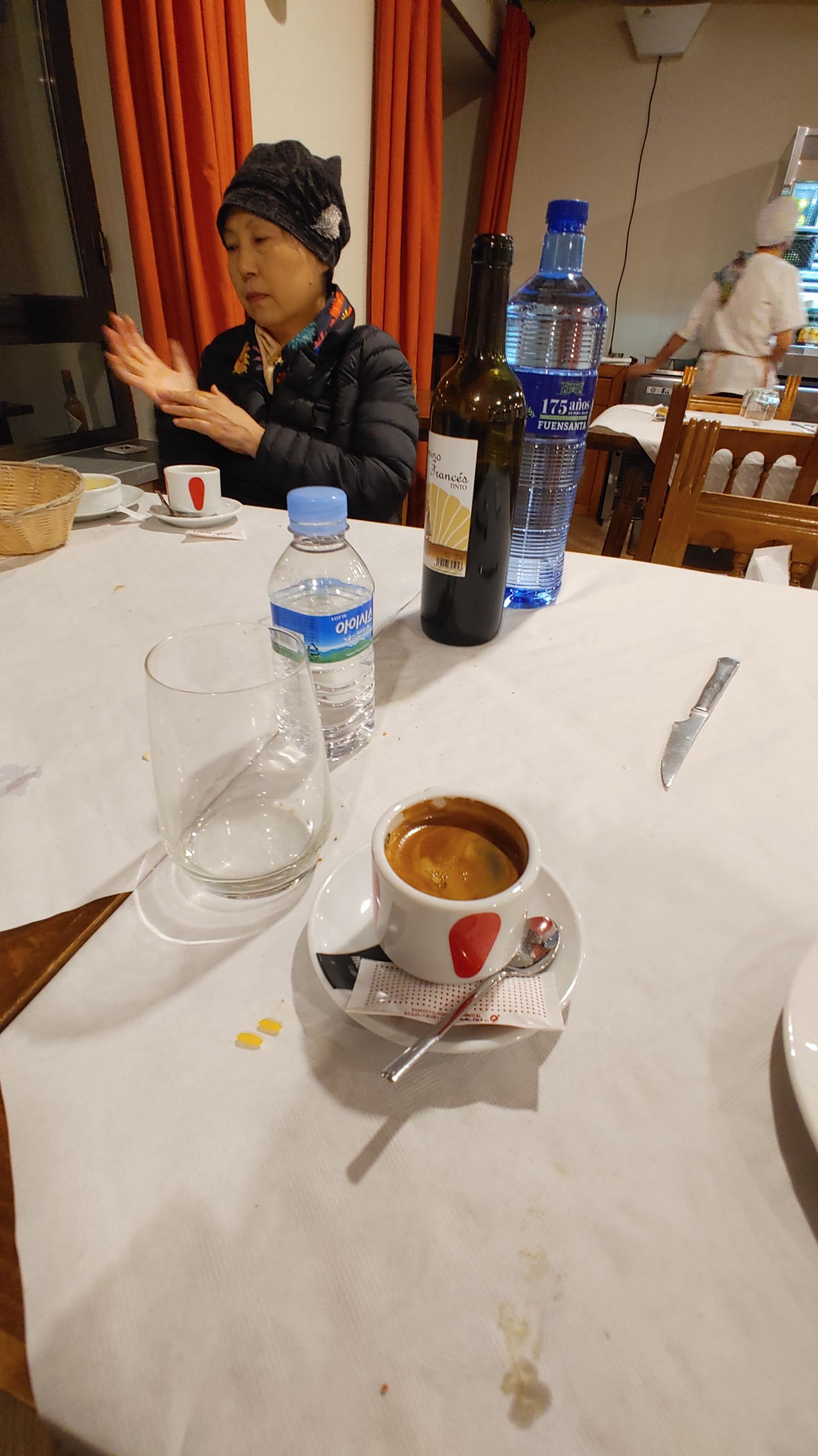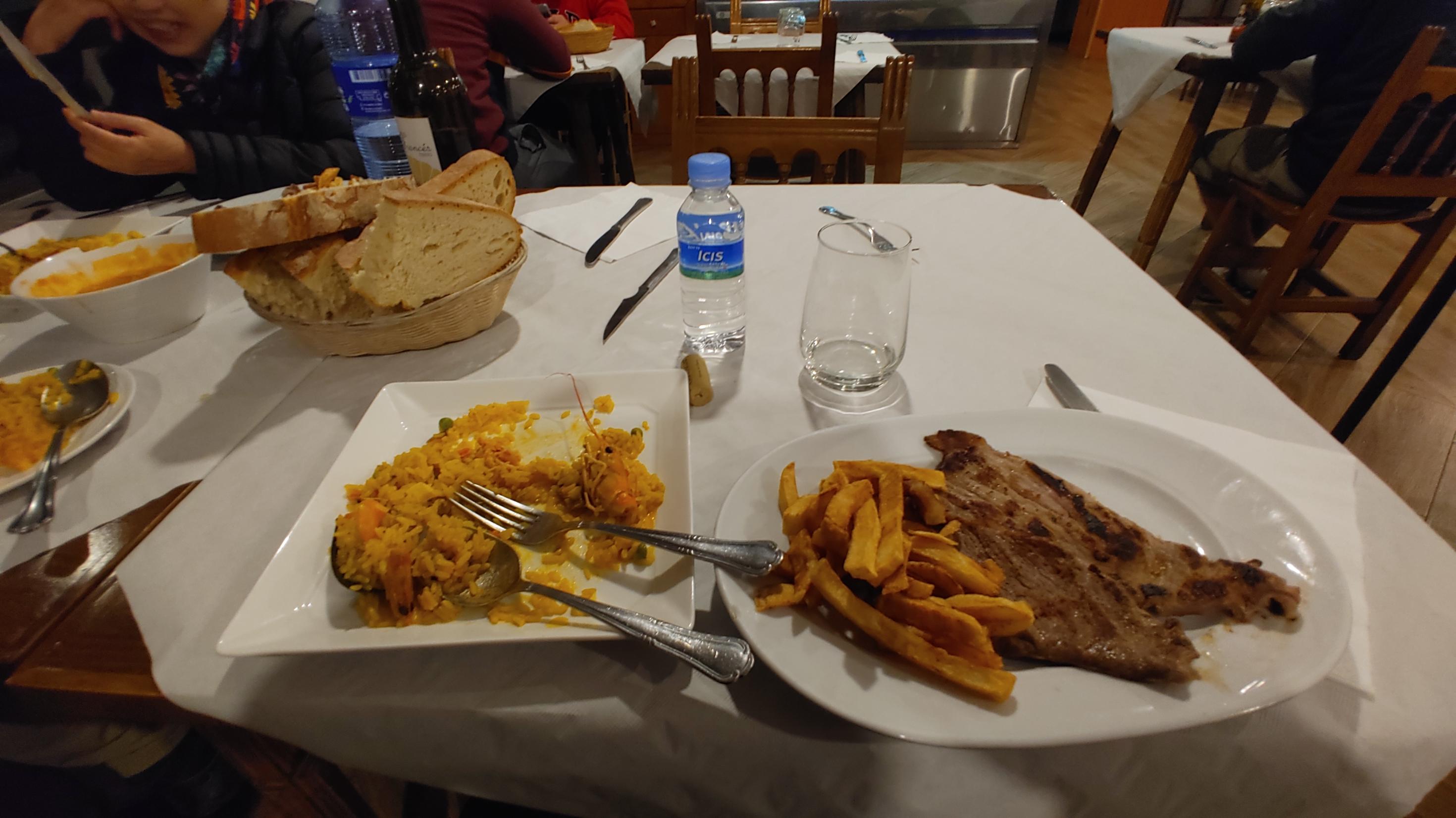 바켓 빵과 포도주 빠에야,비프 스테이크, 디저트 및 엑스프레소 커피까지 3명이 39 유로.