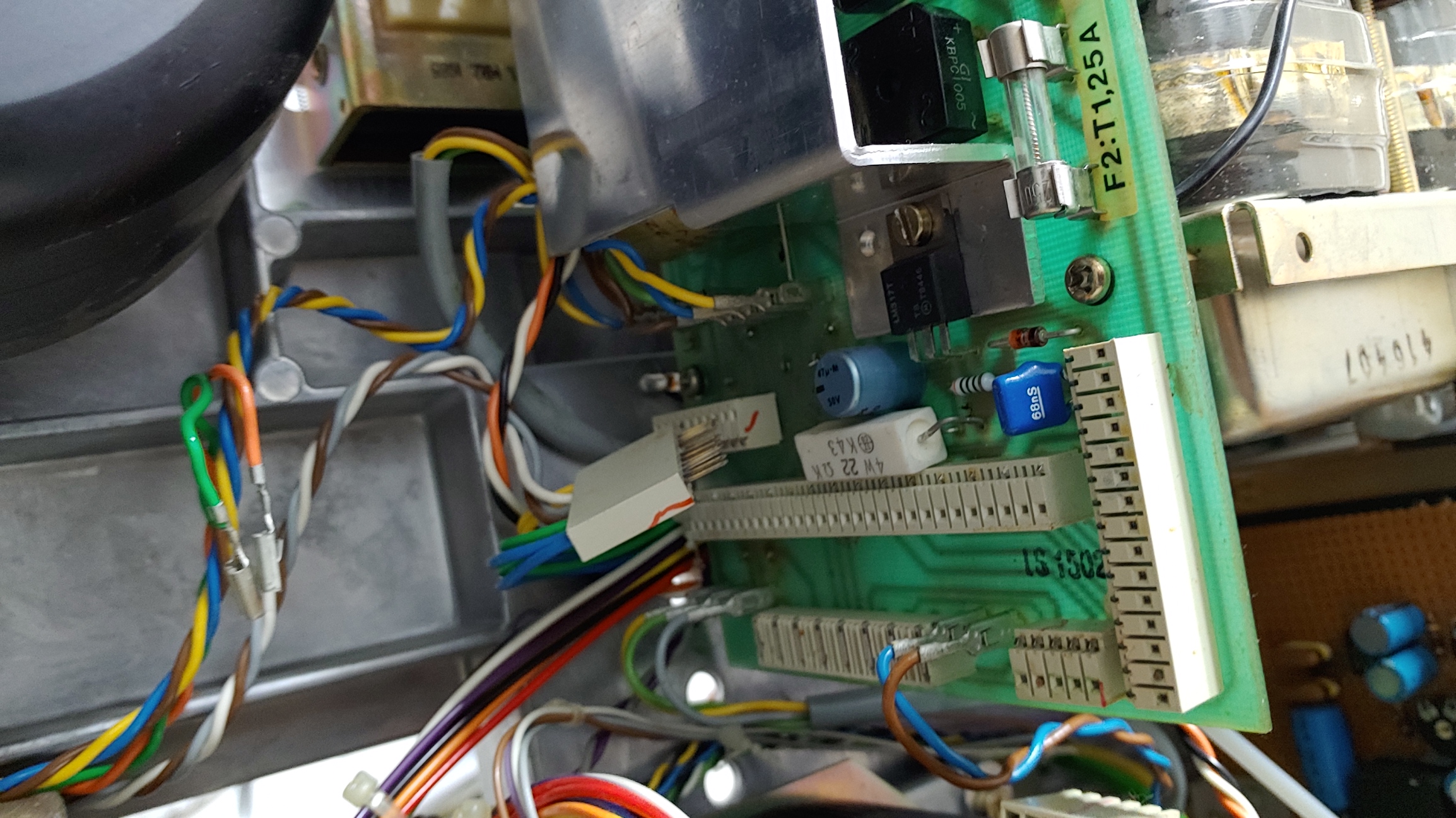 개조 작업을 통해 파란색 Axial type의 Vishy 콘덴서로 장착. 기존 2200uF/40V를 3300uF/40V로 용량을 증강 시켰다