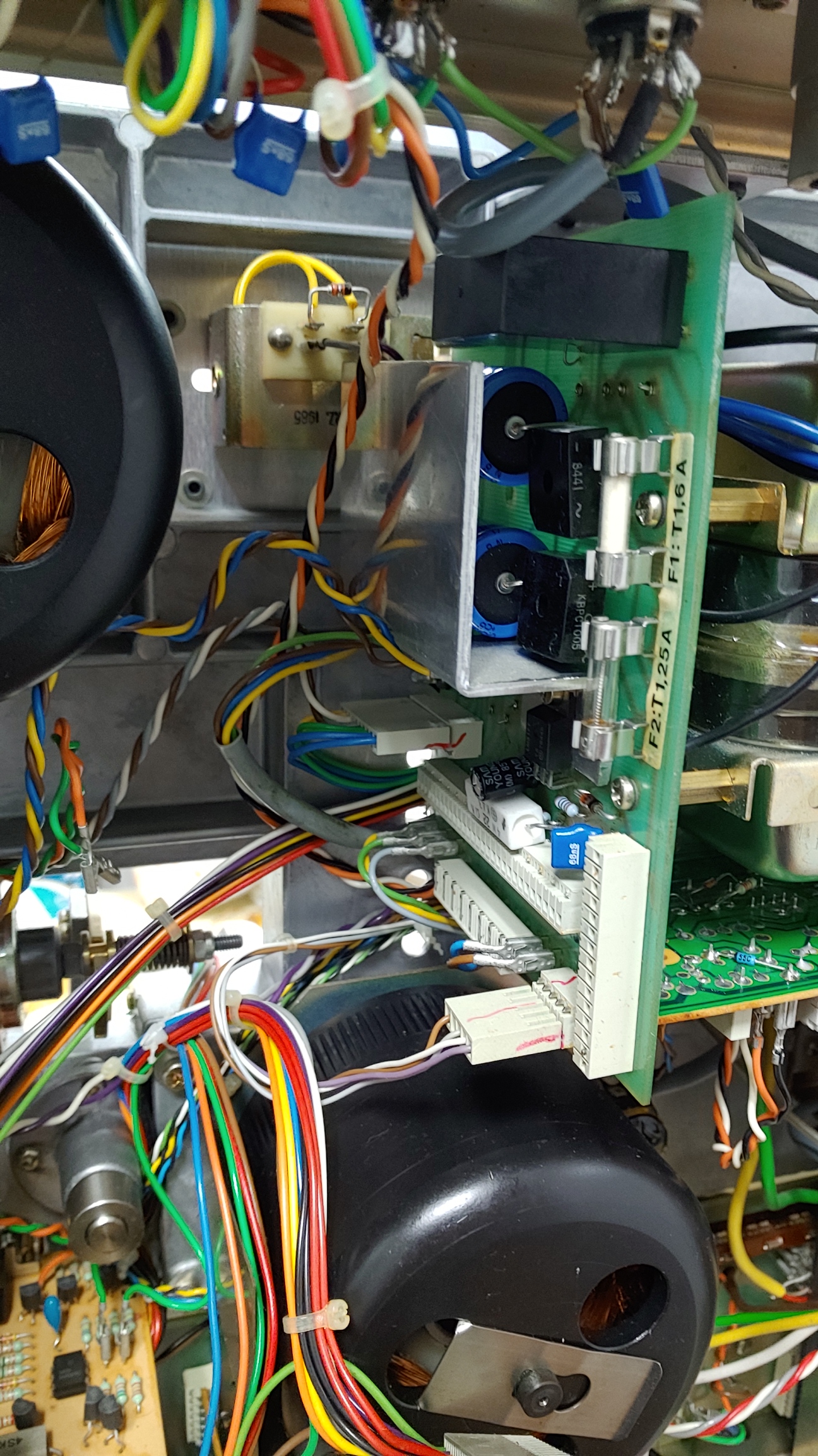 다음으로는 가장 까다롭고 힘든 전원부의 전해 콘덴서 교체 작업. 이 작업을 위해서는 앞면과 옆면 패널을 떼어내고 트랜스포머 모듈 전체를 들어 낸 다음 작업 해야 한다. 이작업은 힘들지만 반드시 해야 할 부분인데 기존에 사용된 황색의 Frako 전해 콘덴서가 용량 감퇴가 심하고 심한 경우 Short를 일으키기 쉬워 악명이 높은 콘덴서이다.