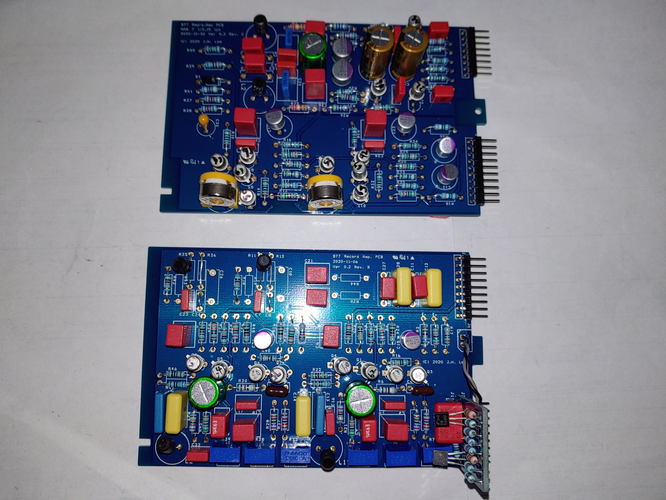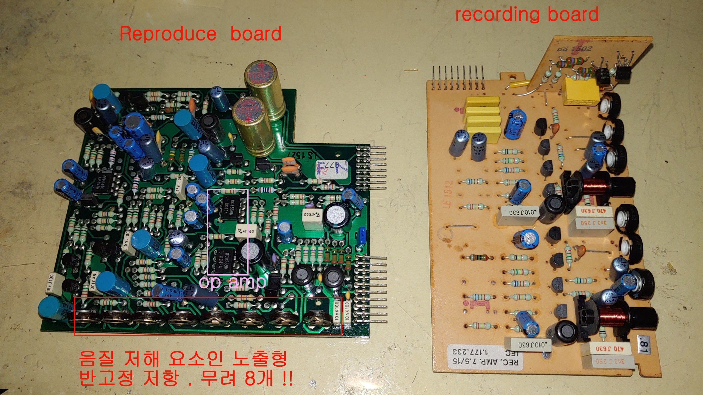 위의 기판은 새로이 제작된 Reproduce board 와 Recording board로 교체 되었다. 이 기판에는 모두 개별 트랜지스터가 사용되어 있는데 증폭율 측정을 하나 하나하여 페어로 매칭 시켜 사용하였다.