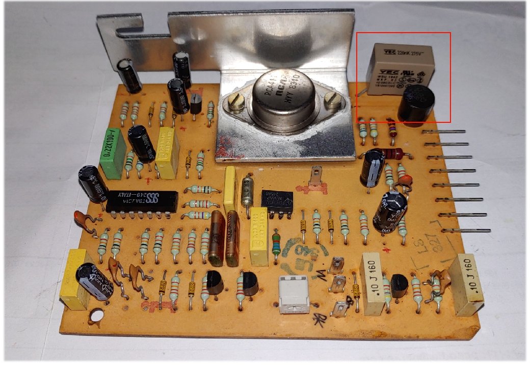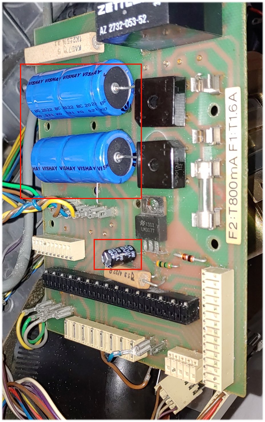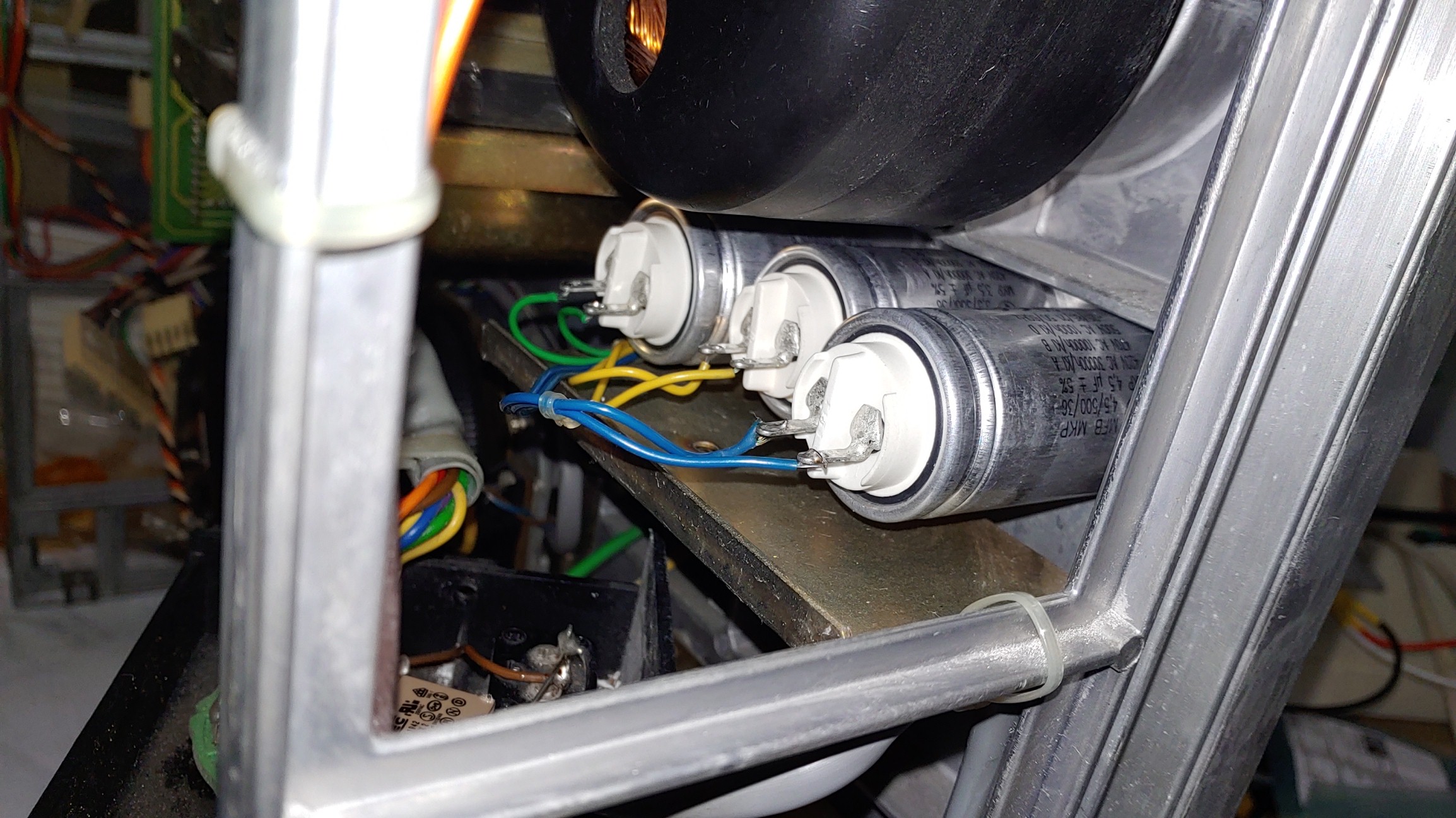 다음은 전원 인입부에 있는 AC 안전 콘덴서. 이 주변에 워낙 오염되어 있어 딱아내는 데 시간이 꽤 걸렸다. 새 AC 안전 콘덴서로 교체 하고 앞면에 있는 3개의 모터 기동용 AC 콘덴서도 새것으로 교체 했다. 이 콘덴서를 교체 하고 모터 내부의 베어링을 신형으로 교체 한 후 새 윤활유를 도포해야 모터가 정상적인 Torque를 갖고 움직인다.