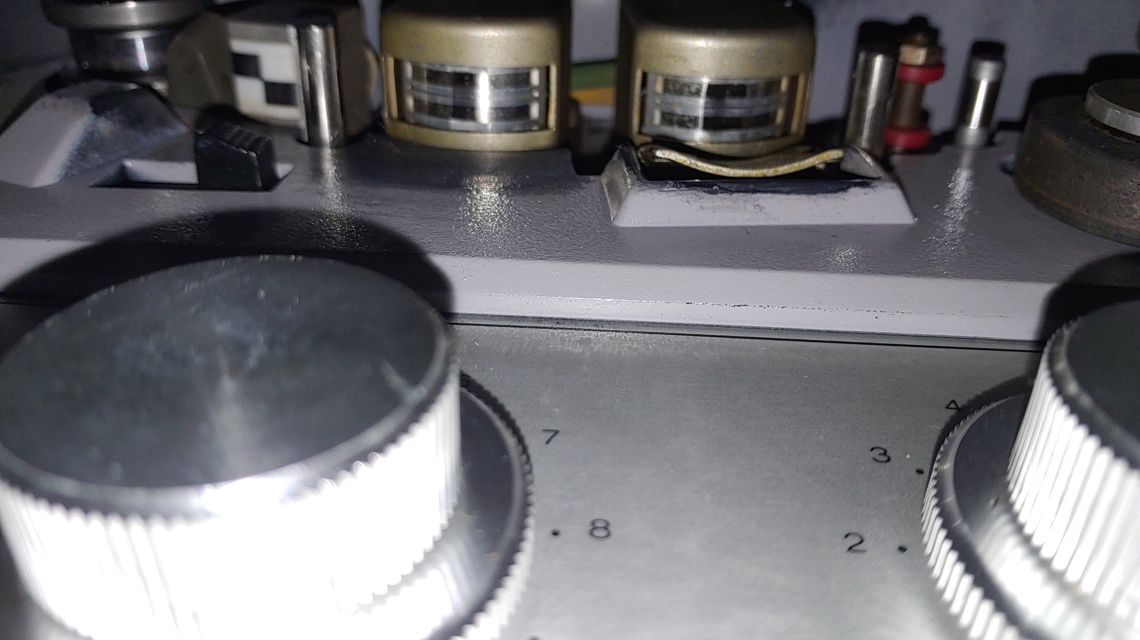 왼쪽 스테레오, 모노 등 선택 스위치가 제 것이 아니고 밑면 중앙의 입력 uncal 스위치의 플라스틱 두껑이 망실 되어 있다.