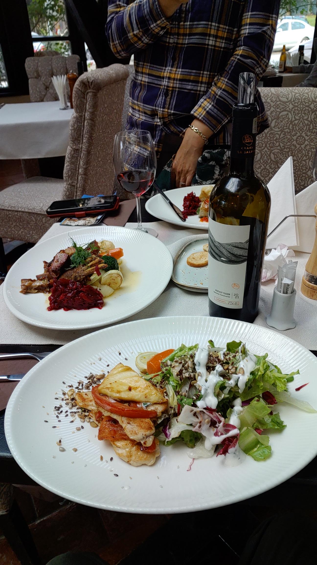 호텔 레스토랑 내에서의 저녁 식사 치킨 수프와 버섯 크림 수프를 시작으로 송어구이 와 양고기 구이, 치킨 샐러드를 주문