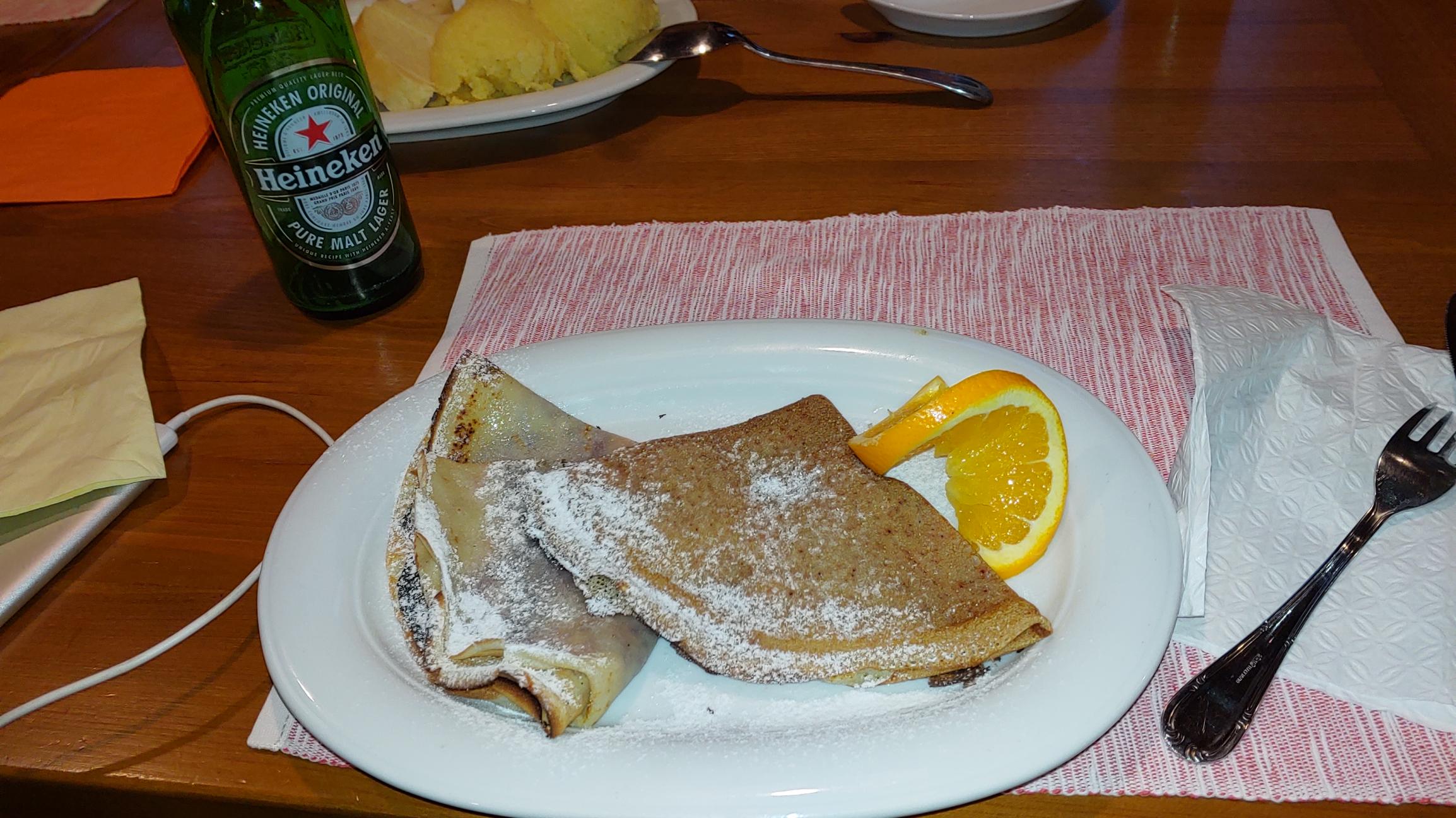 송어구이 메인에 크레페 스타일의 블루베리 디져트