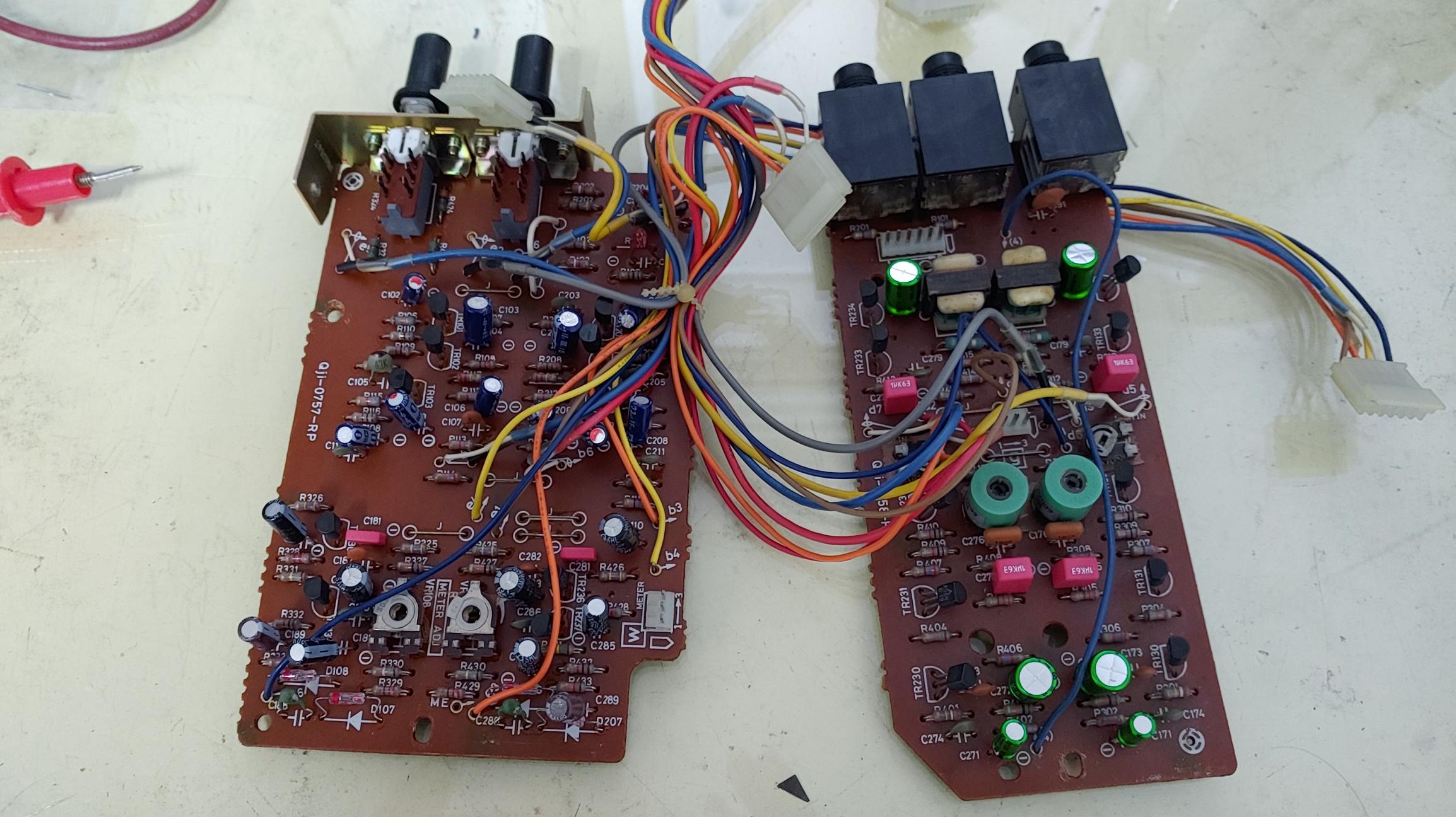 위의 사진과 같이 기존 보드의 오래된 전해 콘덴서를 교체 하고 모든 IC를 떼내어 IC소켓을 삽입하고 새로 구매한 신품 IC를 장착한 후 테스트 해 보았으나 역시 증상은 마찬가지.