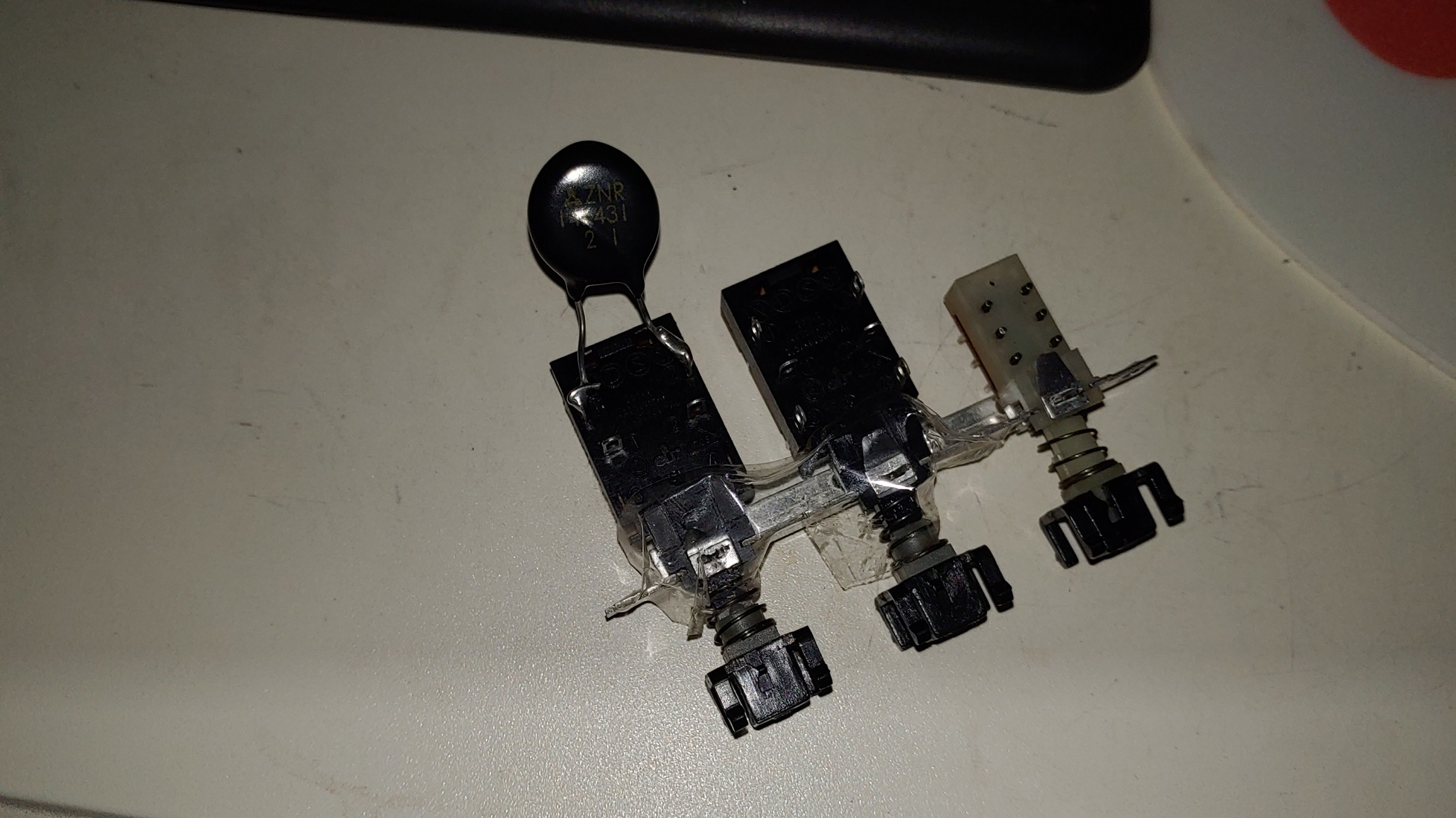 처음에는 이런 스위치를 교체 하는 것은 어렵지 않을 줄 알았다. 일단 인터넷을 검색하여 보니 이 부분에 대한 고장이 이외로 많다는 이야기가 많고 대체품 구하기가 어렵다는 것이다. 기기를 분해하여 이 스위치를 보니 릴 사이즈 선택 스위치와 함께 3 개가 세트로 되어 있는데 일본 알프스사 제품으로 보인다.
