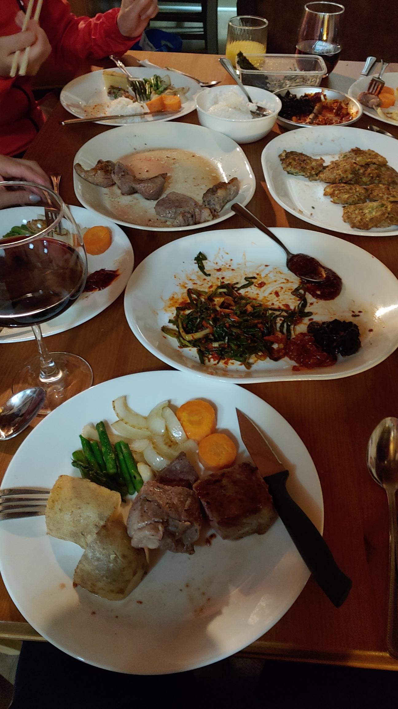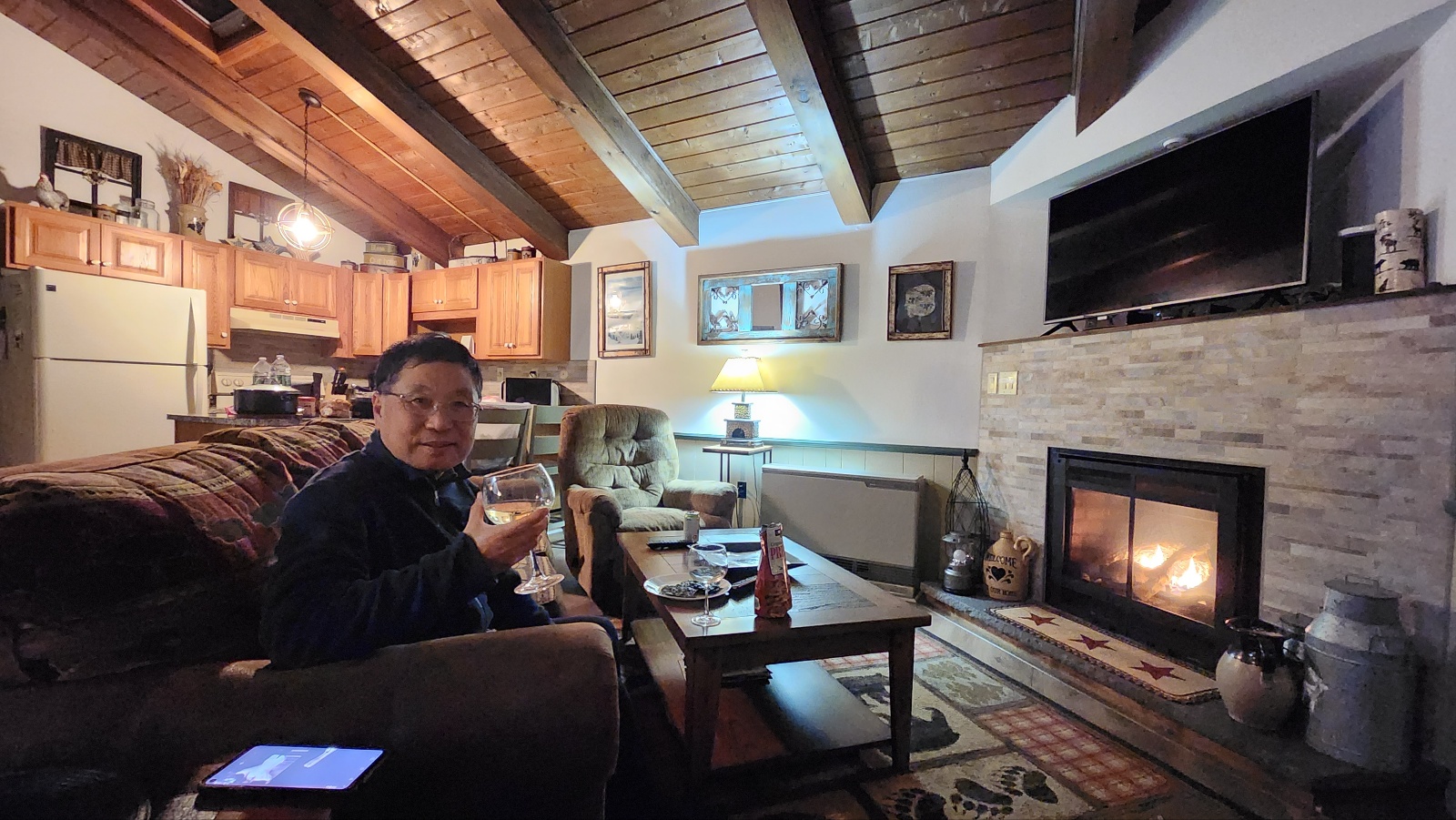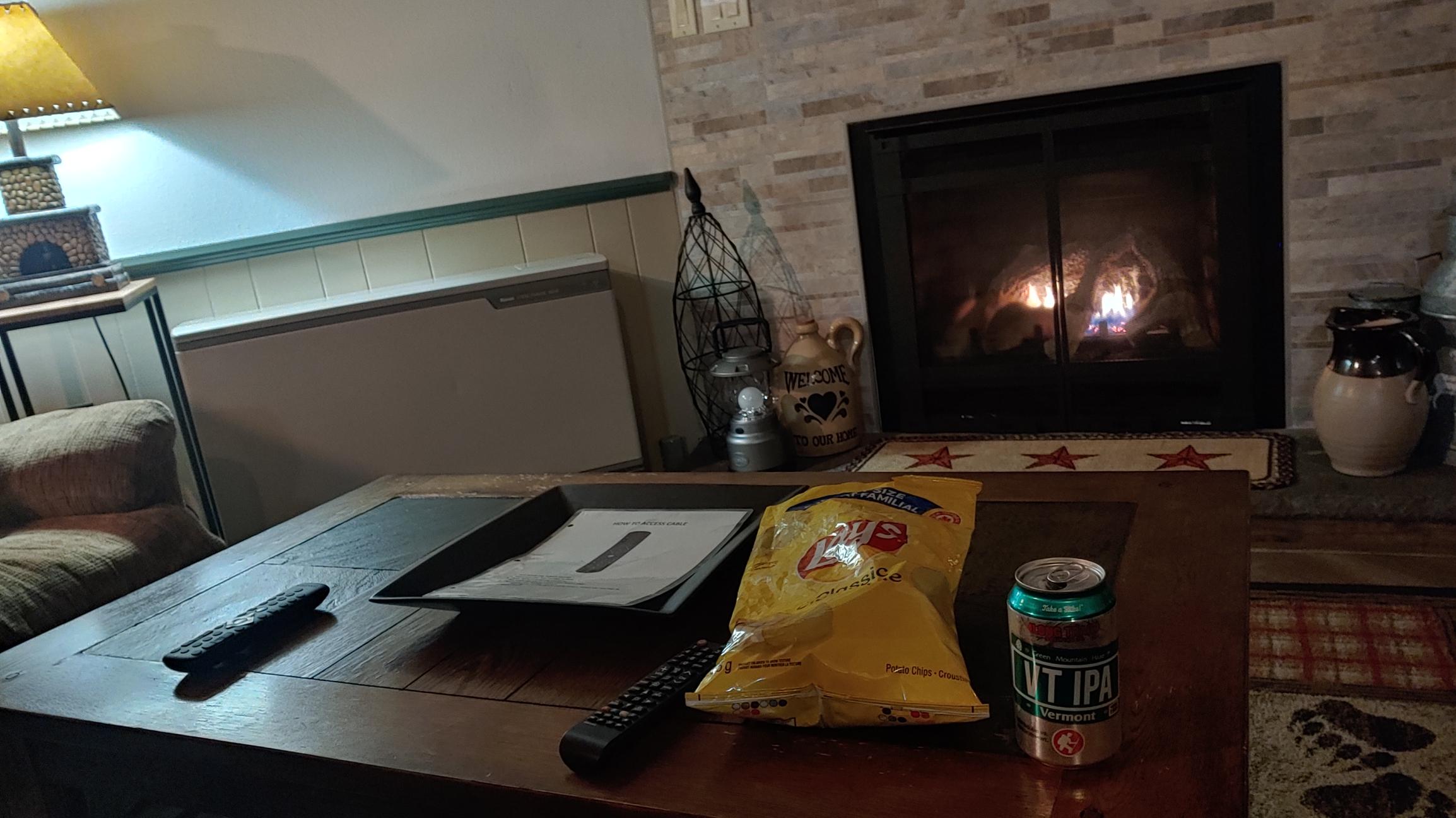 따뜻한 뻬치카 앞에서 불멍과 화이트 와인.