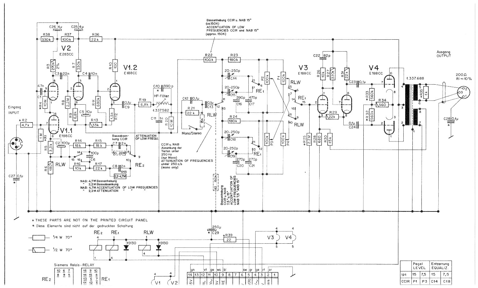 왼쪽 부분의 노란색 릴레이 2 개가 각각 사용하여 NAB와 CCIR EQ회로를 선택한다. 이는 EQ단의 신호 경로를 최대한 짧게 유지 하려는 의도이다.