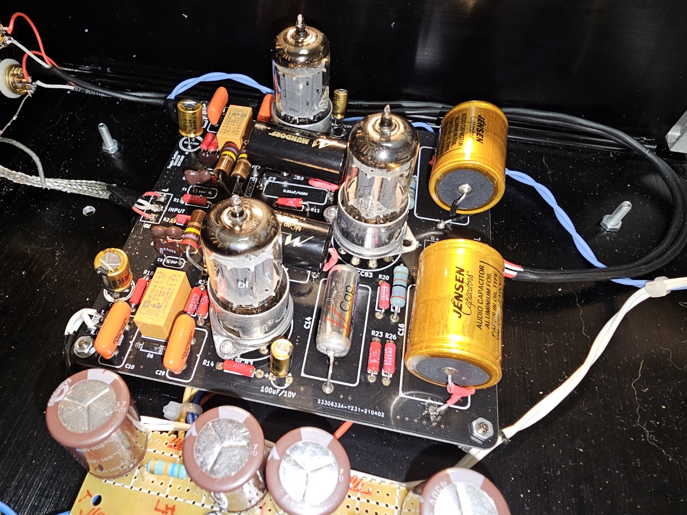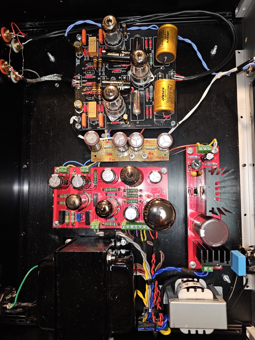 진공관은 텔레푼켄 각인관을 사용한 것으로 보이는데 음질 결정에 영향을 주는 커플링 콘덴서 선택에서 몇가지 후보를 실제 청음을 하면서 결정하였다고 하는데 최종 선택은 입력 부분에 Mundolf Film , 중간단에 V cap Film 콘덴서를 사용하여 넓은 대역의 음이 전송되도록 하고 마지막 단은 음질에 영향을 많이 미치는데 여러가지 바꾸어 가며 테스트한 결과 Jensen의 알류미늄 포일 콘덴서를 사용하였을 때 가장 충실한 중,저역이 얻어져 최종적으로 이로서 정착 하였다고 한다.