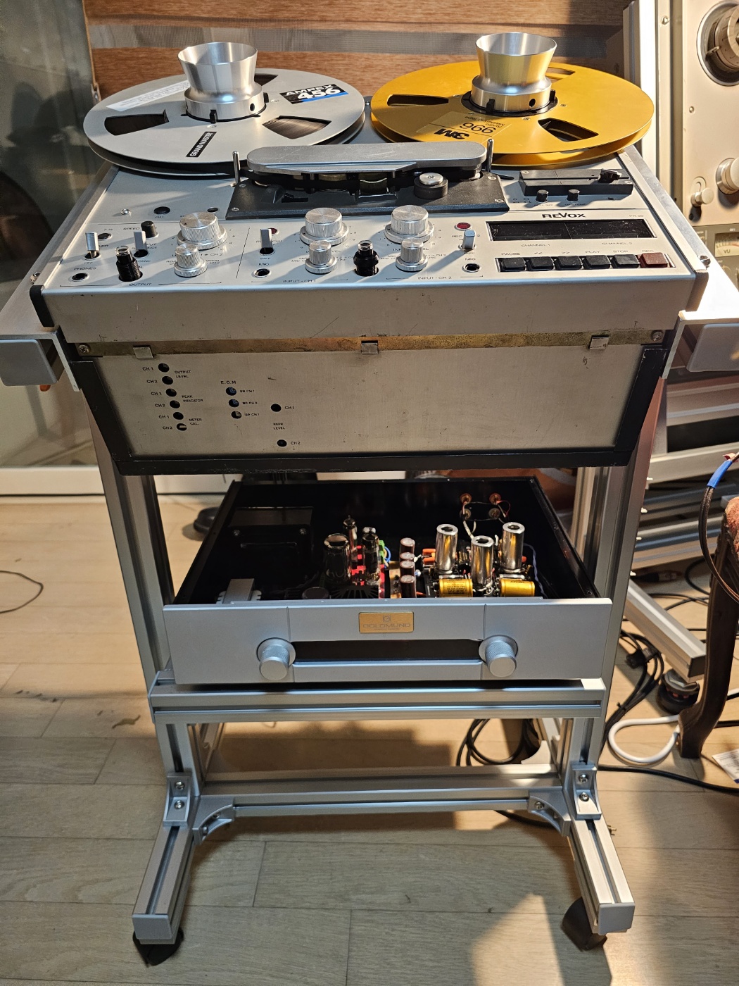 전용 랙을 제작하여 리복스 PR99를 올리고 밑에 Ali에서 구입한 골드문트 프리 앰프 replica 새시를 이용하여 꾸몄다.