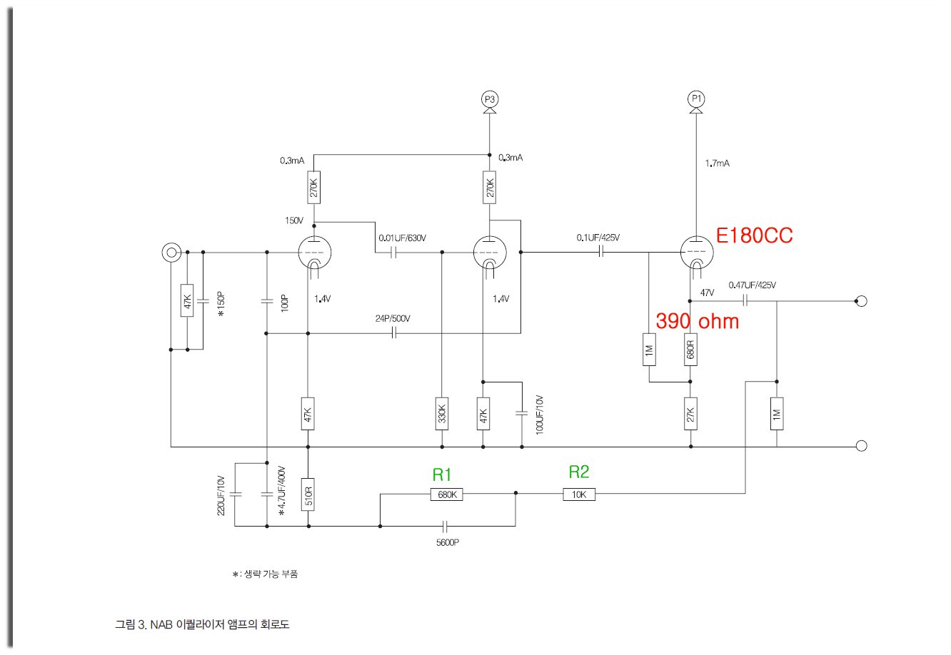 기사에서는 버퍼단에 ECC83 ( 12AX7 )을 사용하도록 했으나 좀 더 많은 전류를 흘릴 수 있는 E180CC로 교체 하여 사용할 것을 권한다. 핀 배치가 같기 때문에 캐소드 저항을 680ohm에서 390 ohm으로 바꾸면 된다.