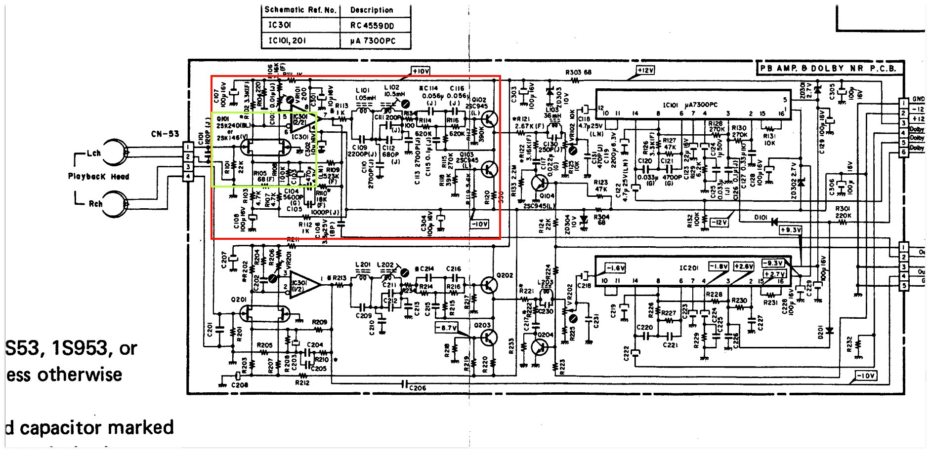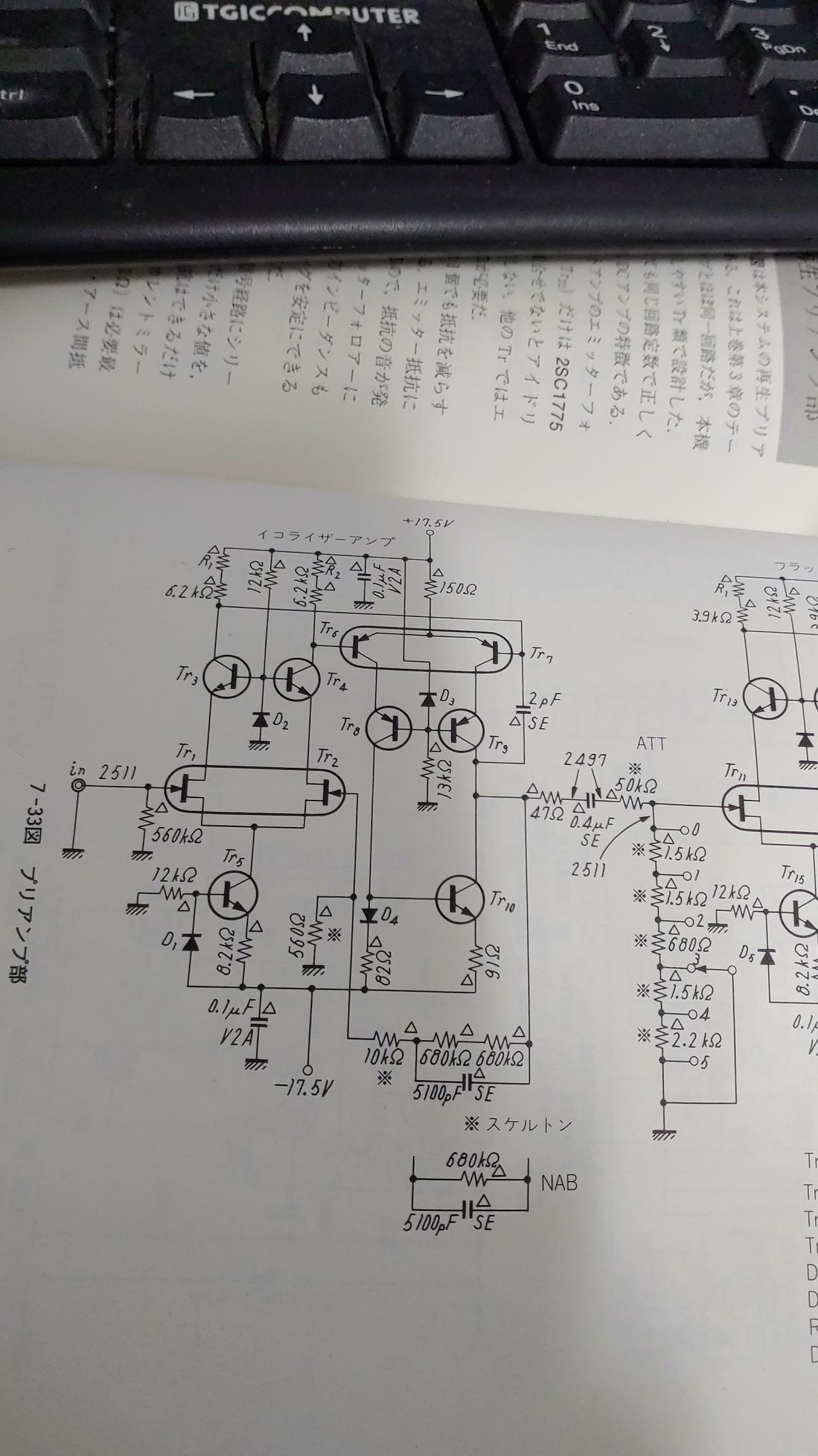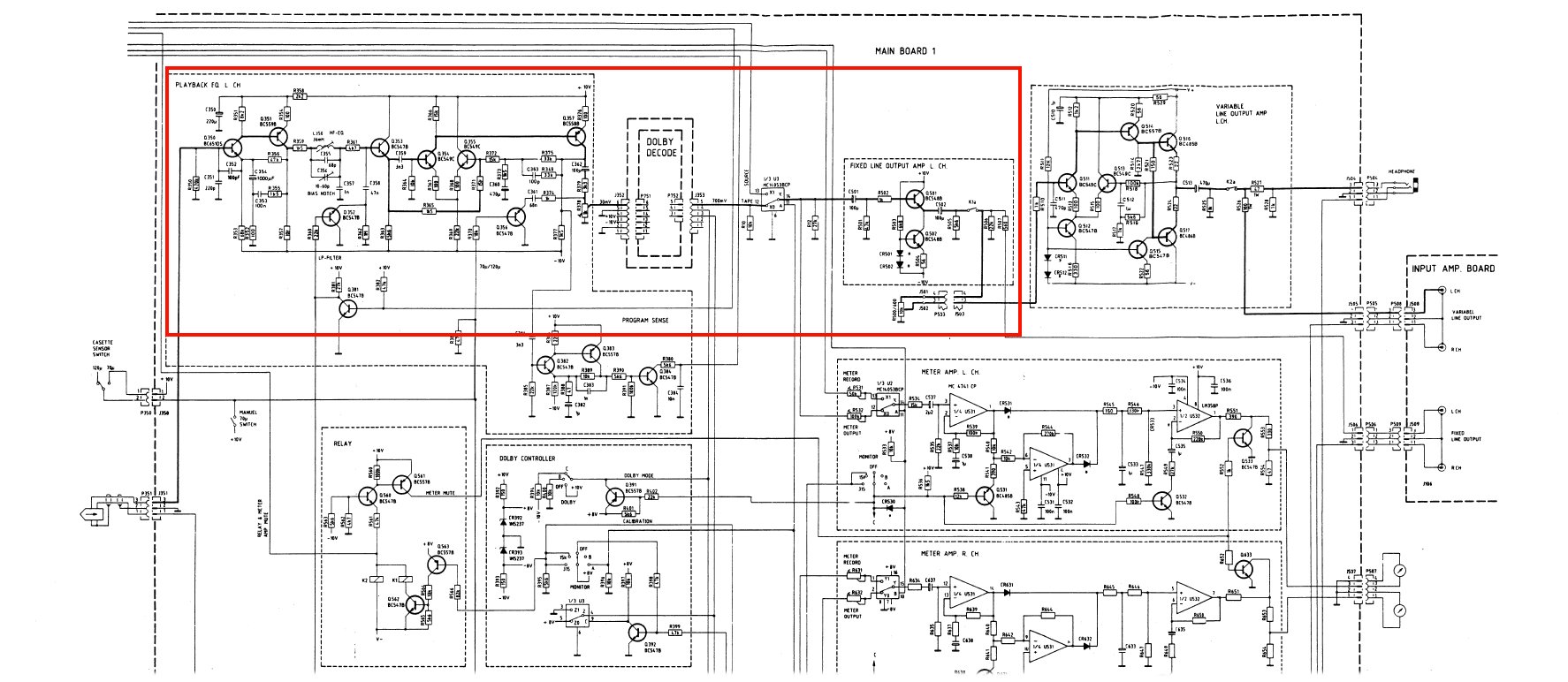 Nakamichi 1000ZXL의 palyback amp 회로. 최 전단에 오디오용 트랜지스터 중 가장 음질이 우수하기로 유명한 2SK146을 채용하였고 이어 트랜지스터 회로로 구성 되어 있다. 뒷단에 uA7300PC라는 Dolby IC 채용은 어쩔수 없다. Dolby 회로를 디스크리트 회로로 구성은 생각 할 수 없는 일.