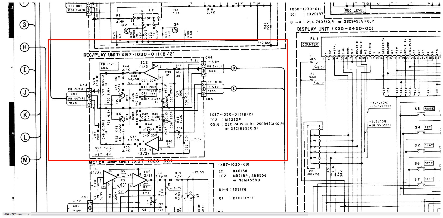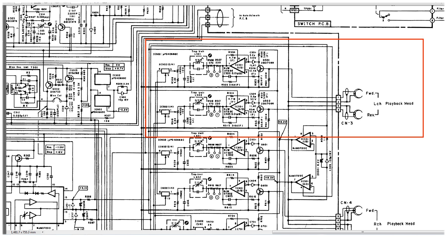 이번에 실험에 쓰인 Kenwood KX-880G 데크의 palyback amp 회로. op amp로 간단히 이루어져 있다.