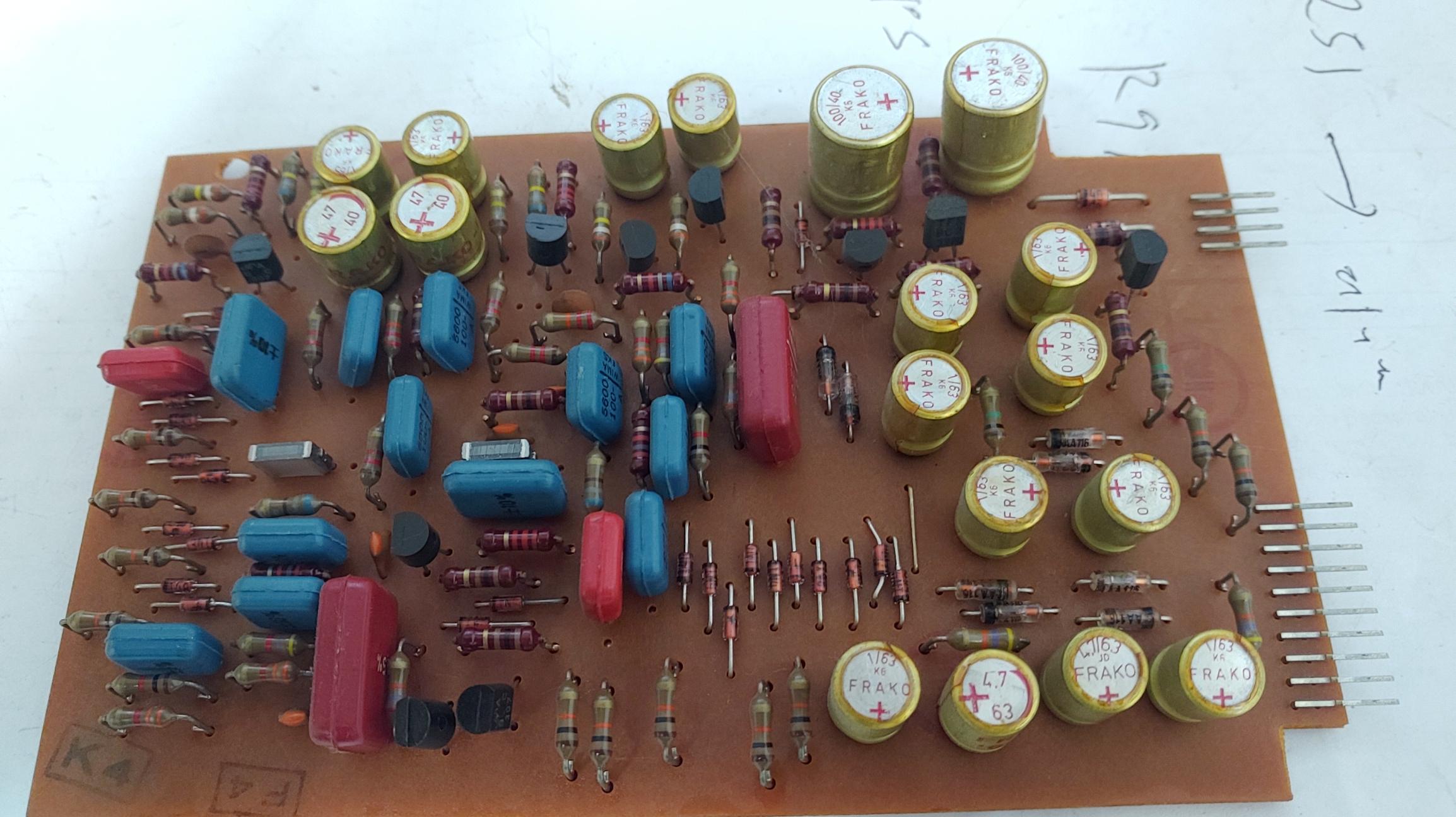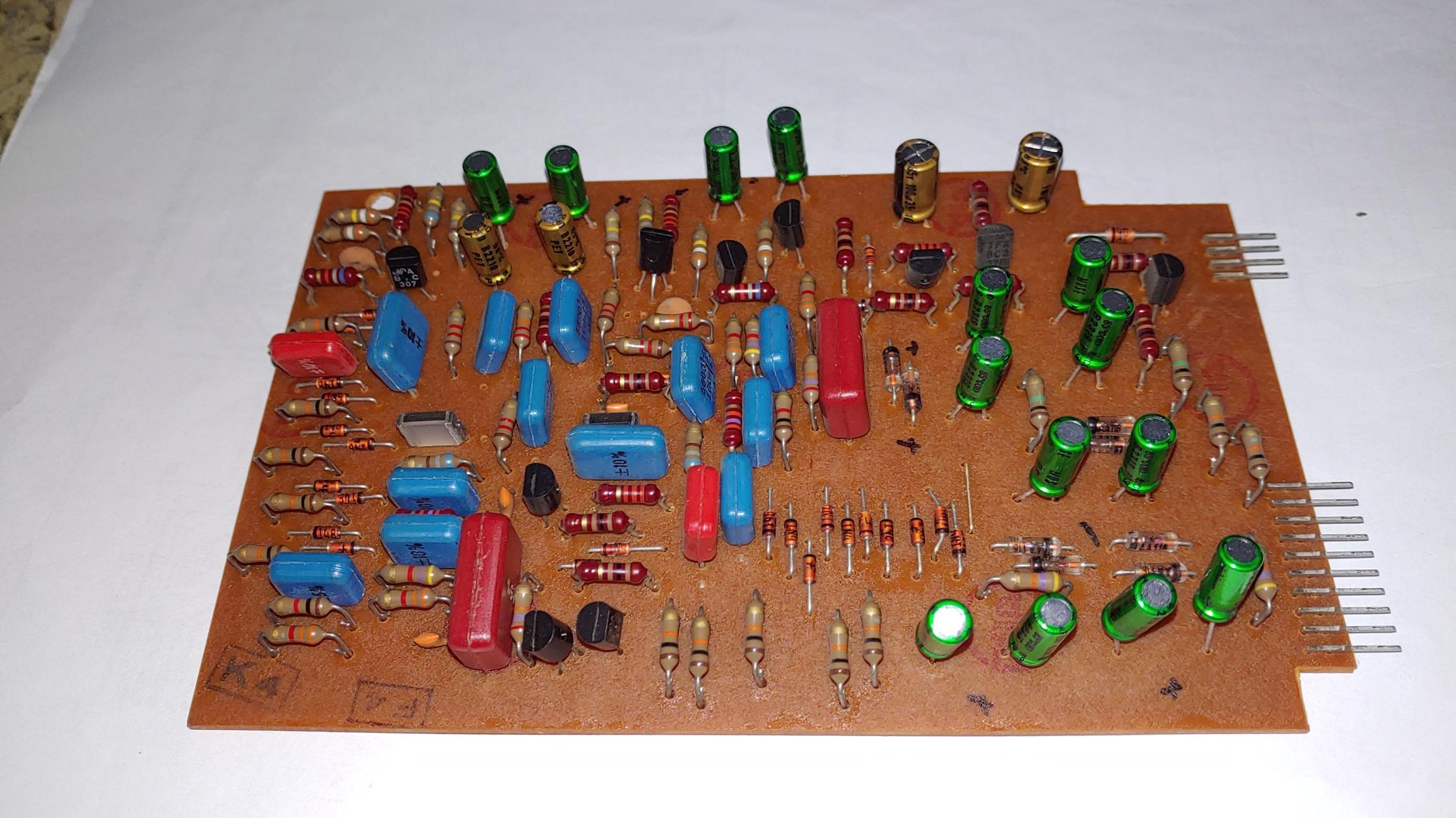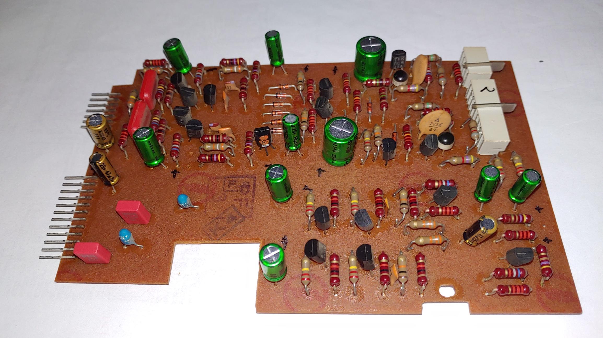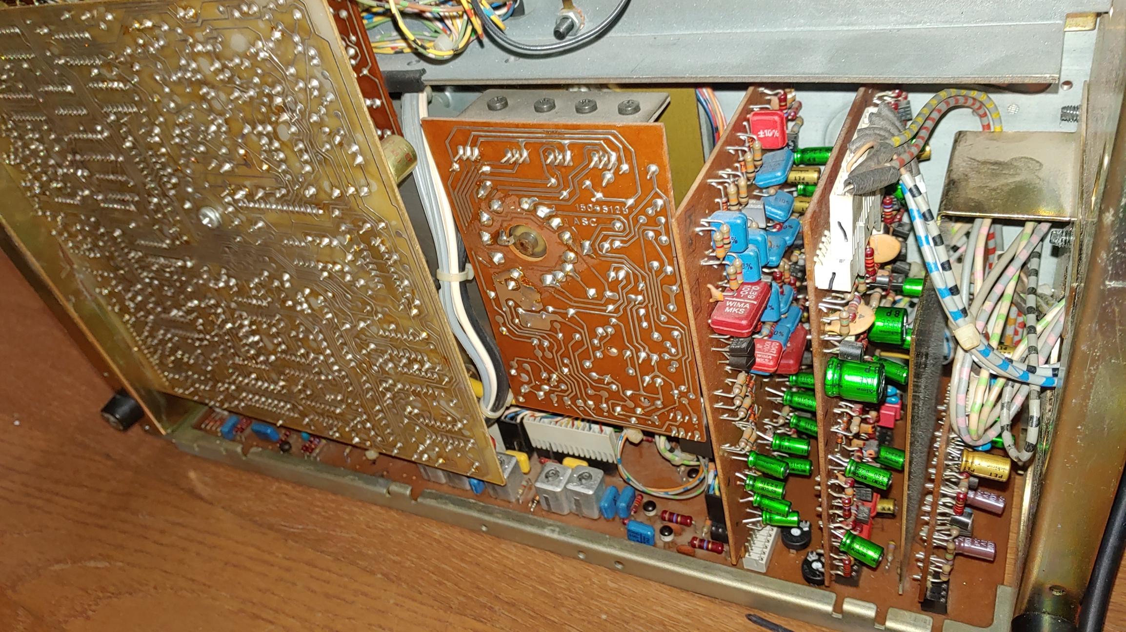 오버홀 전의 보드 들 . 40년 가까이 세월이 흐른 전해 콘덴서와 오디오 신호 단에 있는 탄탈 콘덴서가 교체 대상이다.