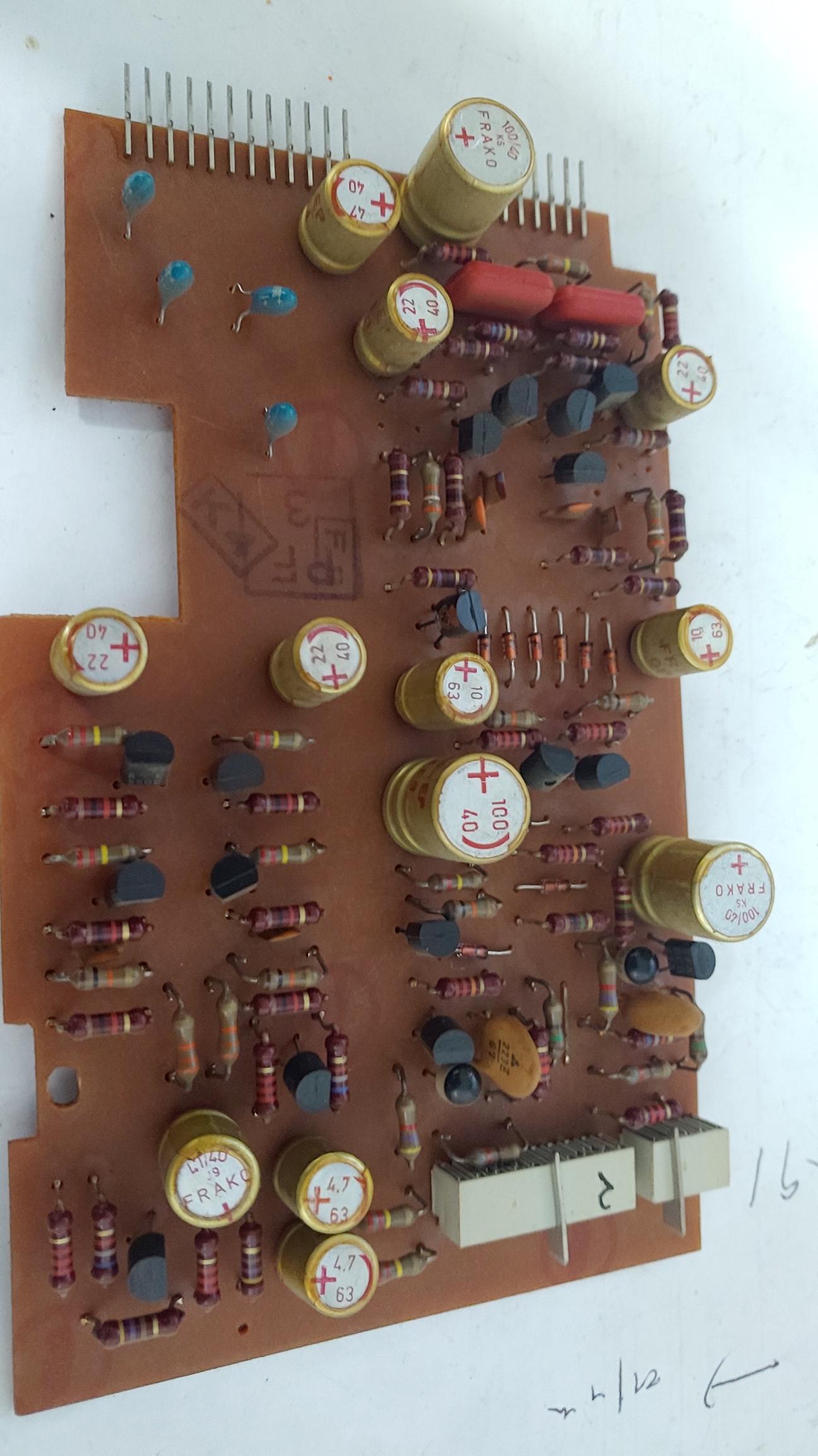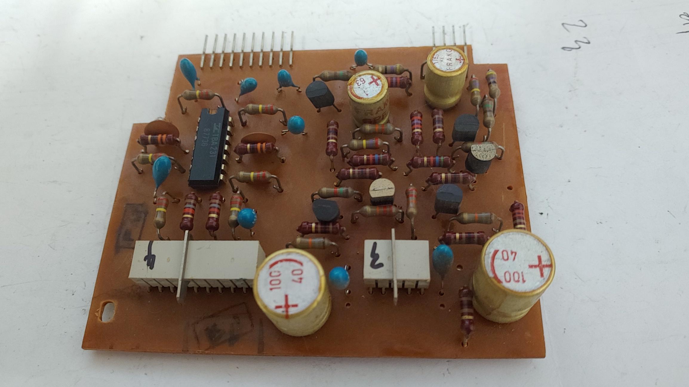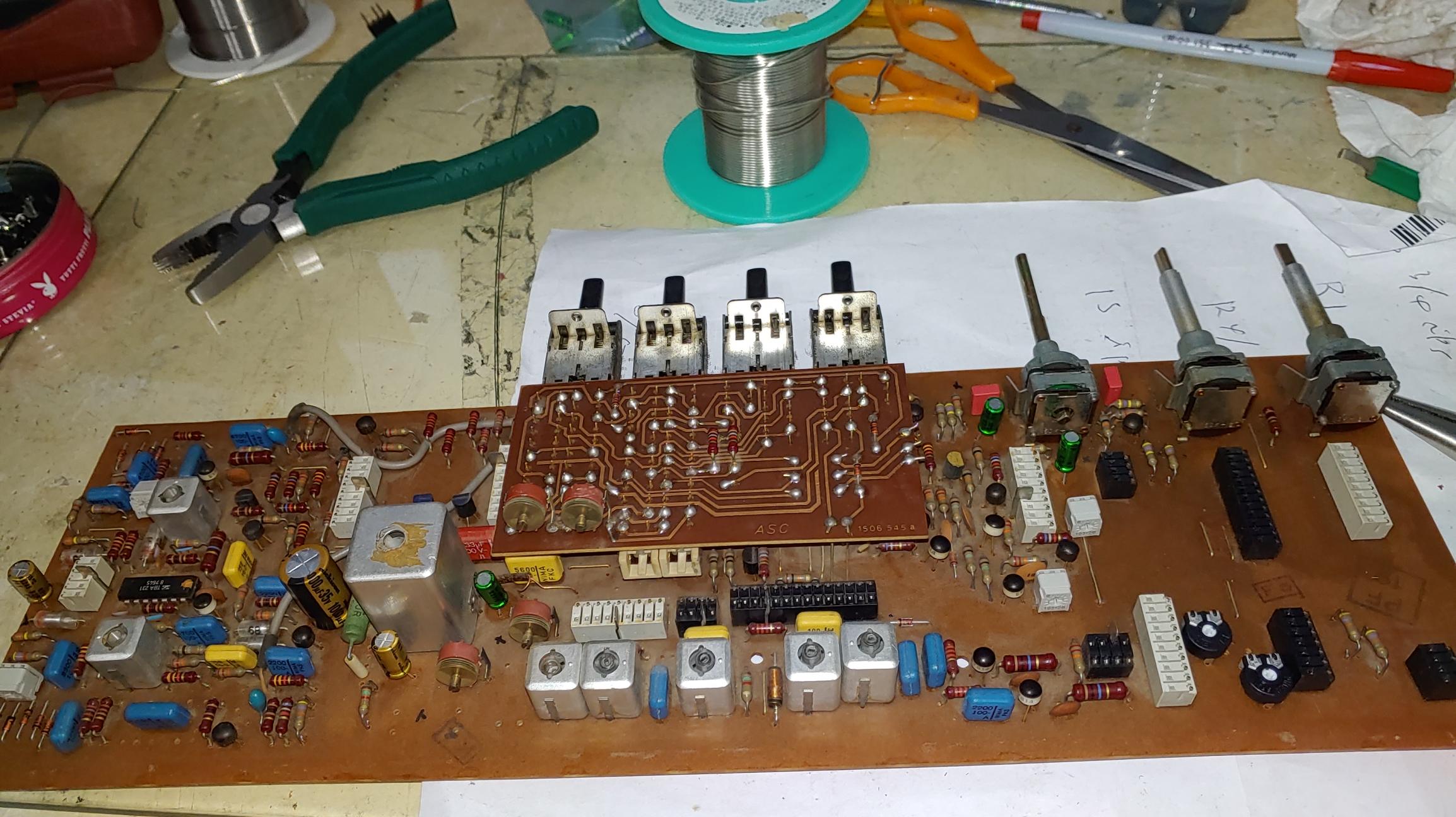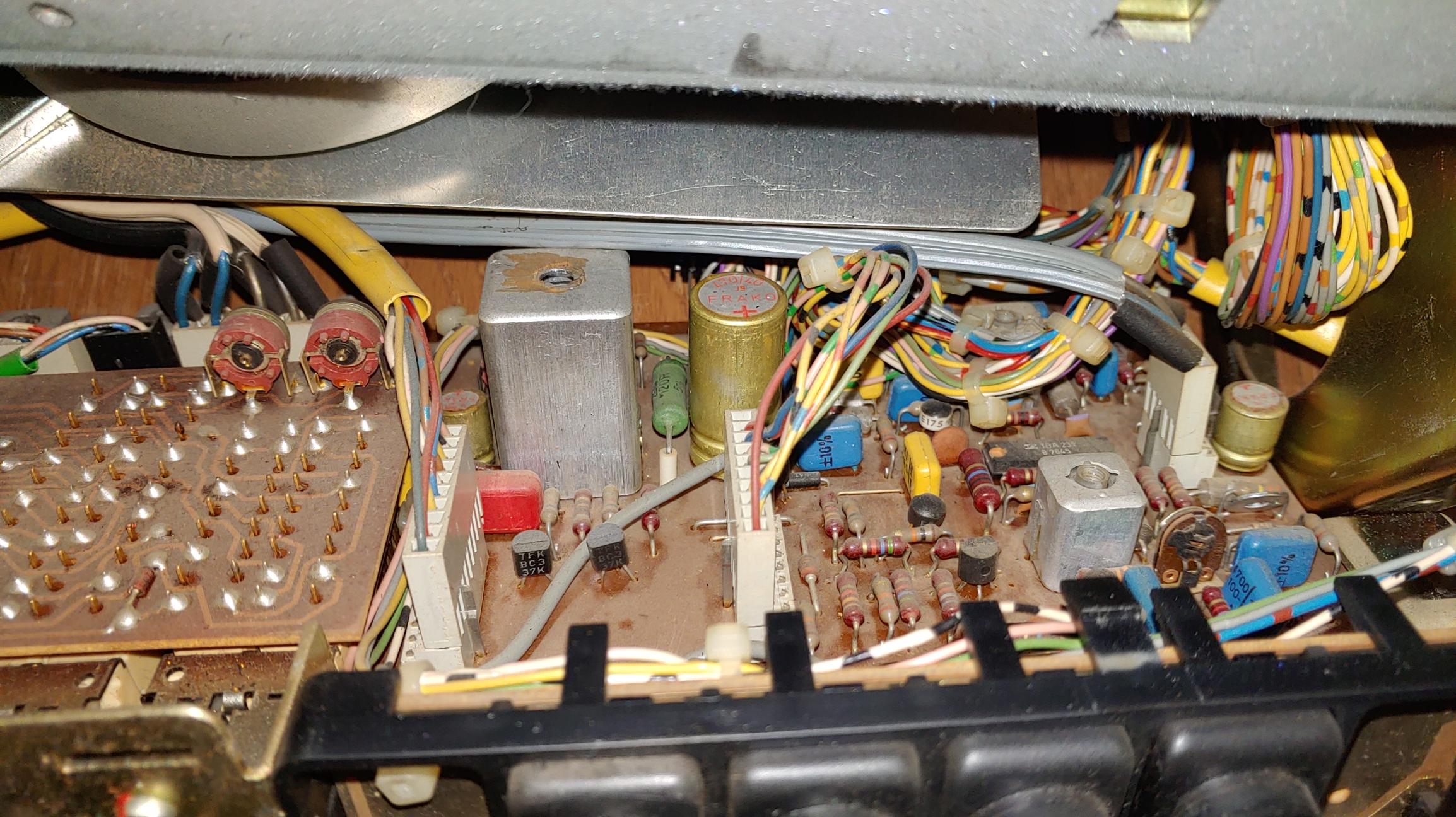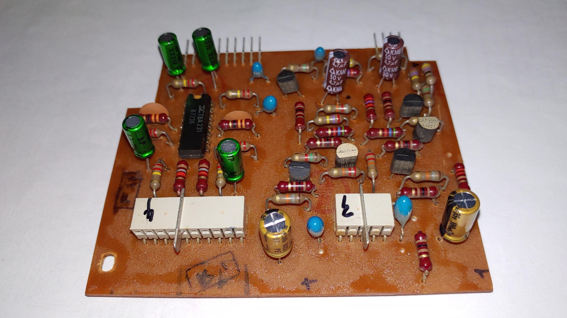 오버홀 전의 보드 들 . 40년 가까이 세월이 흐른 전해 콘덴서와 오디오 신호 단에 있는 탄탈 콘덴서가 교체 대상이다.