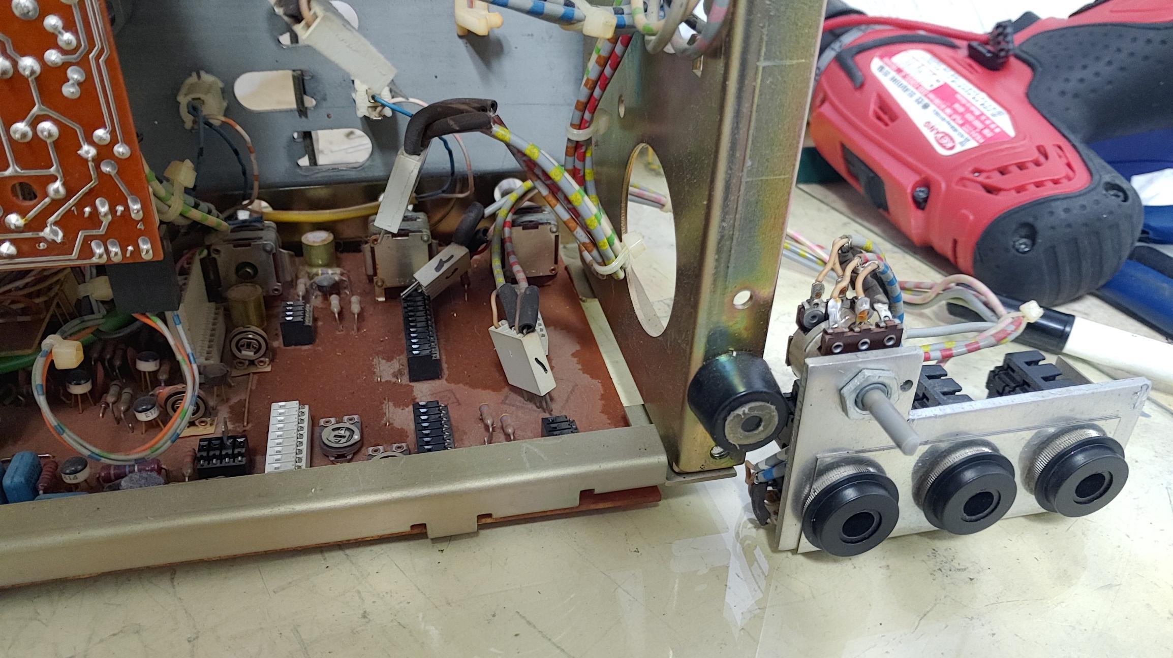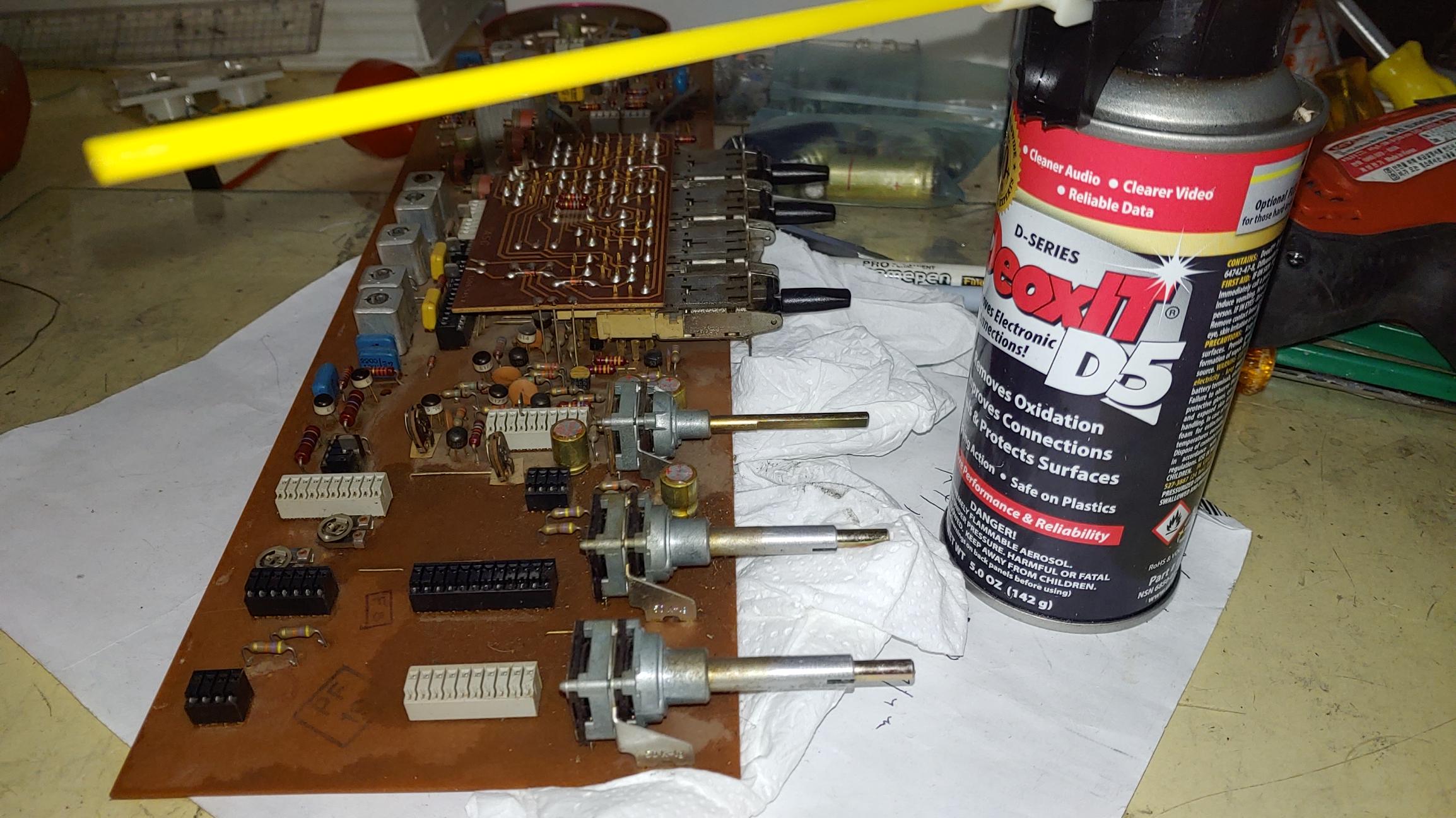 밑면 메인 보드의 오버홀 전 모습. 볼륨 등 스위치 류에는 Deoxit D5를 뿌려 산화막을 제거 하고 접점을 부활시킨다.