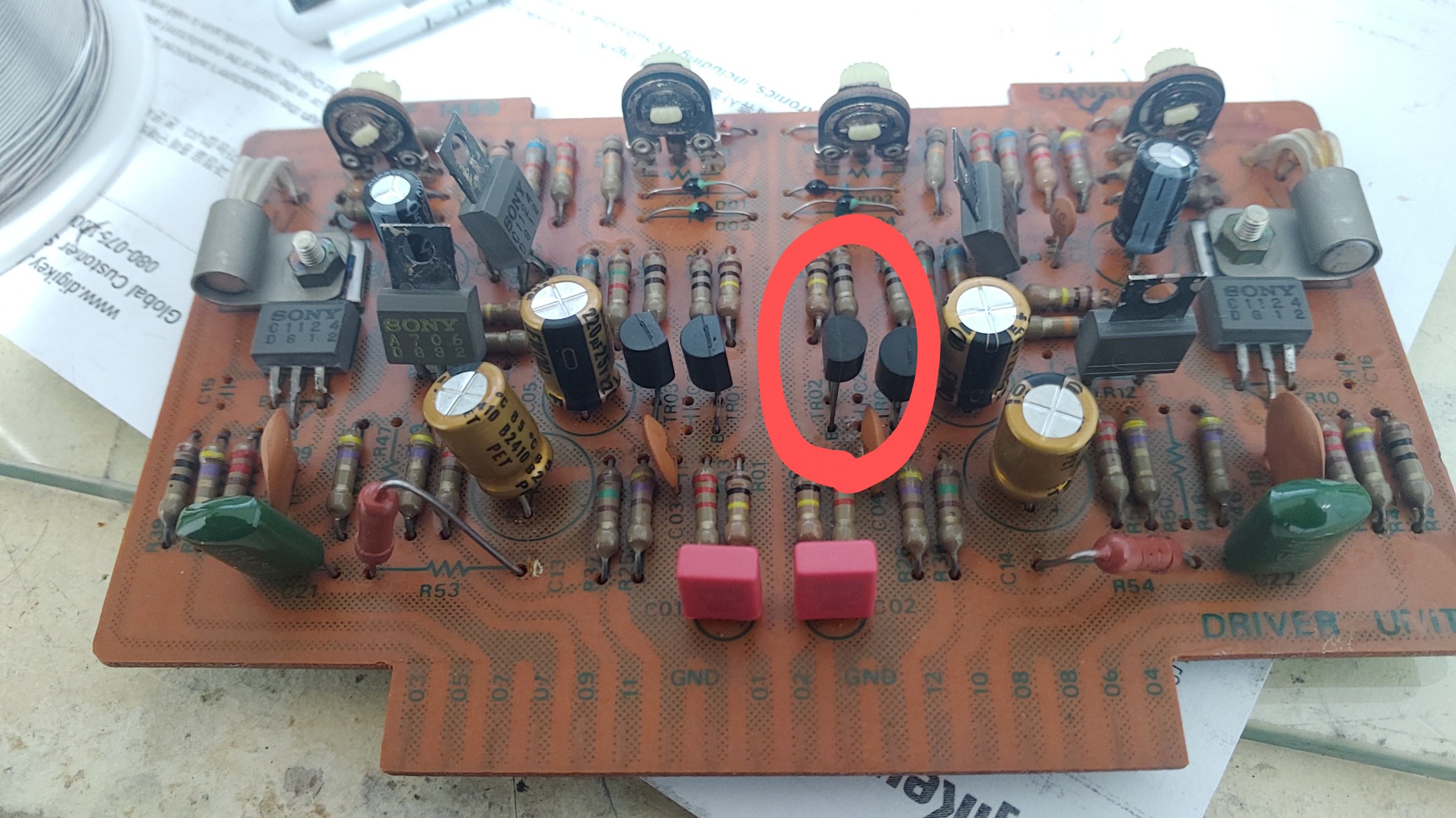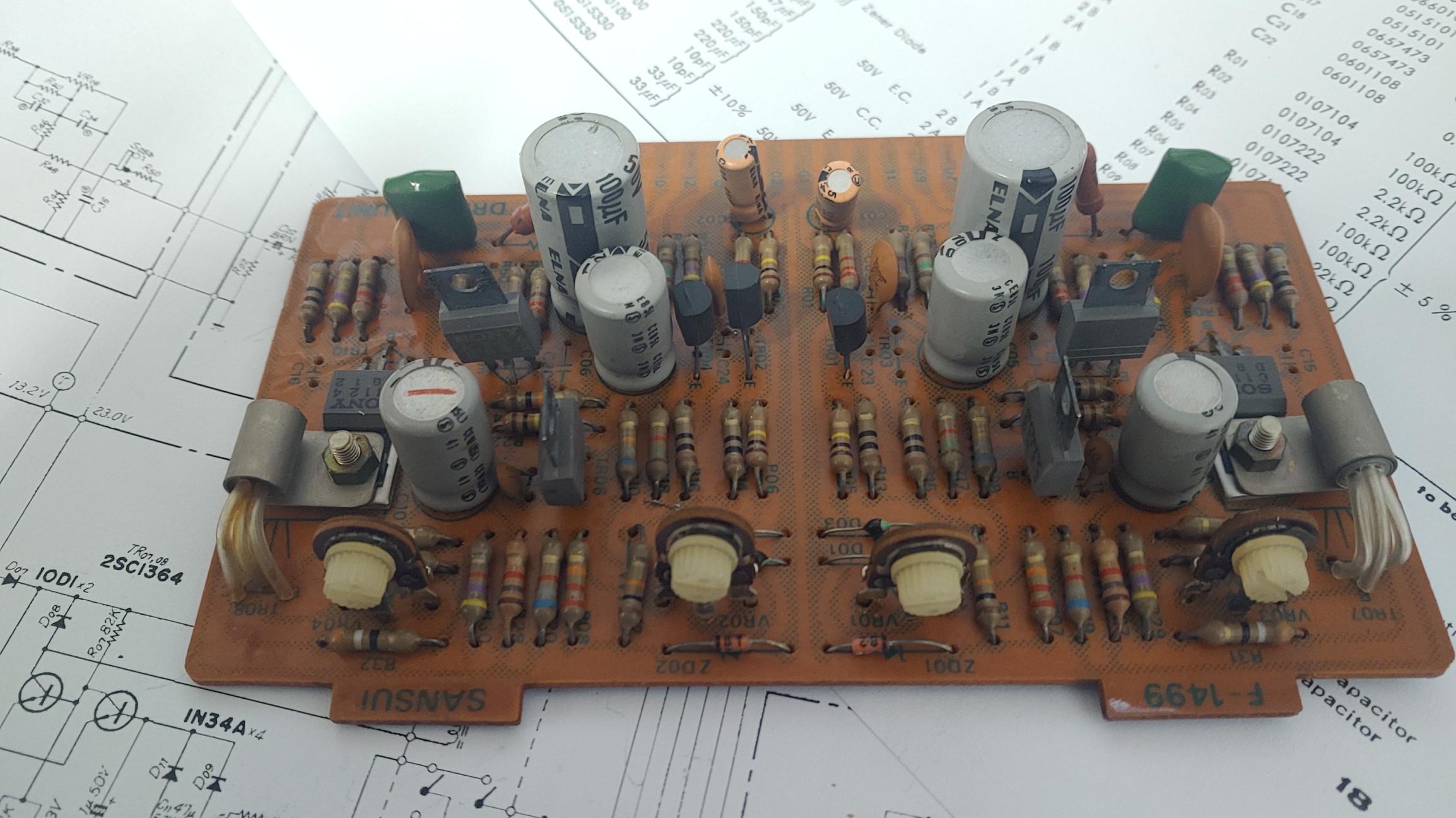 의심가는 전해 콘덴서 부터 모두 고급 니치콘 콘덴서로 교체 해도 마찬가지. 드라이버 트랜지스터를 하나씩 떼네어 체크 해 보니 밑의 2sc790 TR이 고장 난 것을 알고 갖고 있던 2SC970 이 거의 같은 특성을 갖고 있는 것을 알아 이를 교체 했더니 보호 릴레이가 딸깍 하는 소리와 함께 정상 동작 하는 것을 확인 하였다.