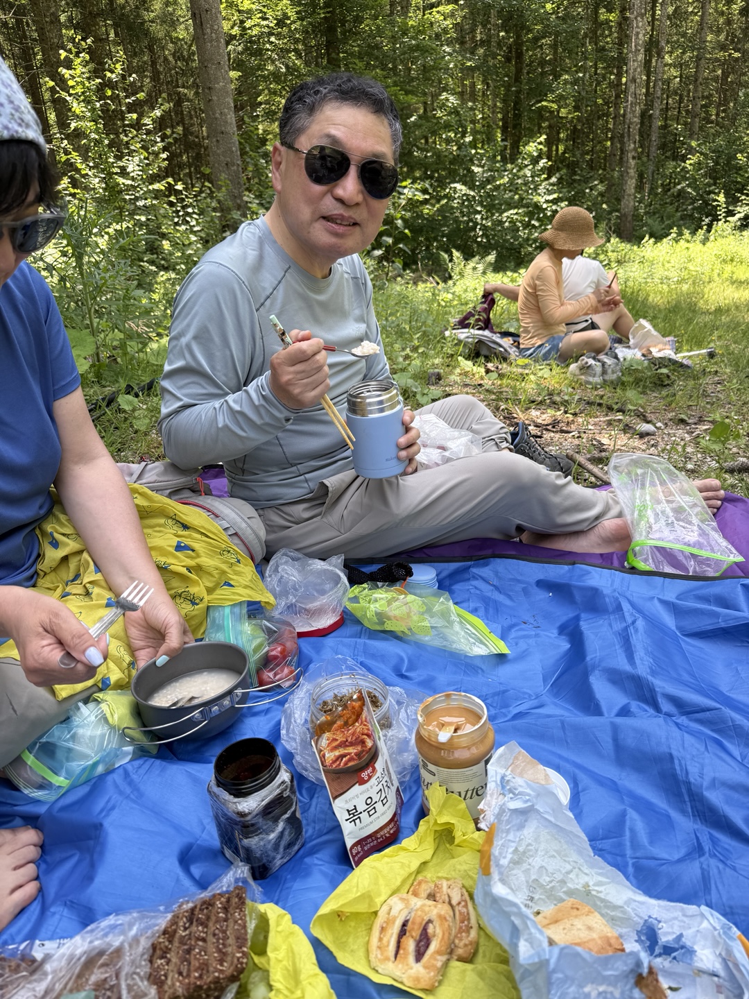 각자 싸가고 온 음식으로 점심 식사.나는 누른밥을 보온통에 불려서 볶음김치와 짱아찌 멸치볶음과 함께