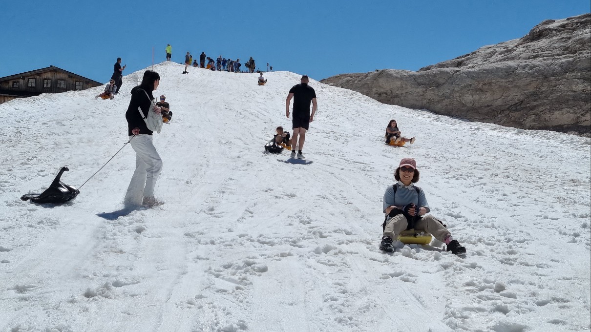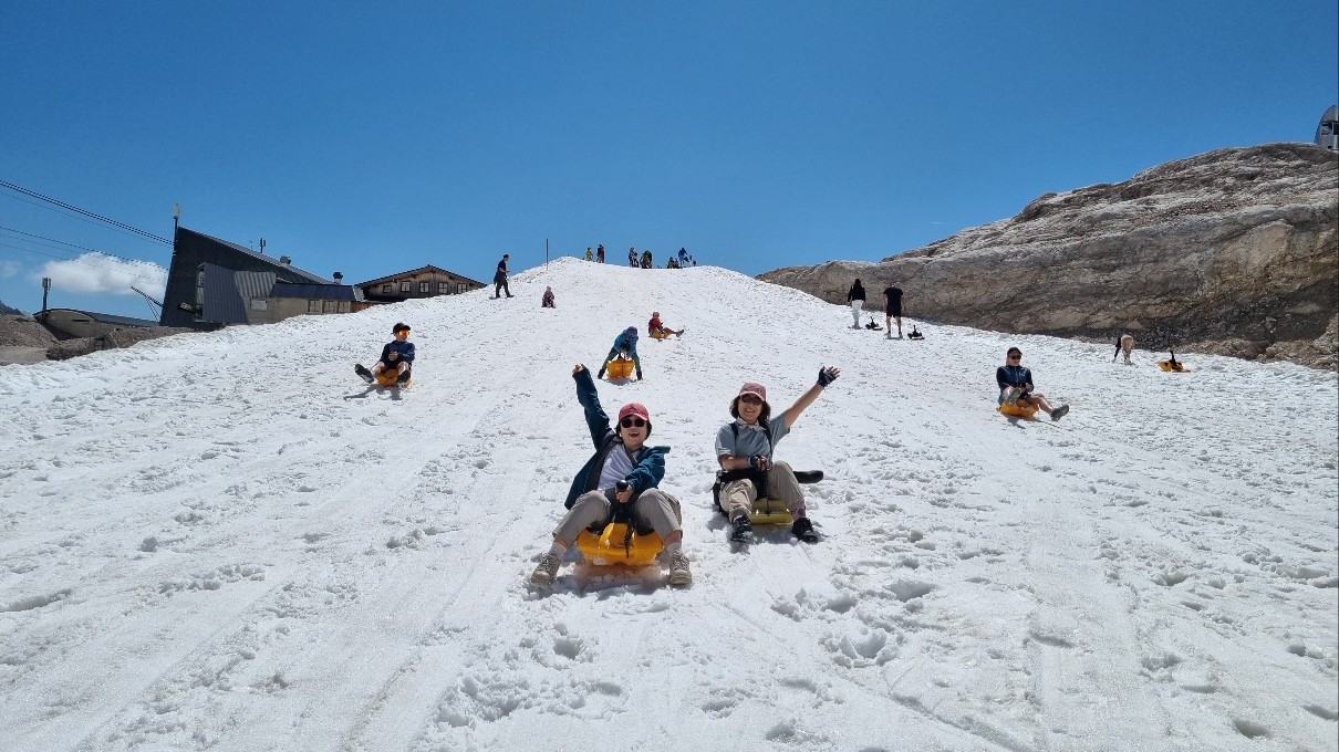 군데군데 얼음이 눈이 많이 남아있어 썰매를 탈 수가 있다. 플라스틱으로 된 눈썰매를 여러 개 비치해 놓아 자유롭게 때 탈 수 있게 한 배려가 돋보인다.
