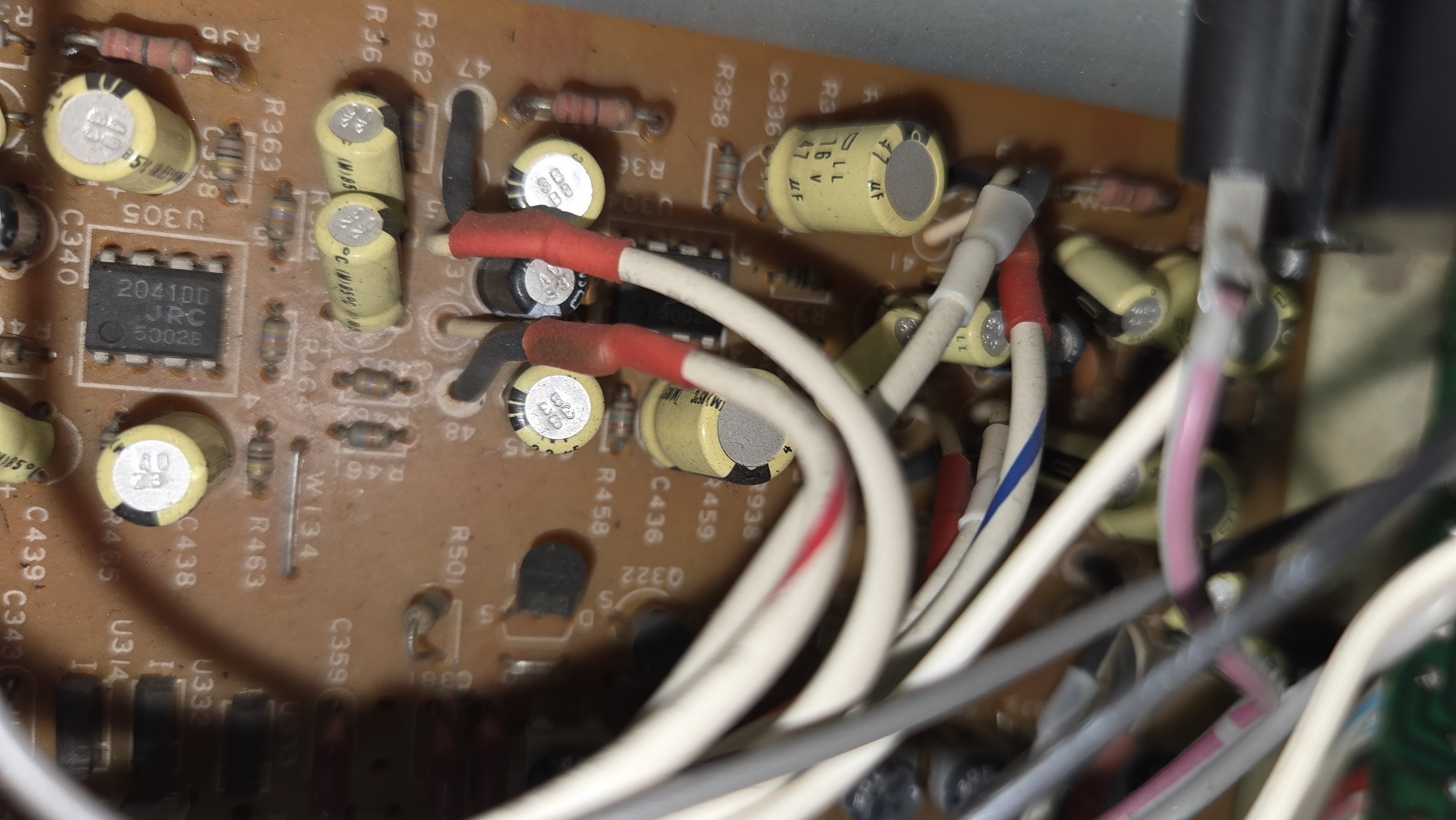 recapping 전의 오디오 회로 모습 연두색의 전해 콘덴서들이 low leakage 타입으로 커플링 용도로 사용되고 있었다.