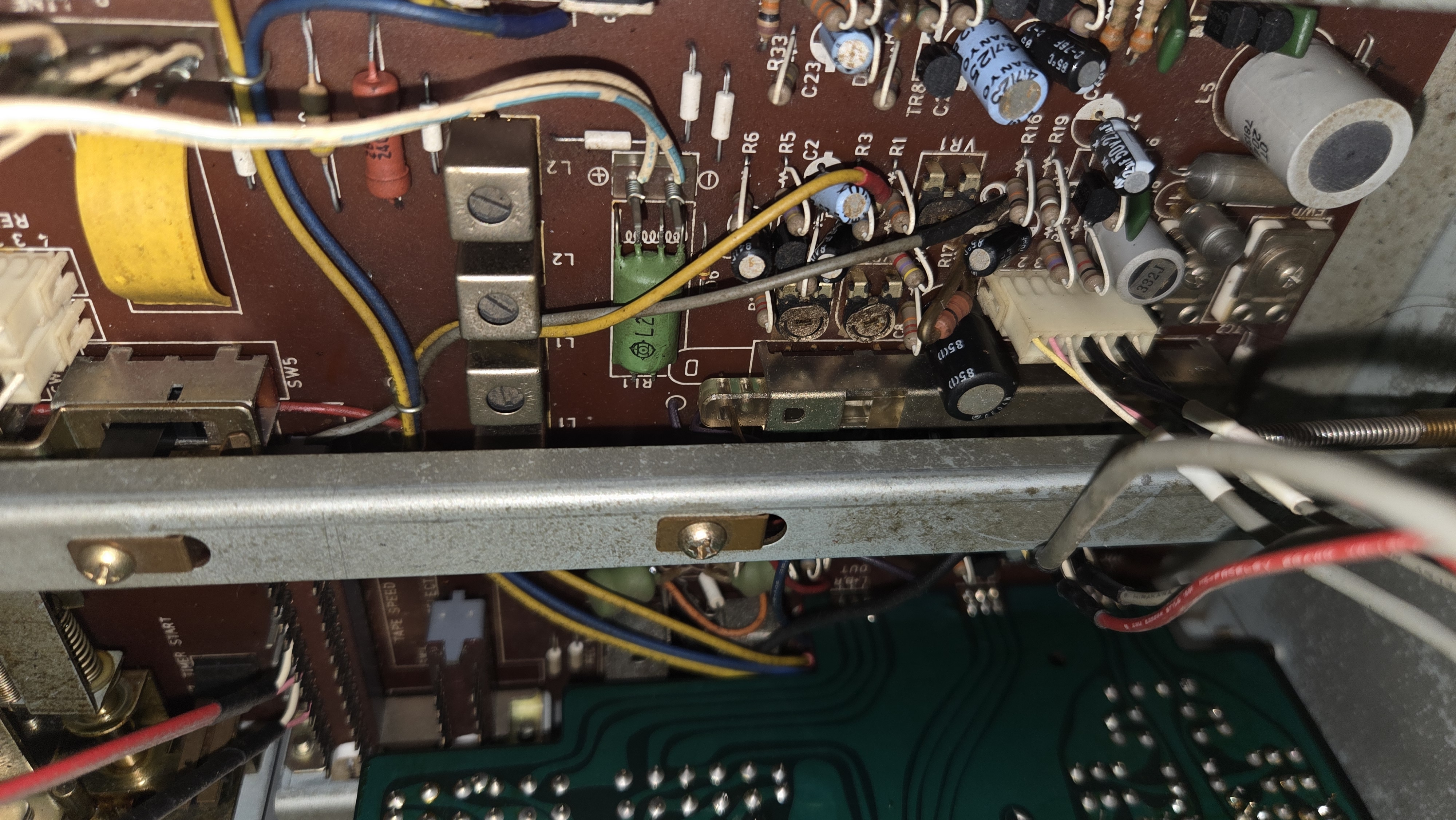 개조 전에 내부 회로 모습. 음질적으로 중요한 커플링 컨덴서를 대부분 일반 전해 콘덴서로 사용하고 있다