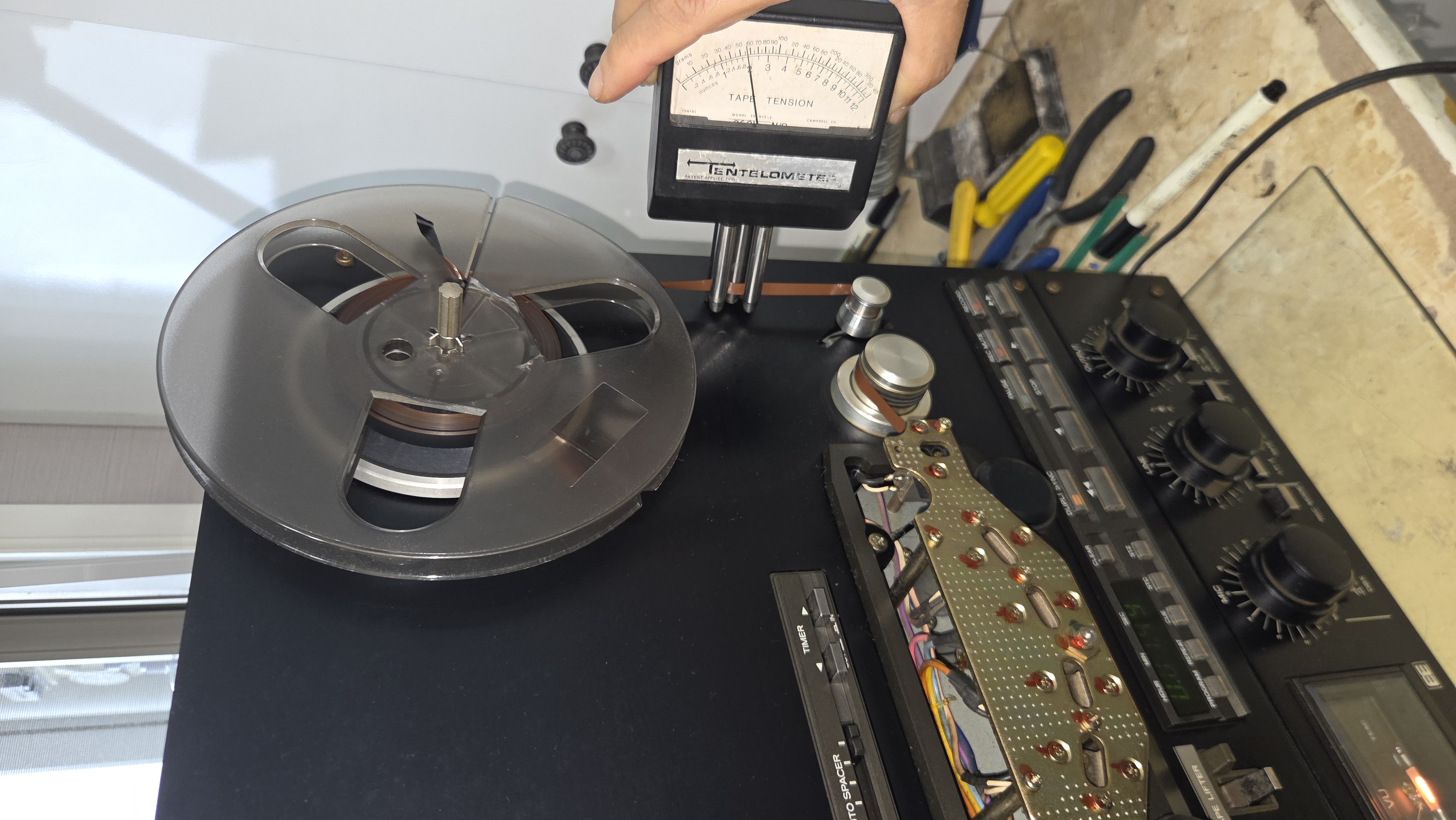 캡스턴 모터 벨트를 Ebay에서 구입하여 들어 오는데 2주 이상 걸렸다. 또한 그 동안 구하고자 하였던 Tentelometer도 손에 넣을 수 있어 밑의 사진과 같이 정확한 테이프의 Tension을 측정하여 조정할 수 있게 되었다.