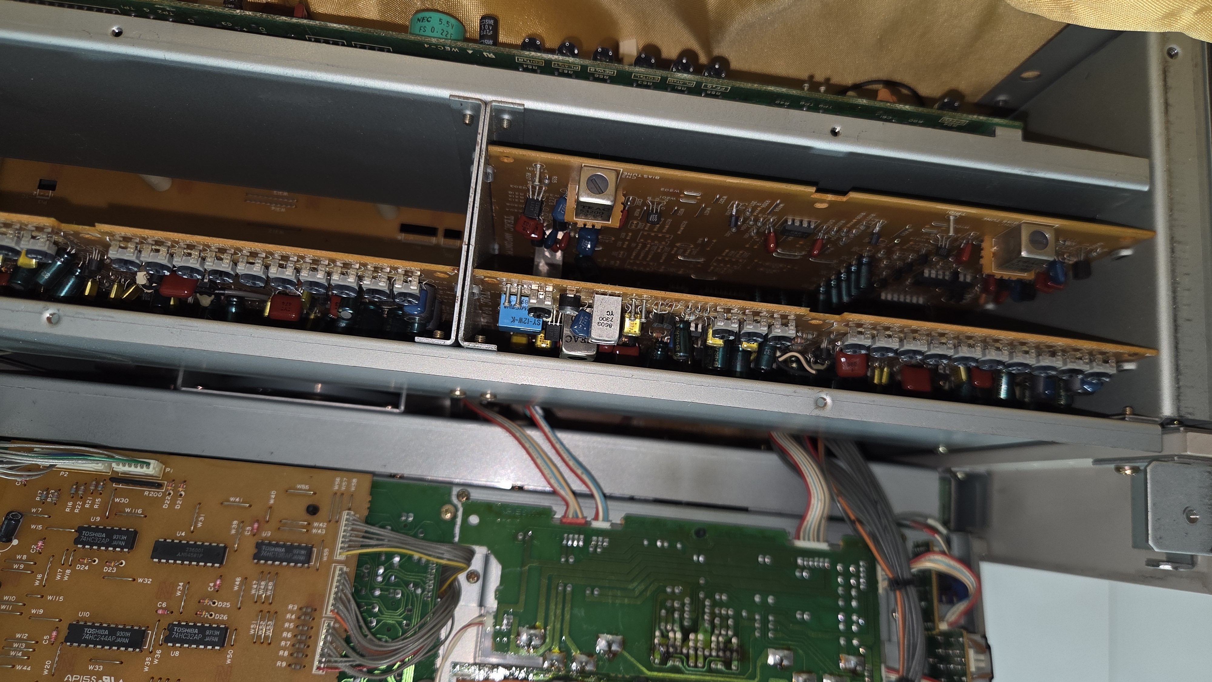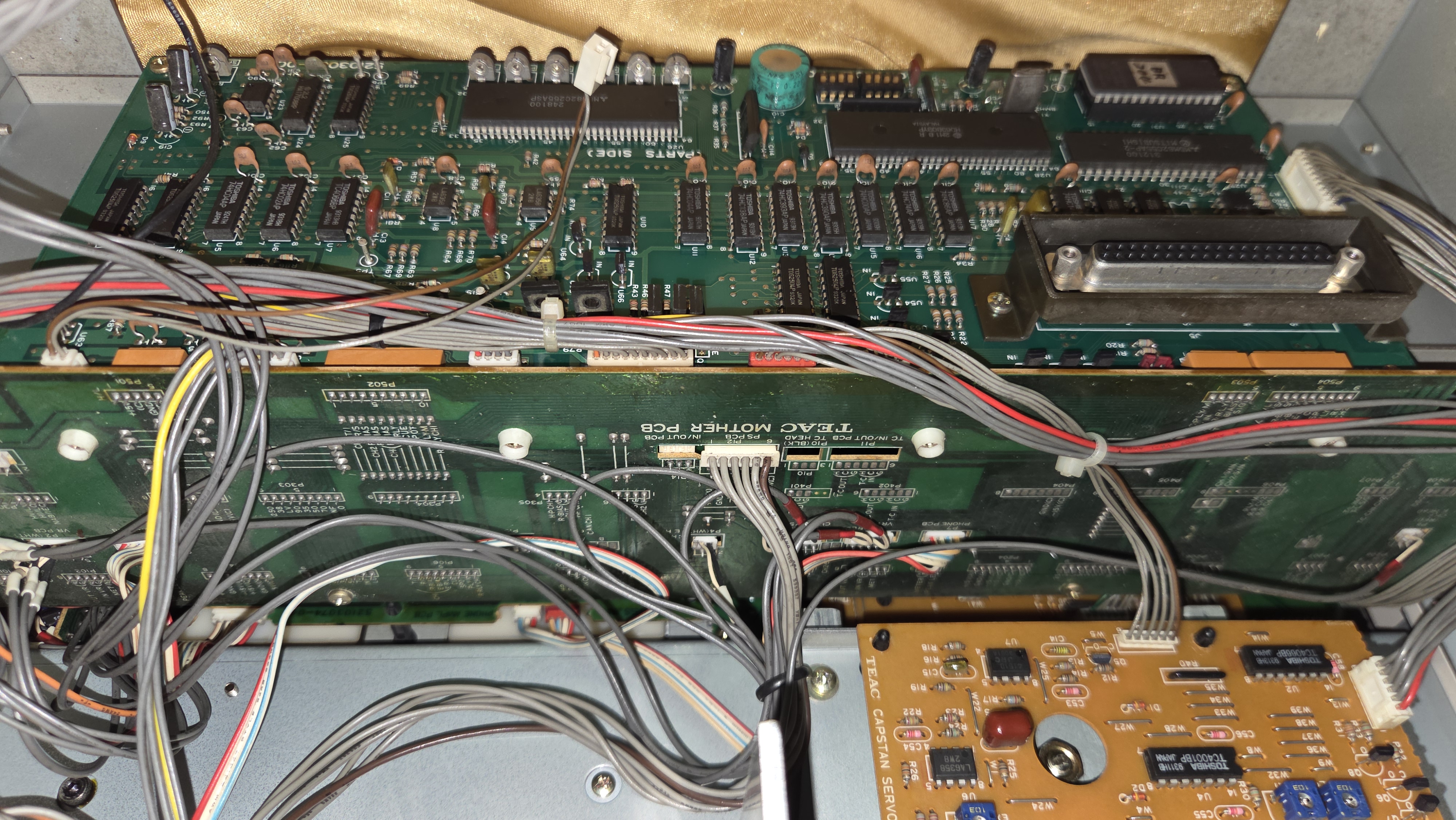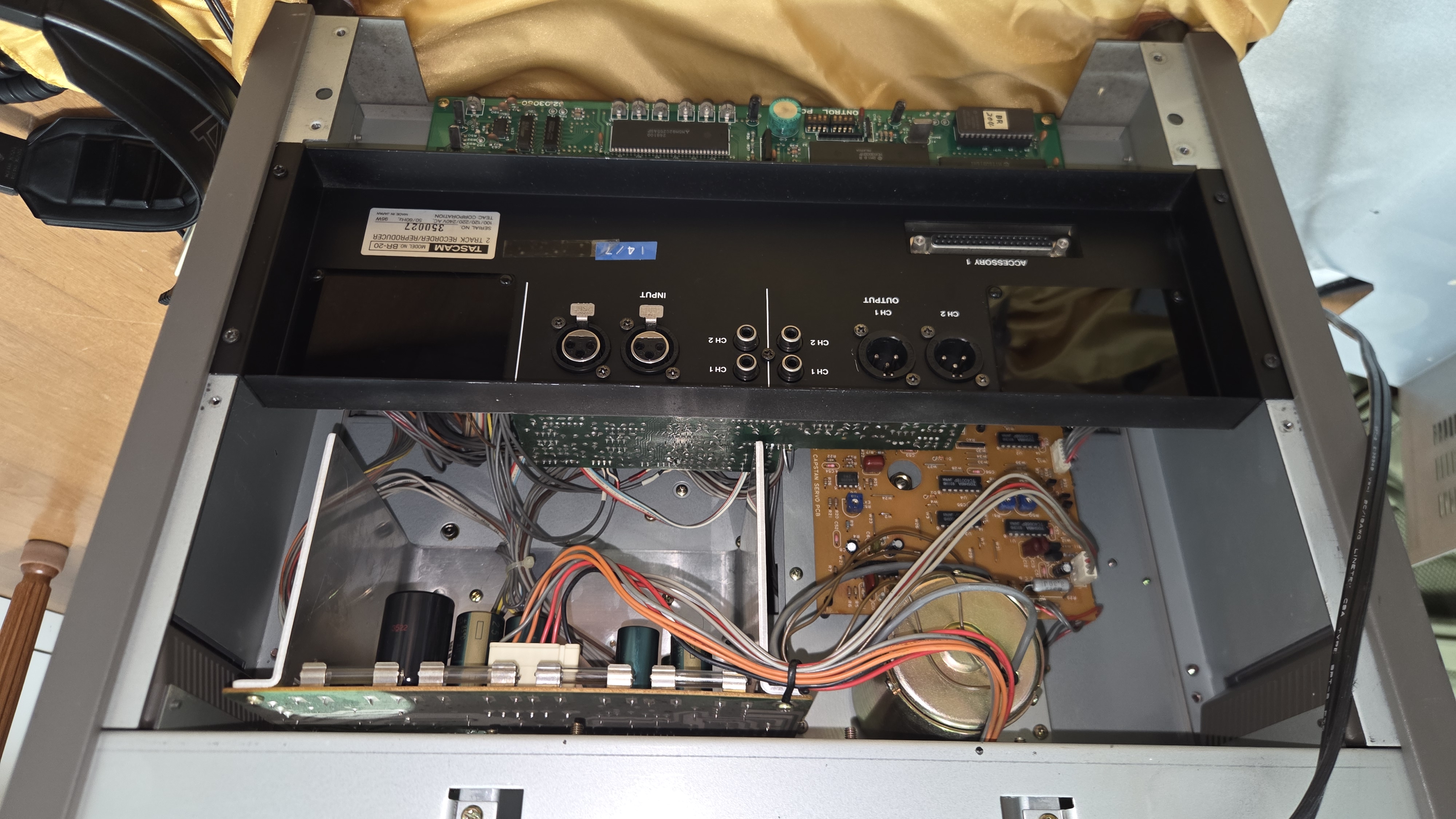 윗면 슬롯의 좌우에 재생 및 녹음 보드가 꼽혀있다. 그리고 앞면에 캘리브레이션을 위한 모든 반고정 저항 등이 달려 있어 작업이 쉽다.