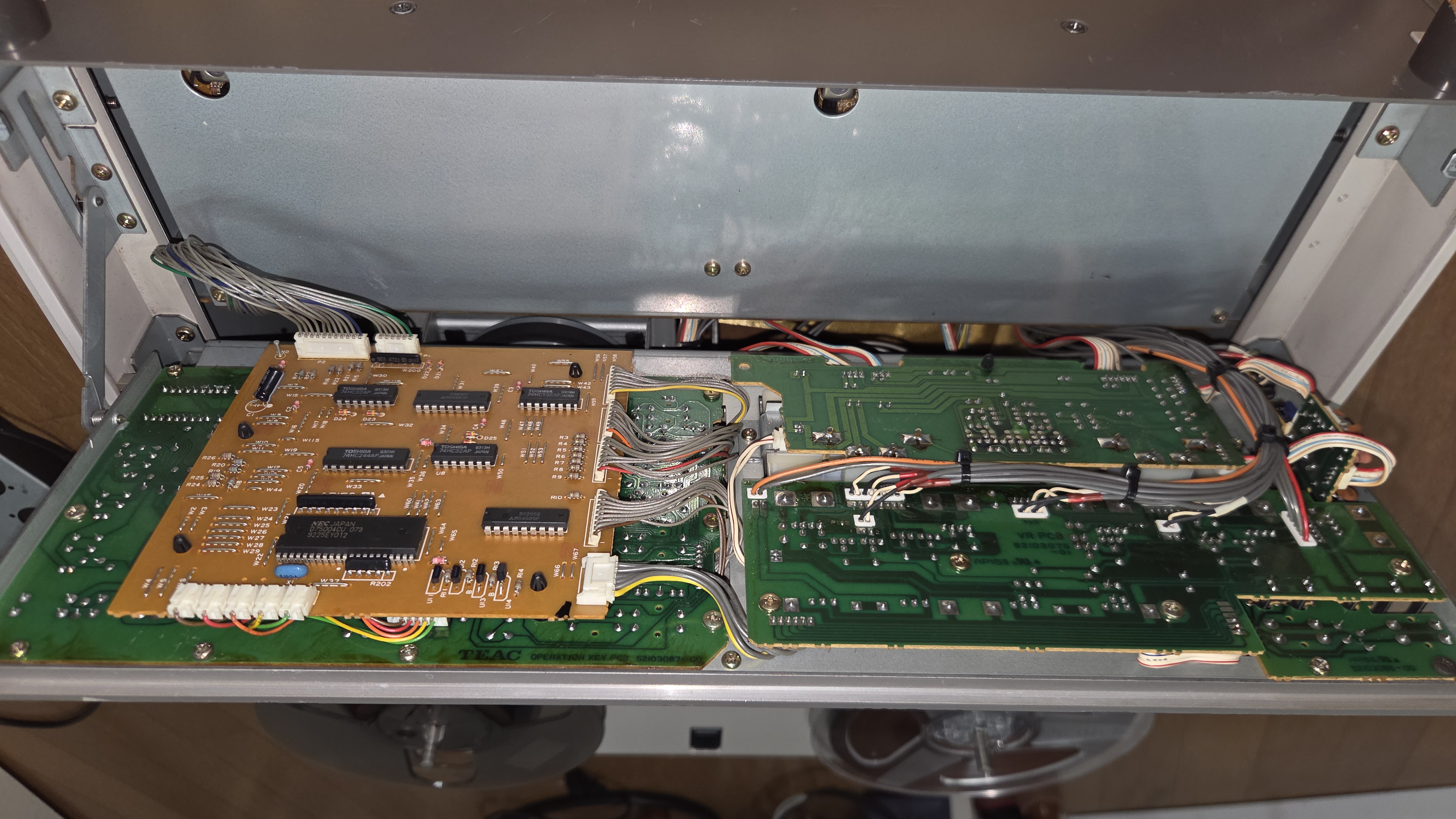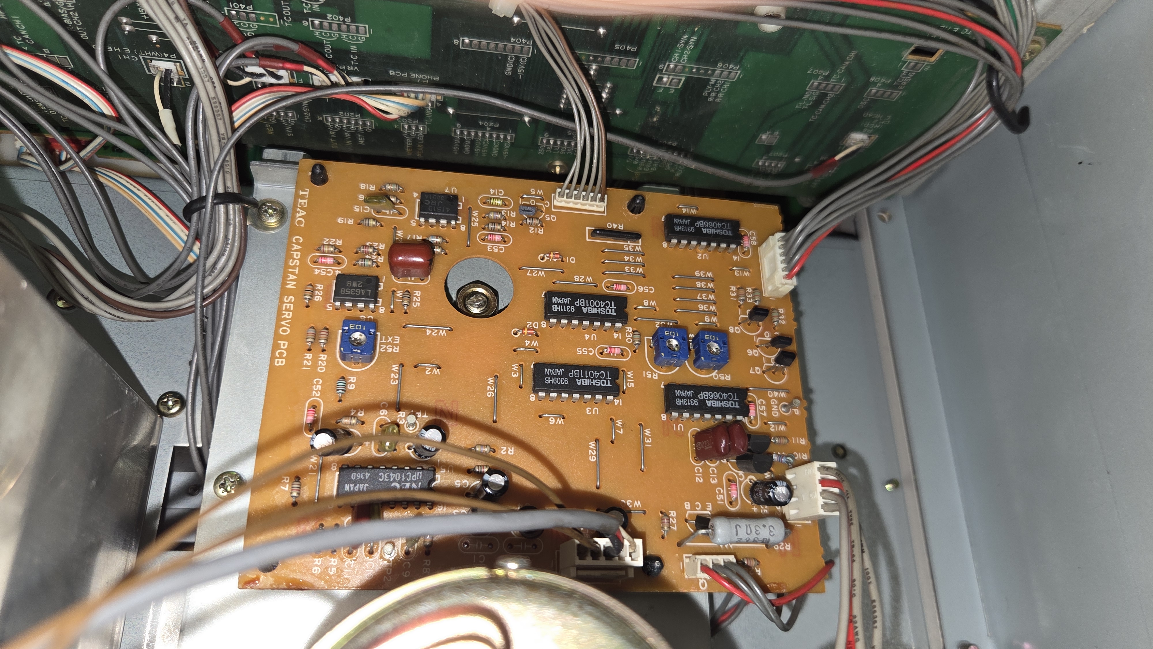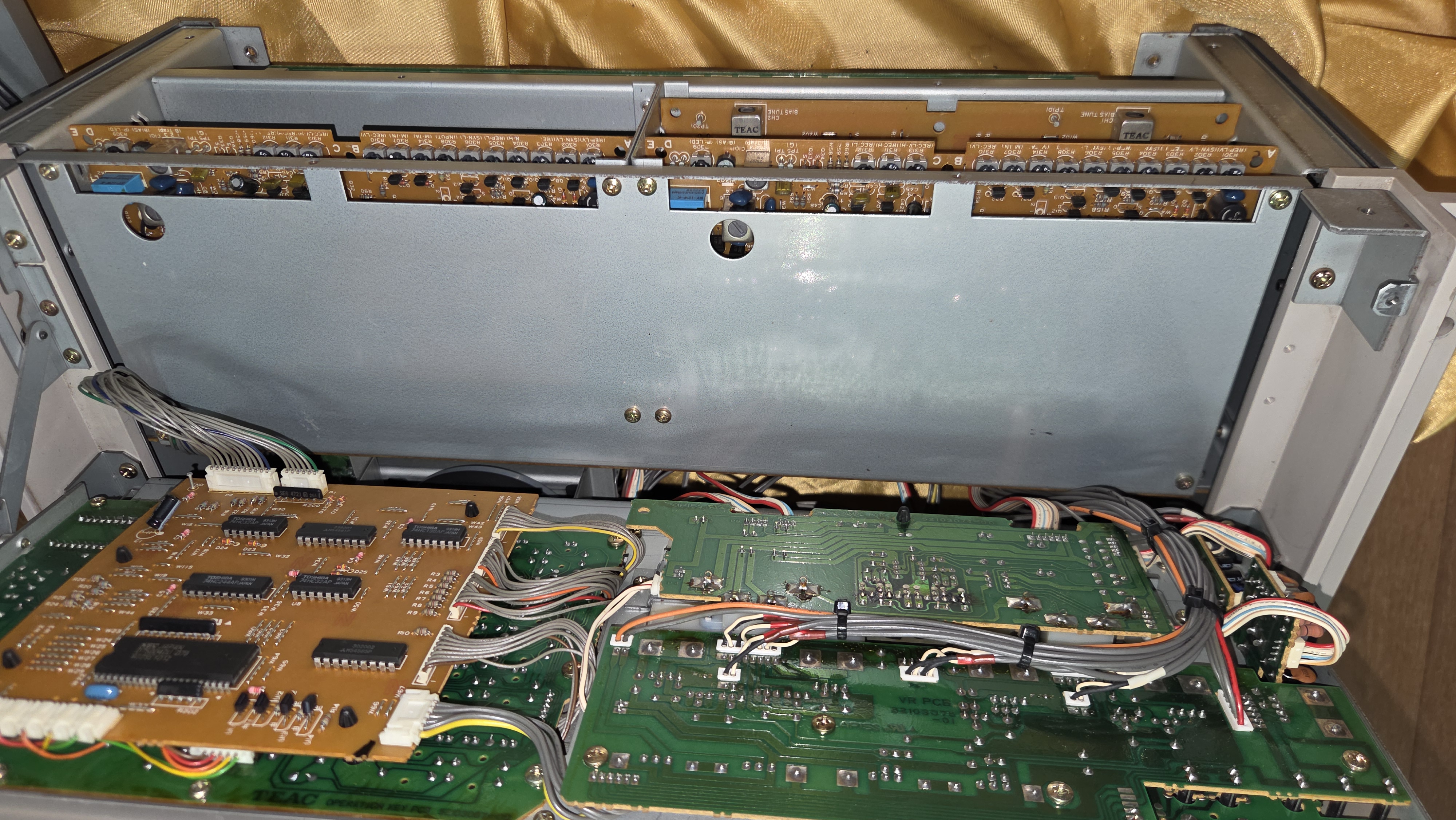 윗면 슬롯의 좌우에 재생 및 녹음 보드가 꼽혀있다. 그리고 앞면에 캘리브레이션을 위한 모든 반고정 저항 등이 달려 있어 작업이 쉽다.