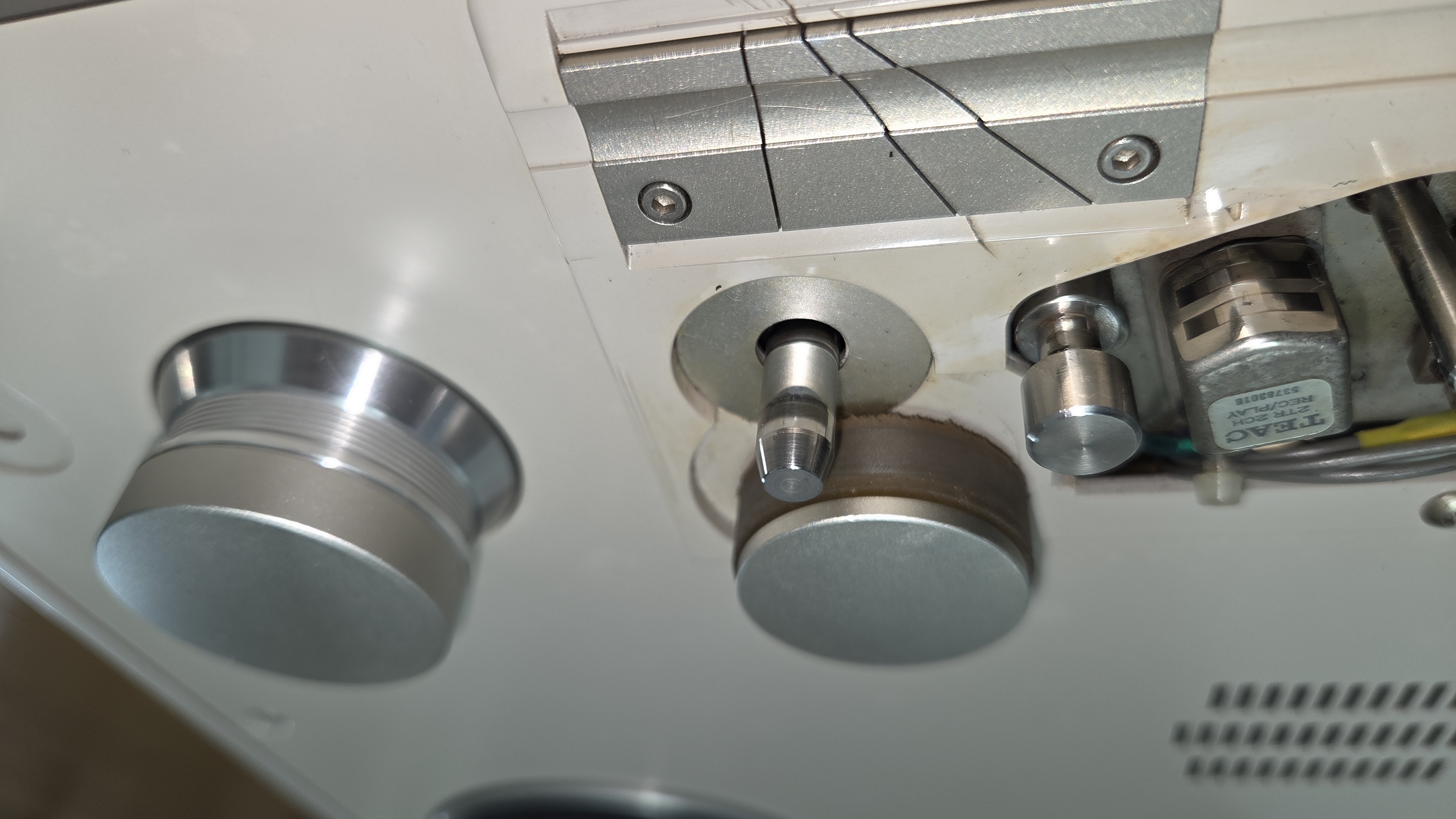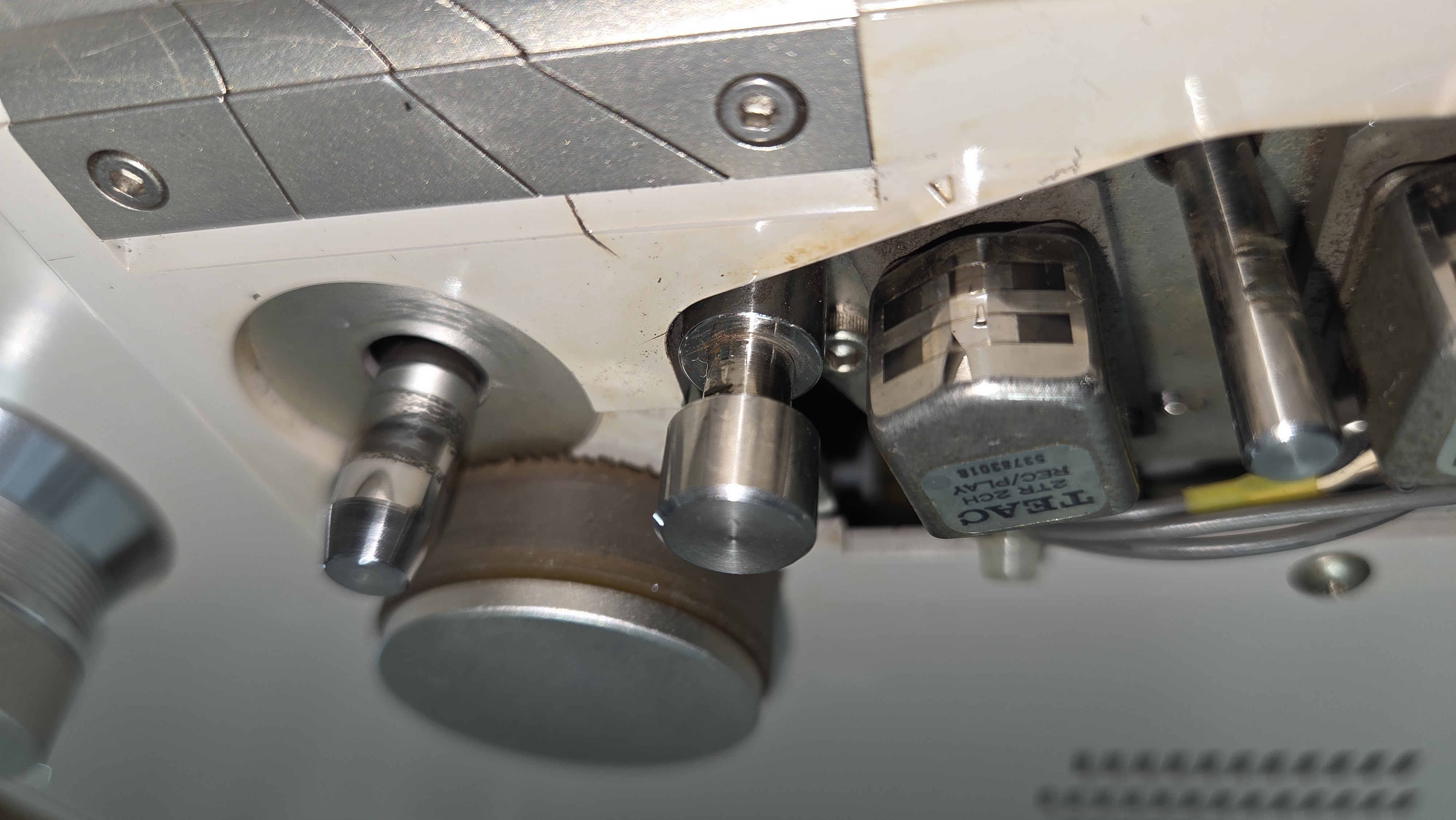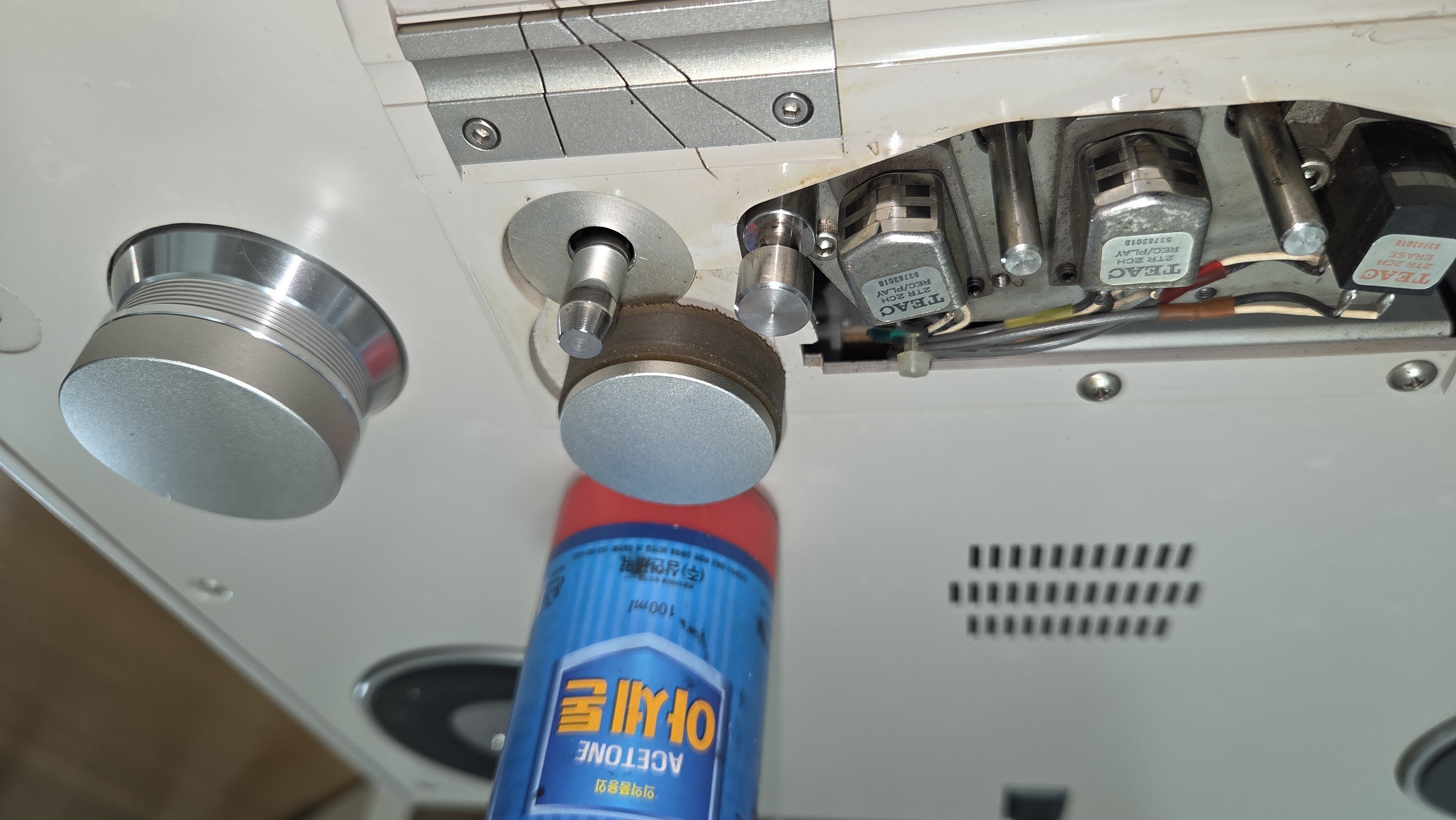 금속 부분은 아세톤으로 닦아 낸다. 캡스톤 모터 롤라와 가이드봉이 깨끗해져 있다.