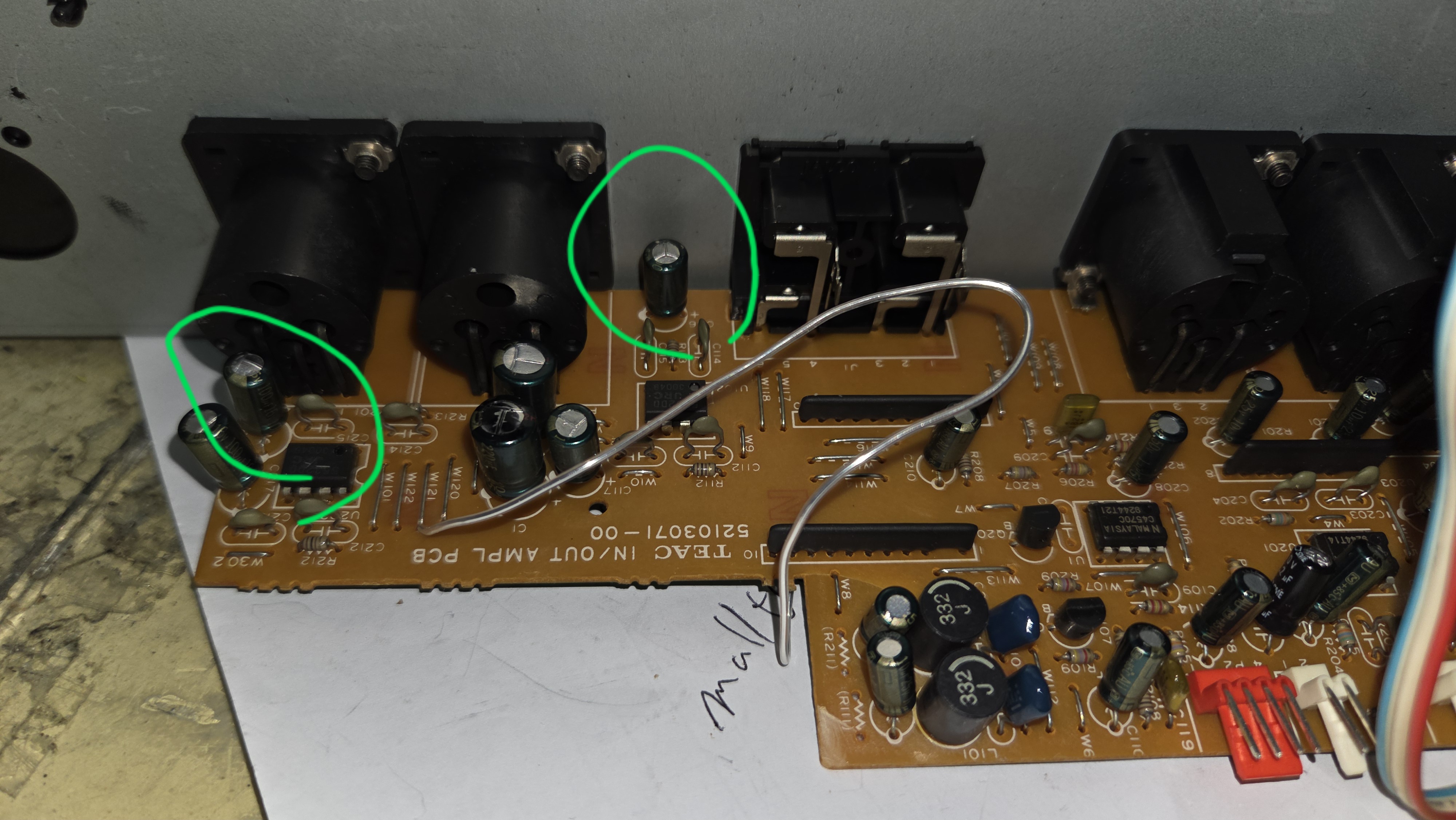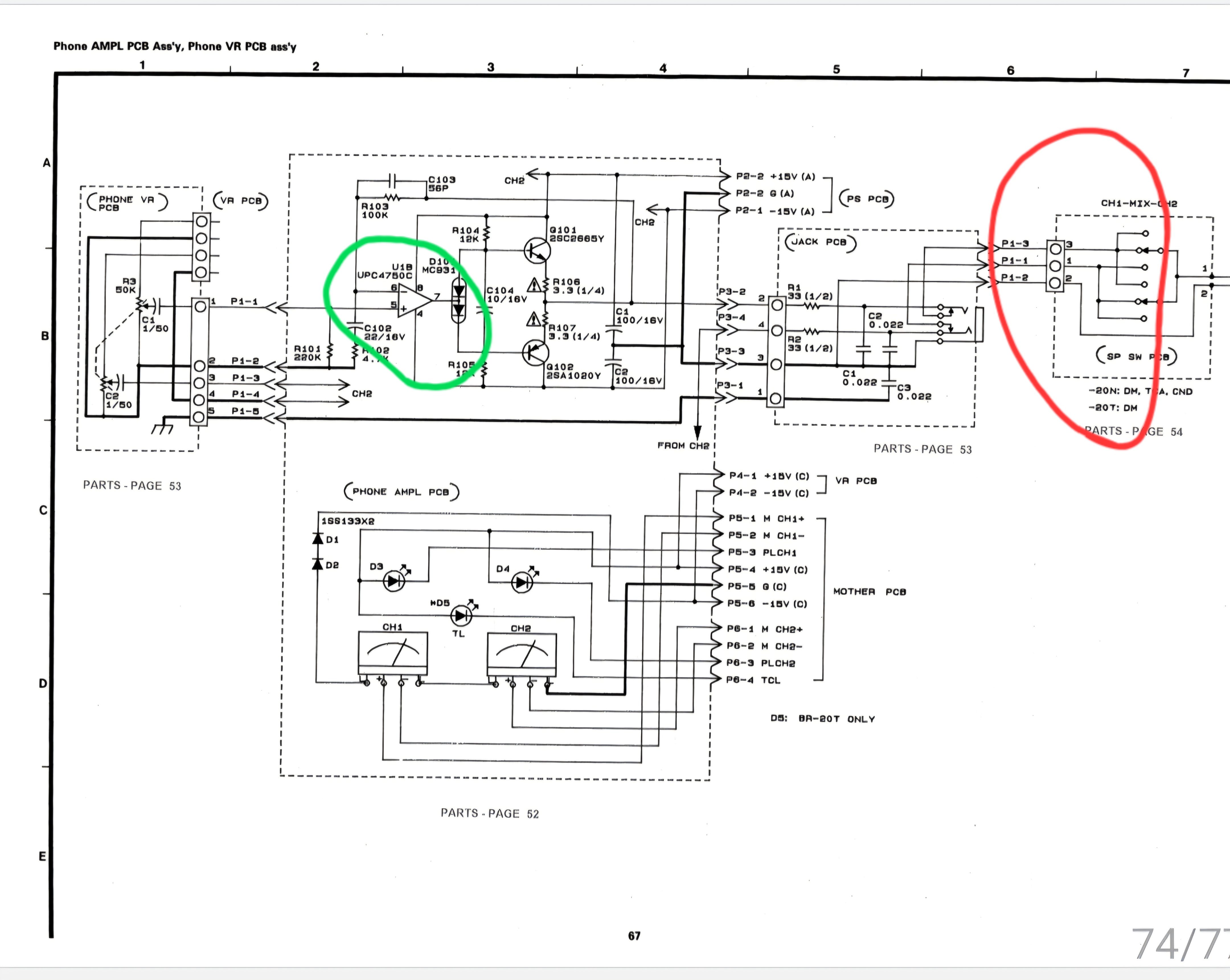 내장 스피커에서 소리가 나지 않고 핸드폰 단자에서 험잡음이 나오는 것을 고치기하기 위해서는 초록색 으로 표시한 op amp IC를 교체해야 하는데 이 phone amp 보드 자체가 vu meter와 결합되어서 떼내기 힘들어 결국 포기.