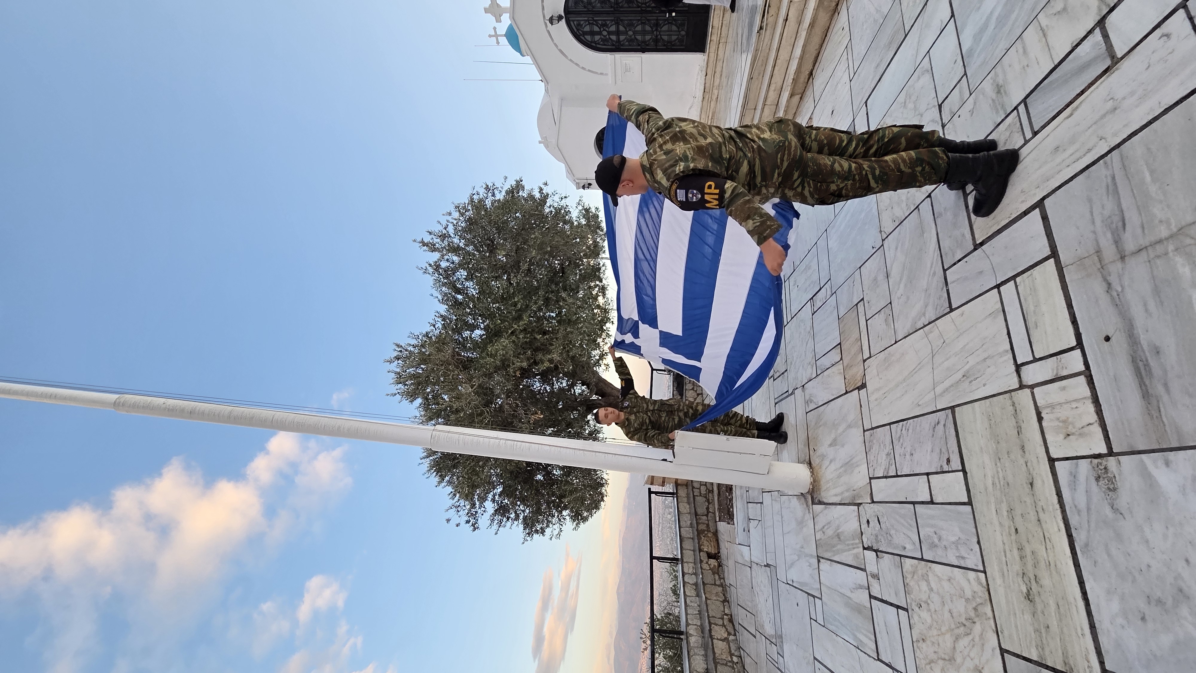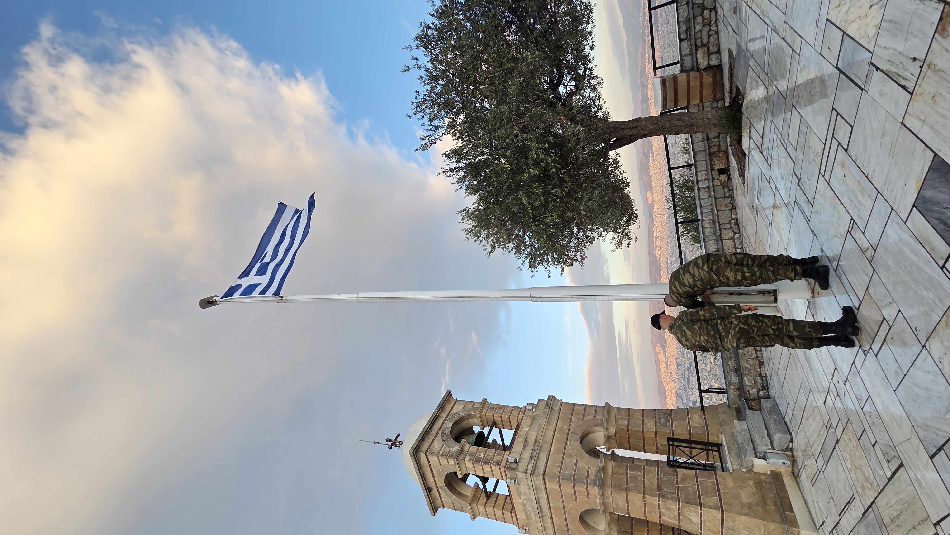 헌병 제복의 군인 2명이 아침 8시에 맞춰 그리스 국기를 계양한다