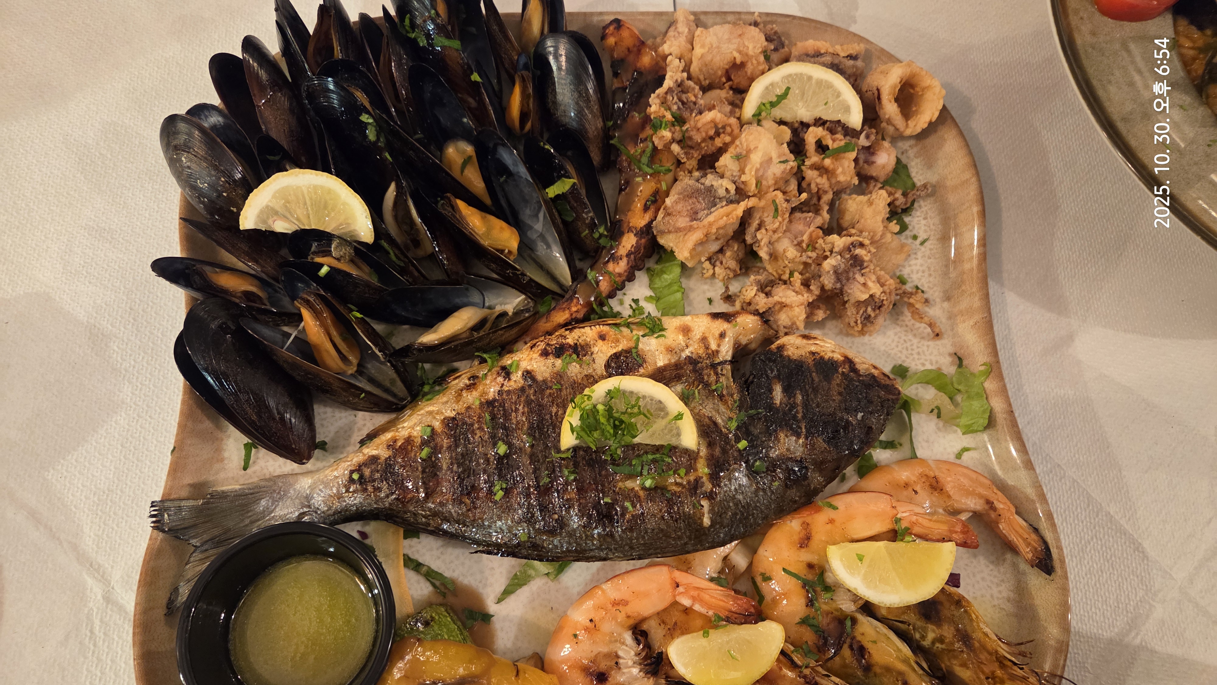 해산물 모듬 세트와 해산물 리조또로 저녁 식사