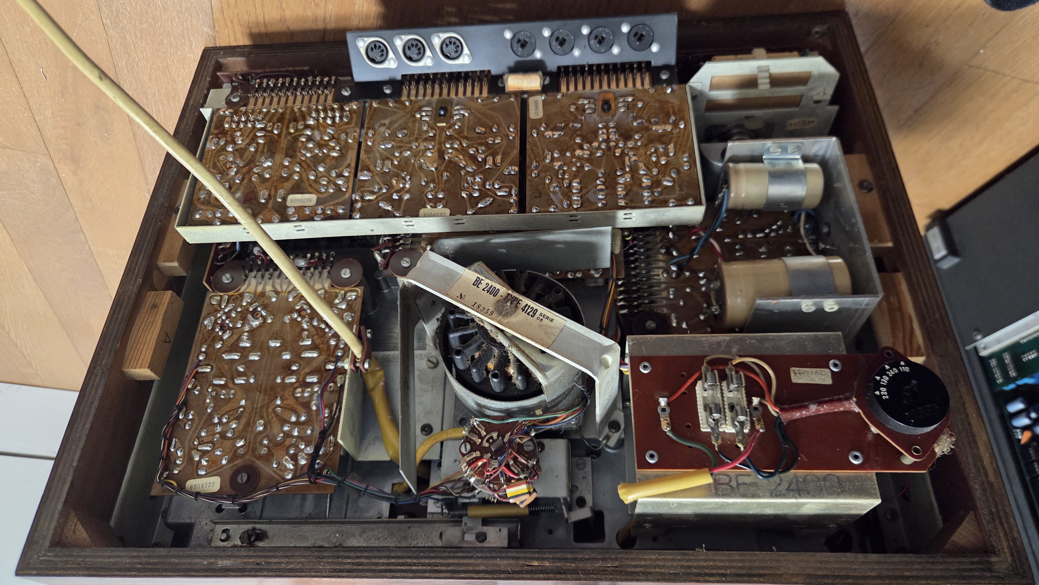 50Hz 용이라 수리 의미가 없지만 궁금해서 뒷면을 열어 보았다. 모듈식 PCB를 사용하고 있고 게르마늄 트랜지스터가 아닌 실리콘 트랜지스터, 특히 PNP 트랜지스터가 많이 사용 되고 있다.