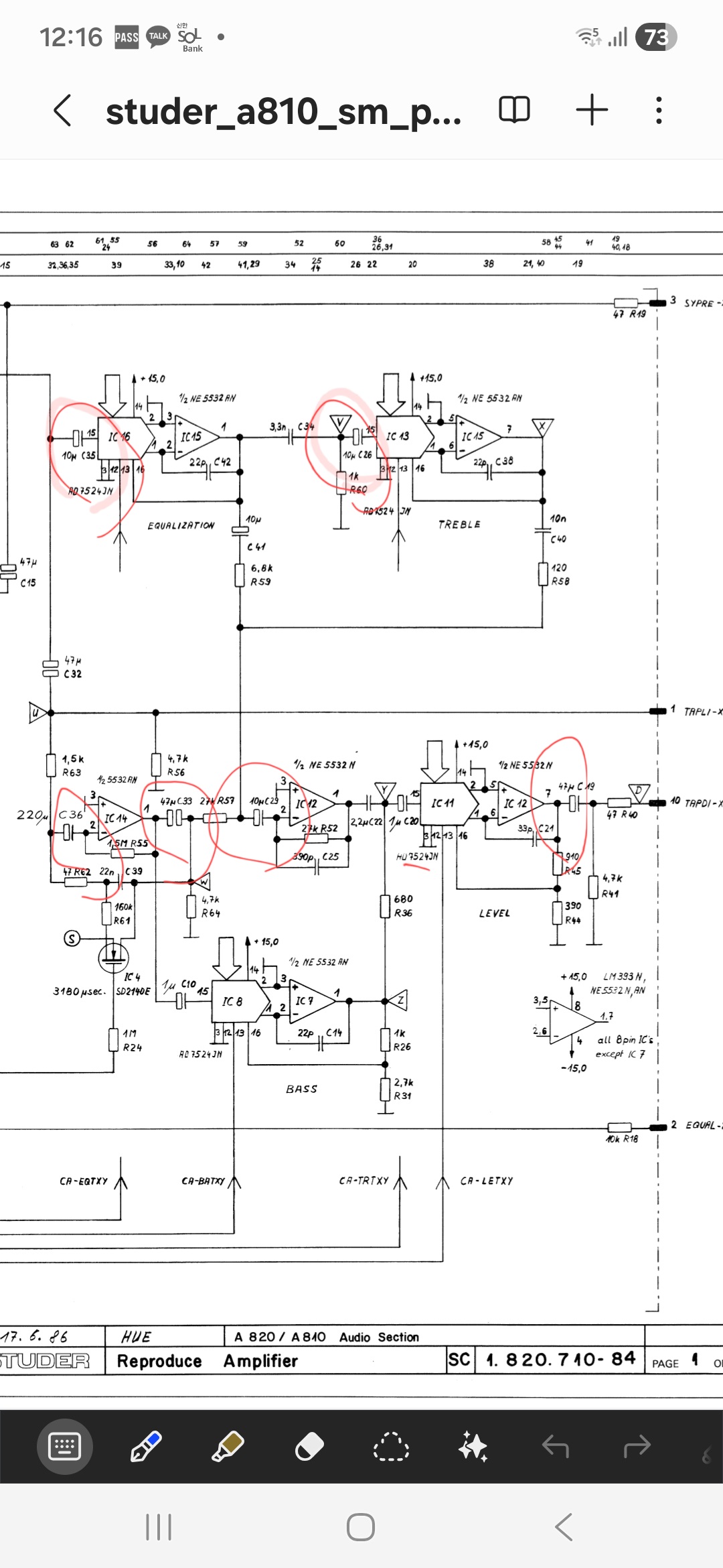일단 IC 소켓에 꼽혀 있는 NE5532op amp를 신품으로 교체 해 보았다. 같은 결과. 그러면 위 회로도에서 표시한 커플링 콘덴서 하나 또는 일부의 용량이 크게 감소 했다는 것으로 해석된다.