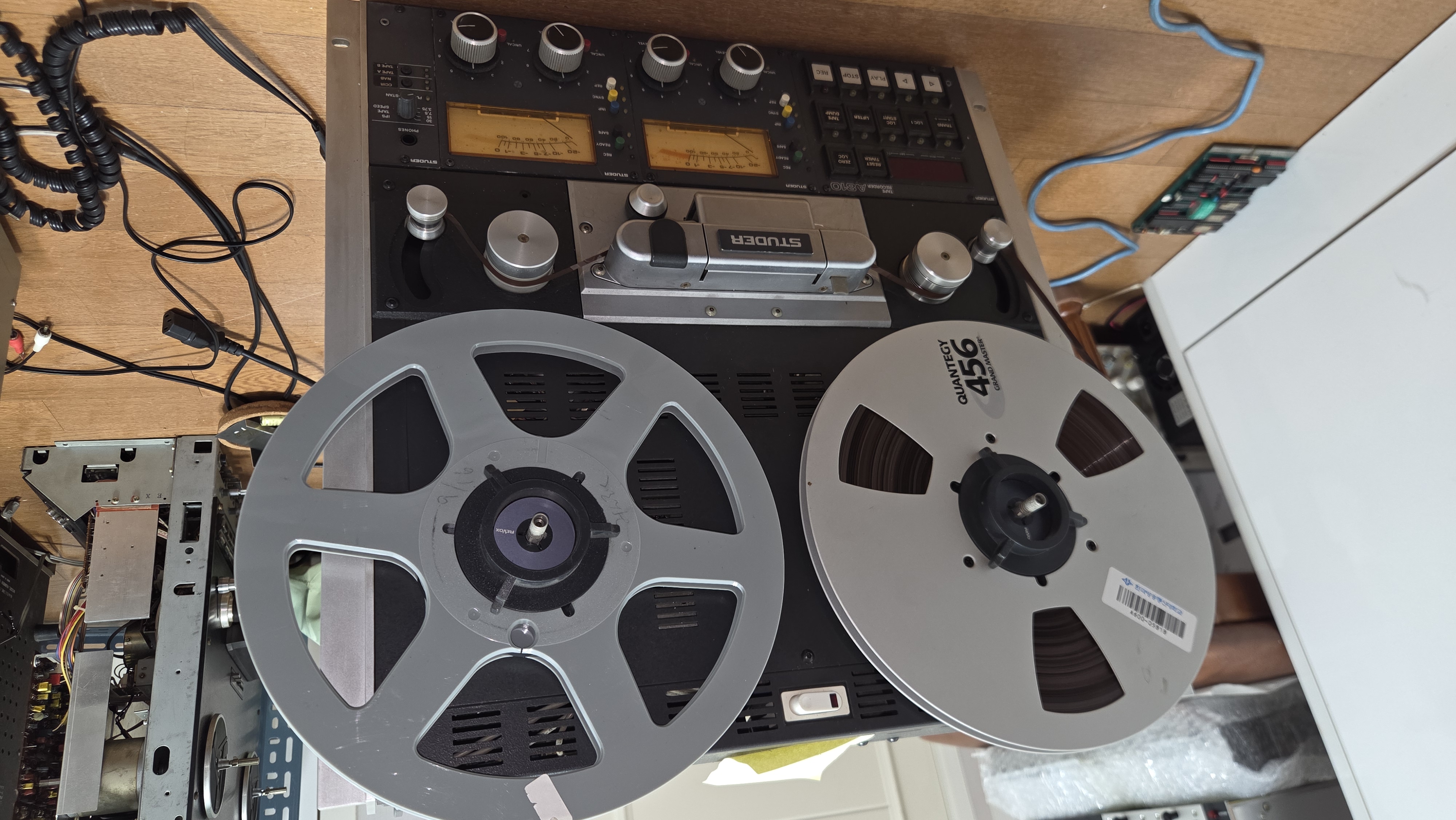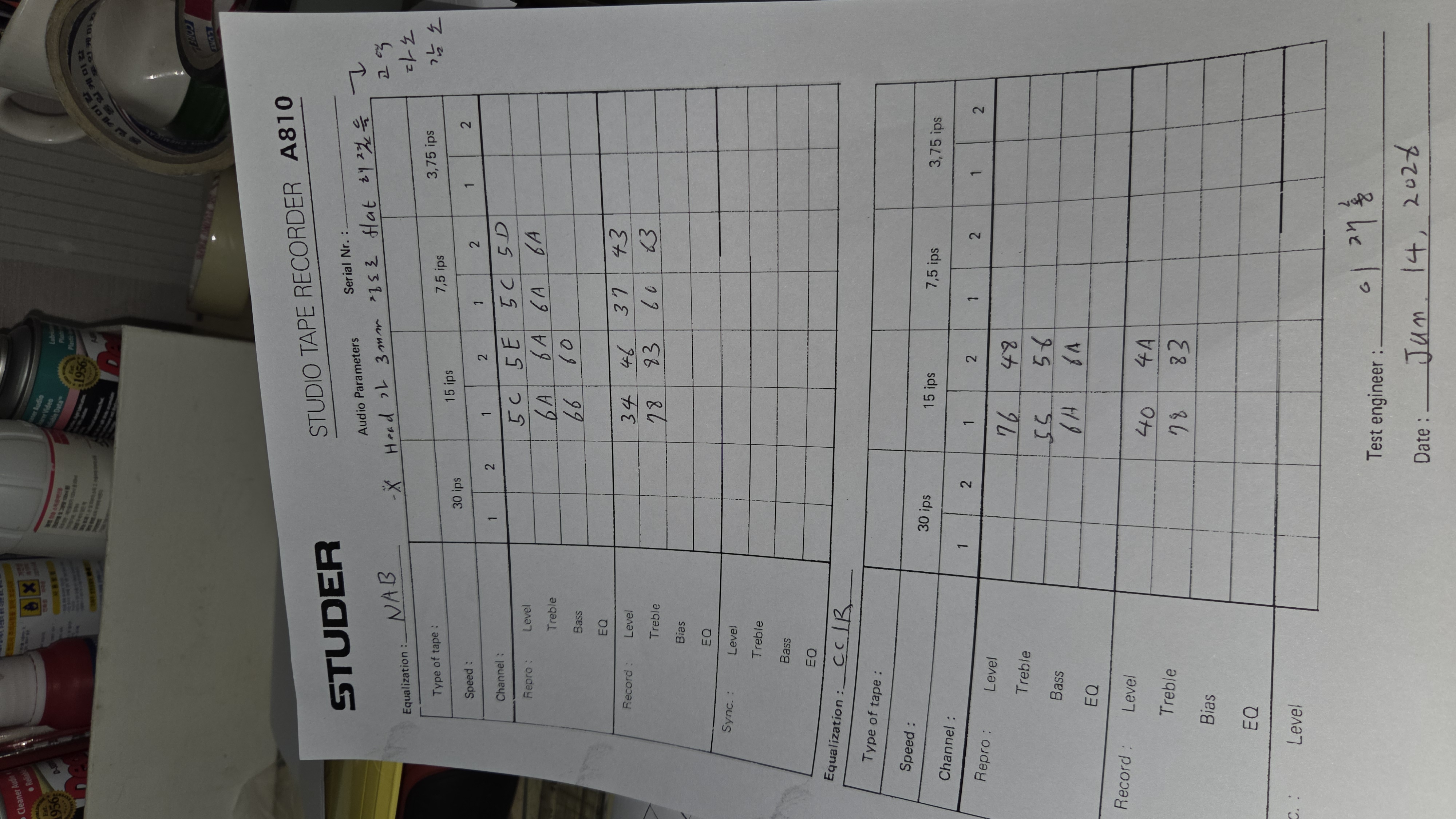 캘리브레이션 중. 15 ips로 NAB와 CCIR EQ를, 7 1/2 ips로 NAB EQ에 대한 재생및 녹음 캘리브레이션을 해야 하기 때문에 캘리브레이션 시간만 2 시간 이상 소요된다.