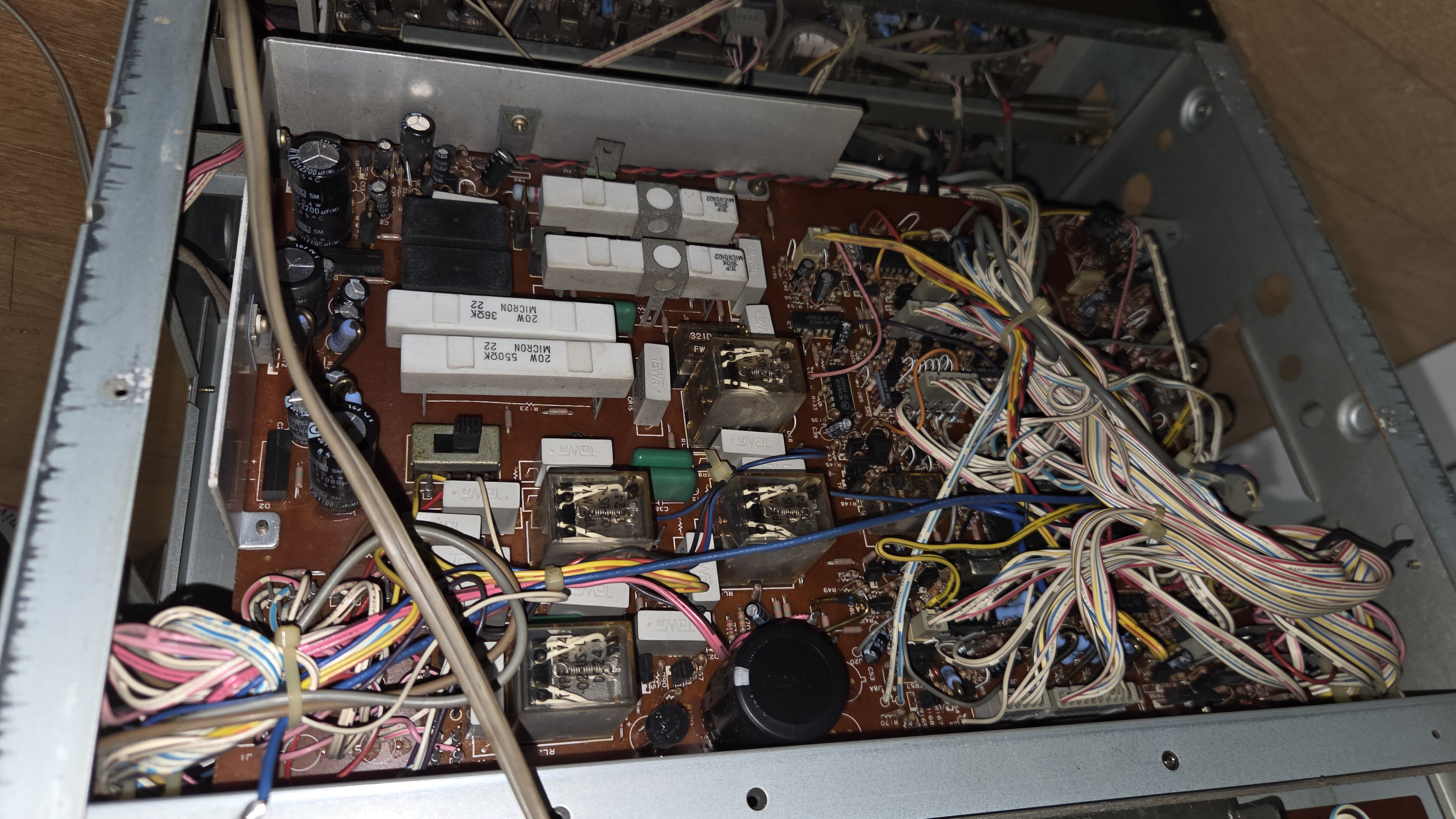 오디오 증폭부의 원래 모습. 약 35년 이상의 세월이 흘러 먼지가 많이 쌓여 있다. 오래 된 전해 콘덴서와 반고정 저항을 교체 해야 한다.